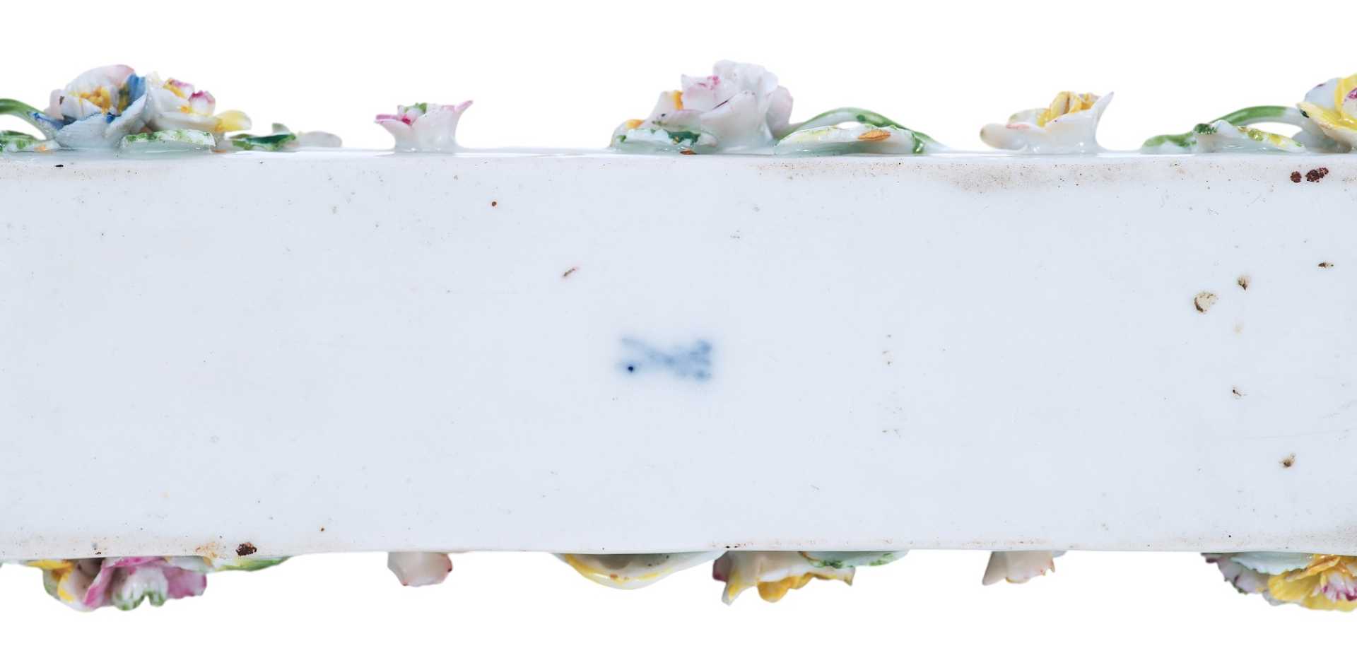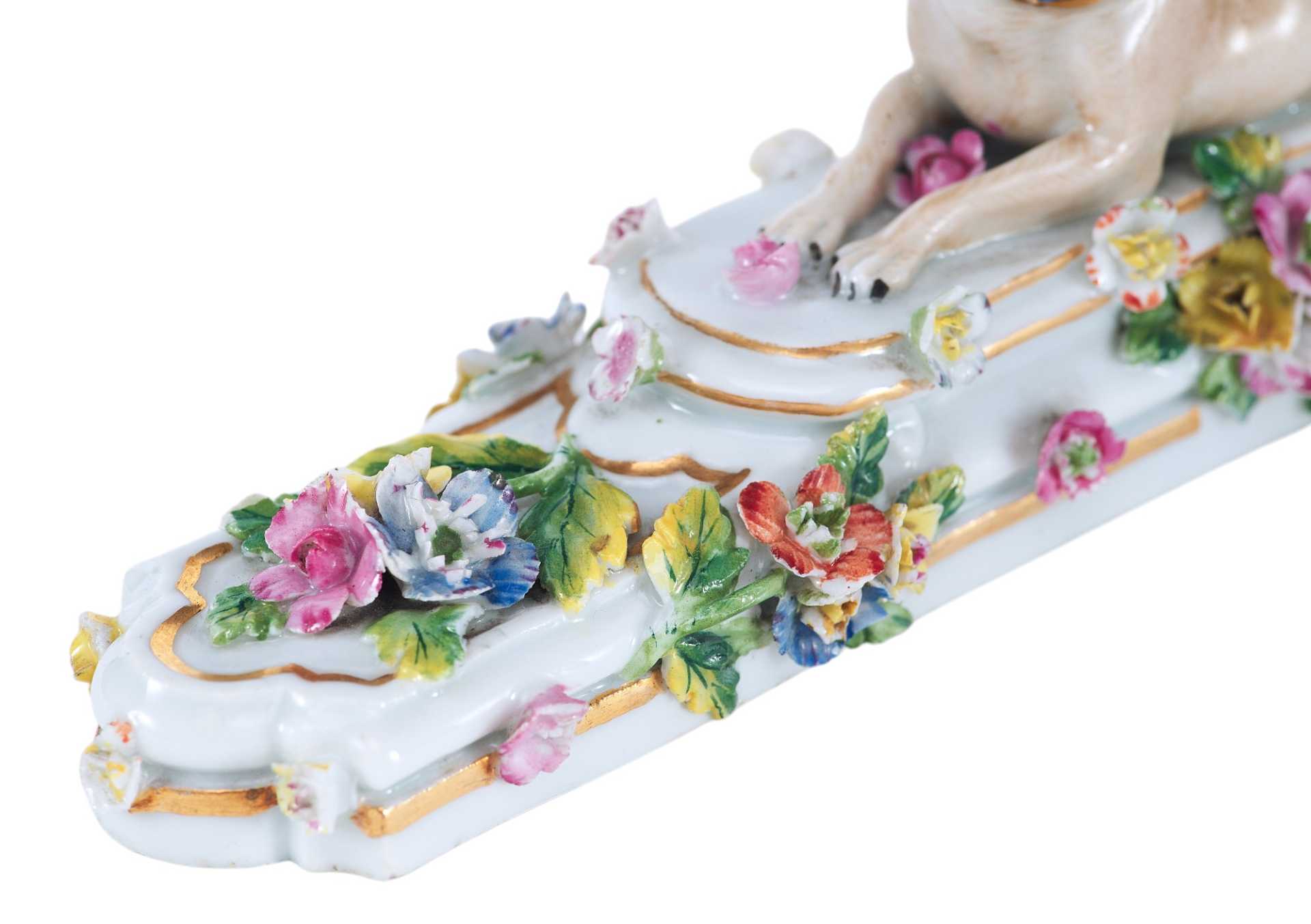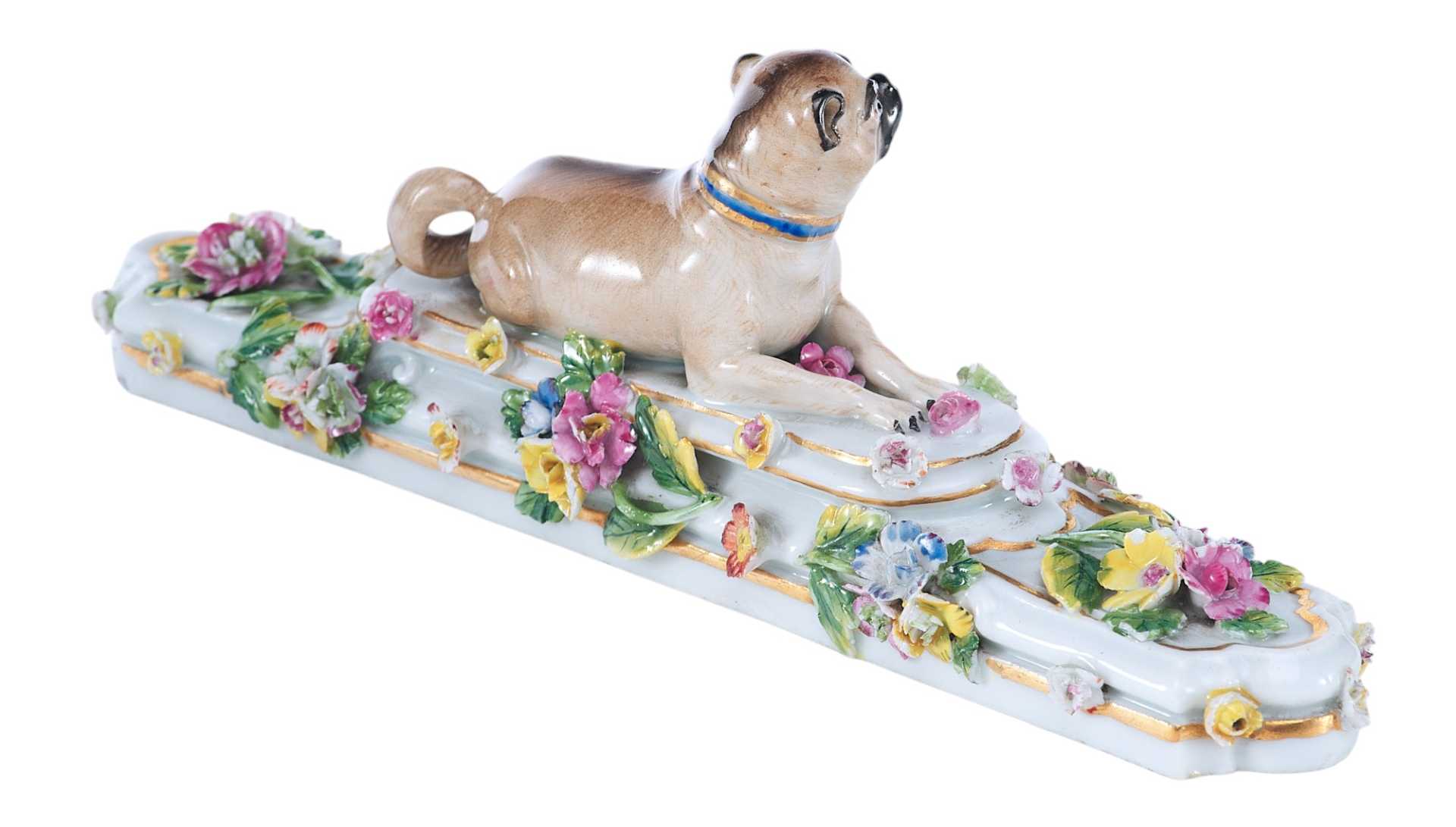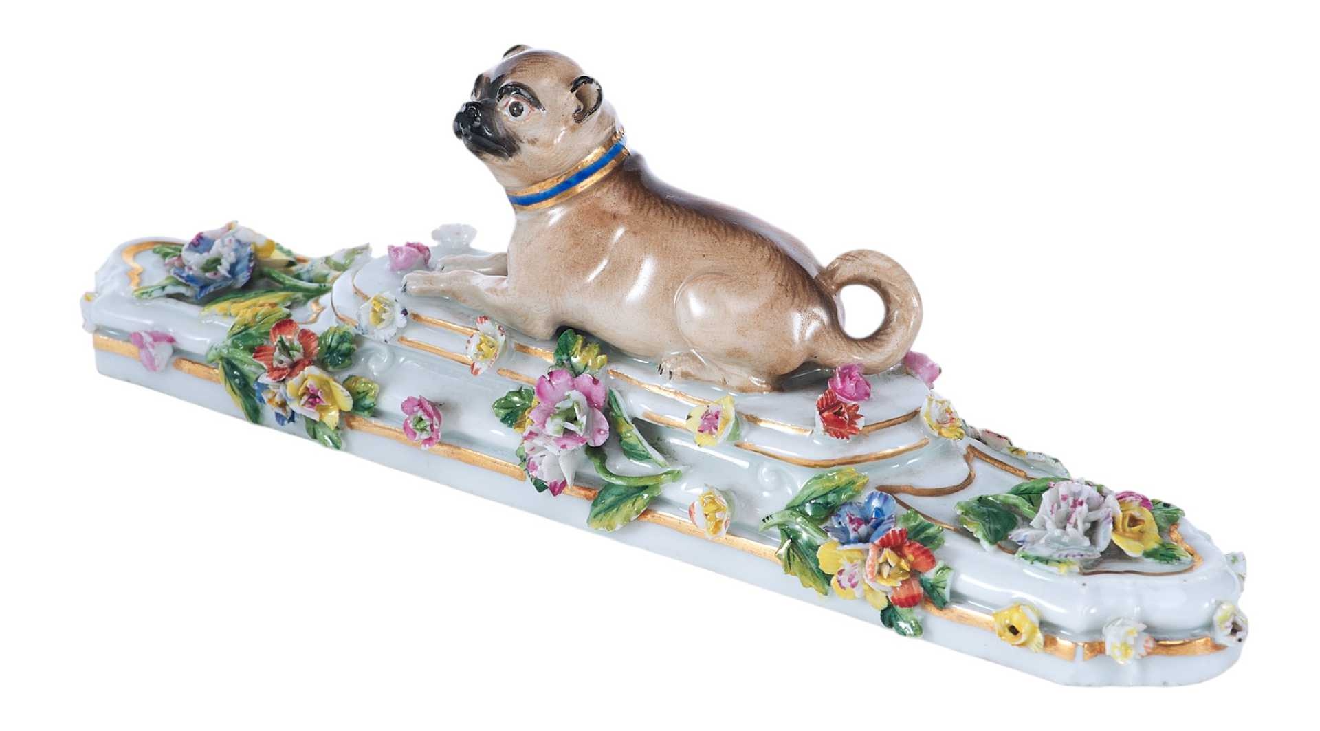 Представлена фарфоровая скульптура в виде мопса лежащего на постаменте, украшенном цветами В целом художественное