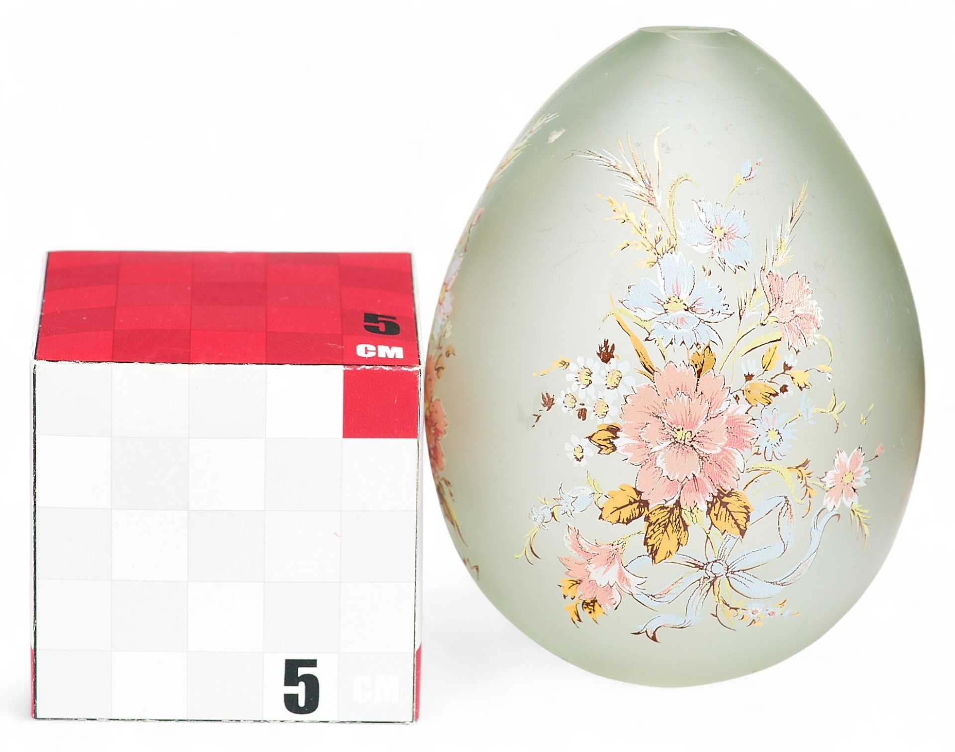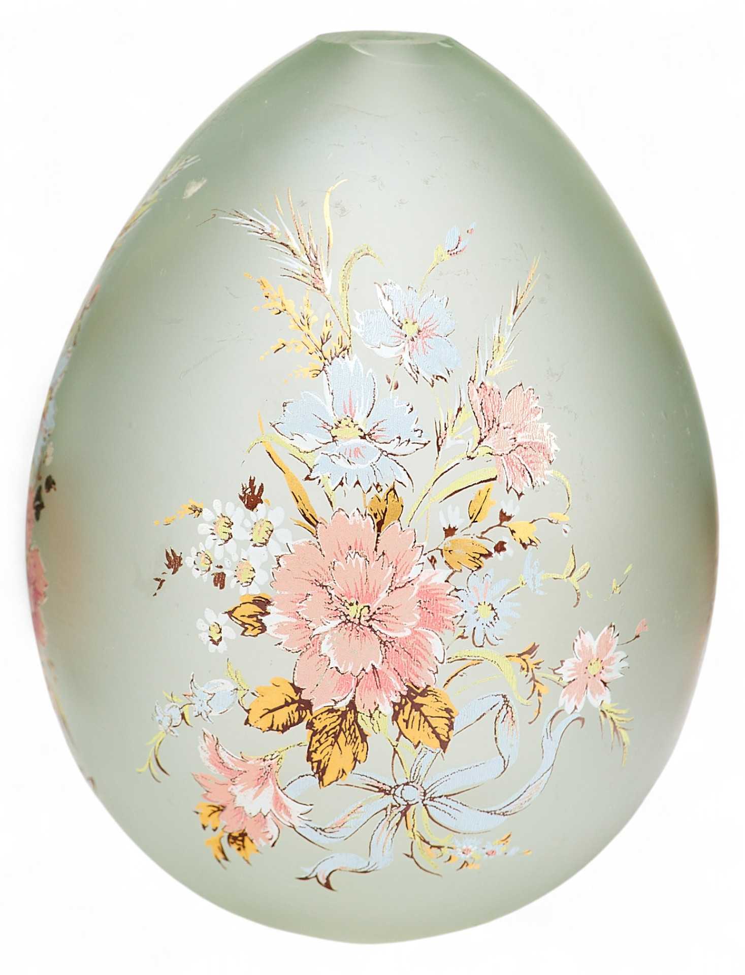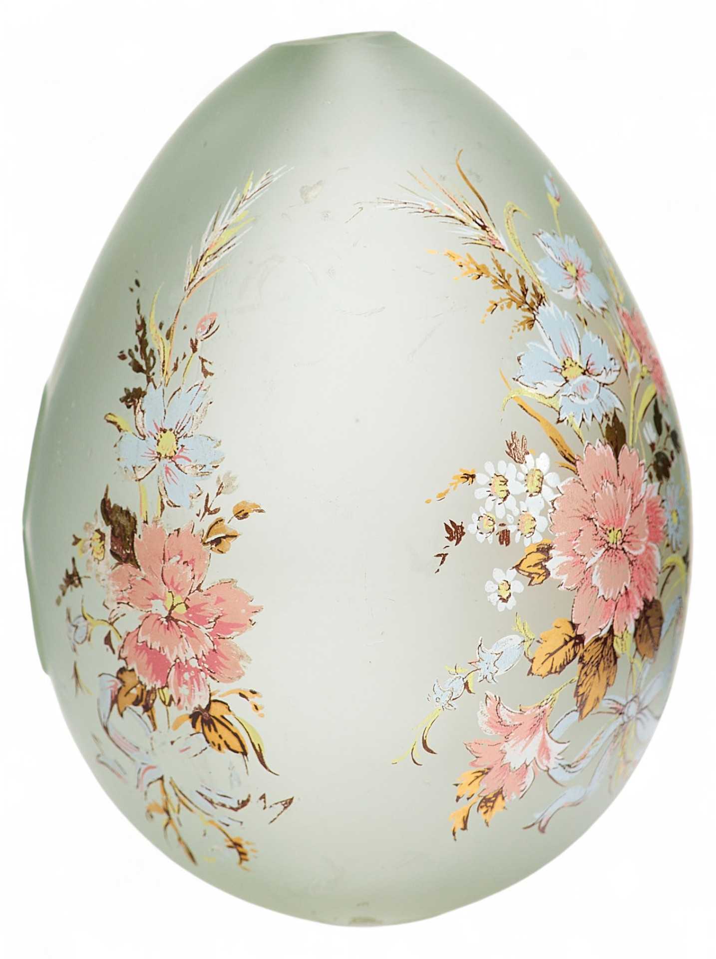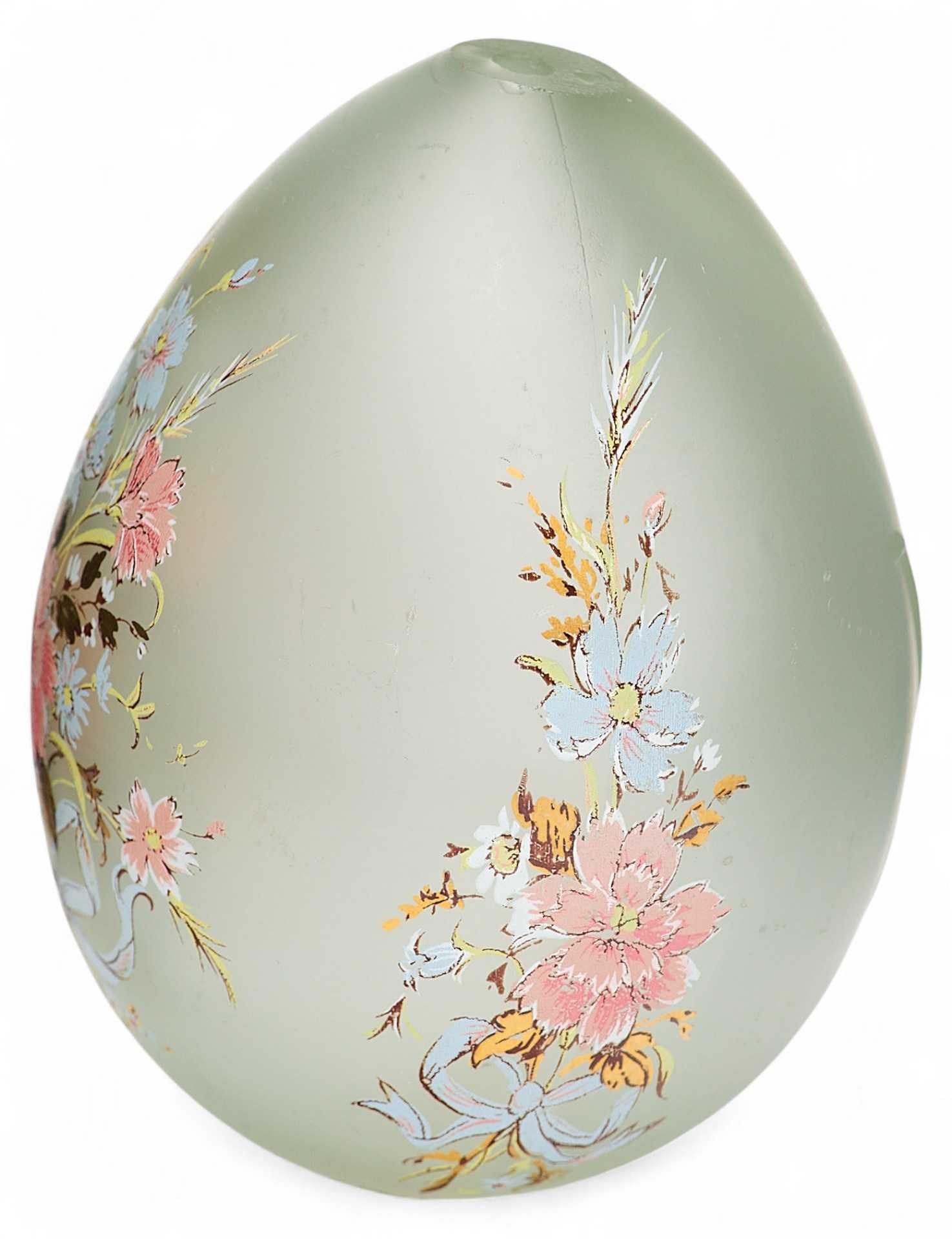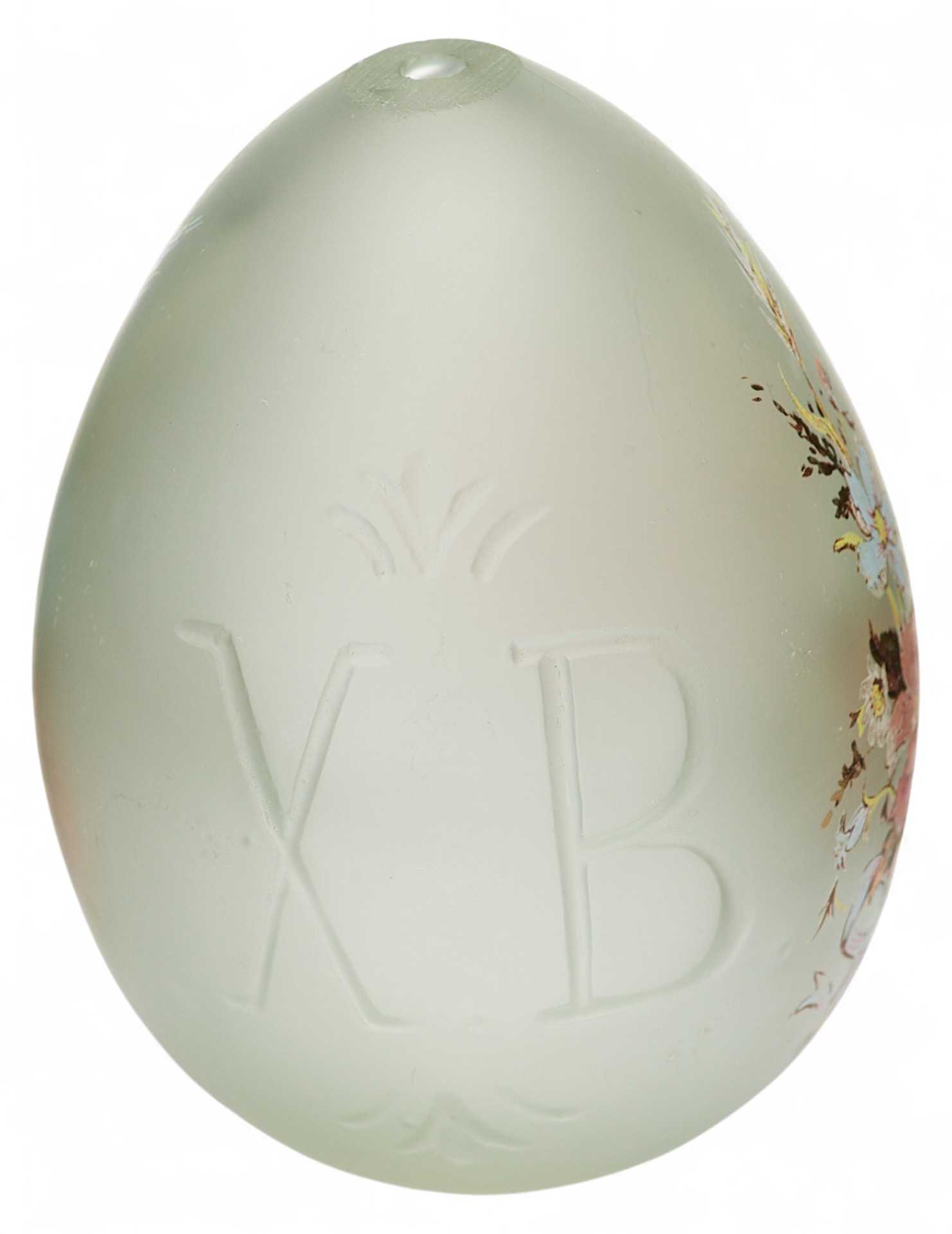 Представлено пасхальное яйцо из светлого матового стекла. С одной стороны на нем гравировка “ХВ”, а с другой цветочная гирлянда из нежно-розовых, бледно-голубых и белых цветов с золотисто-зелеными листочками.