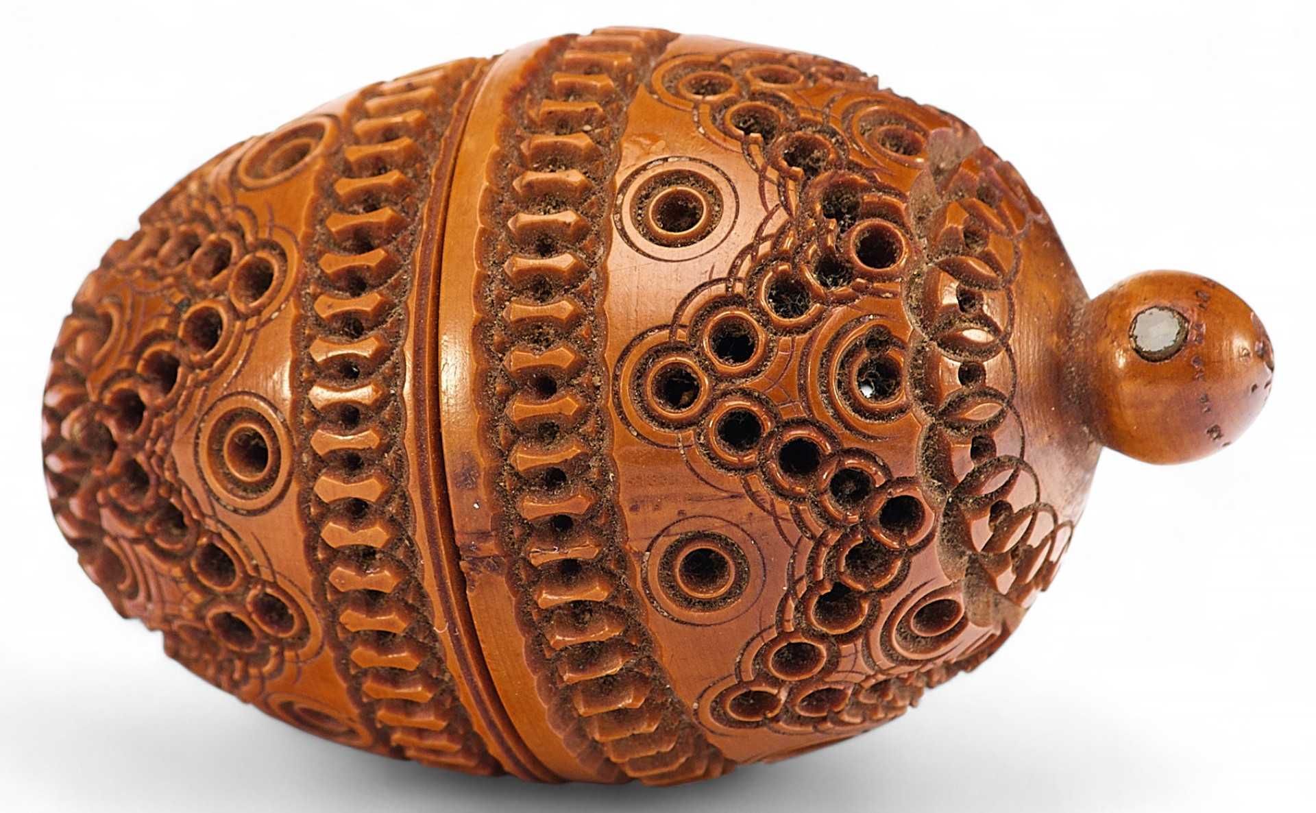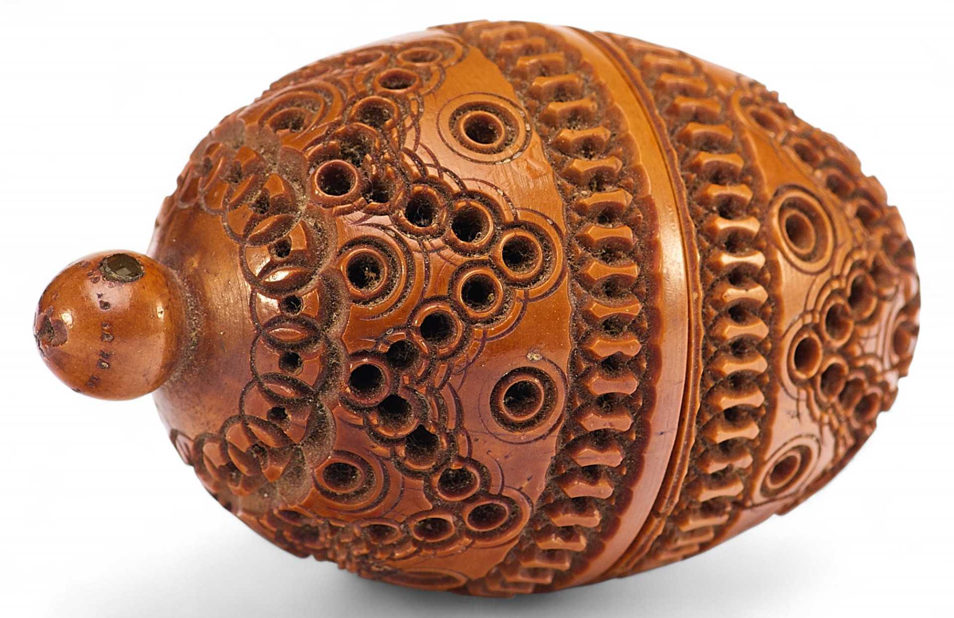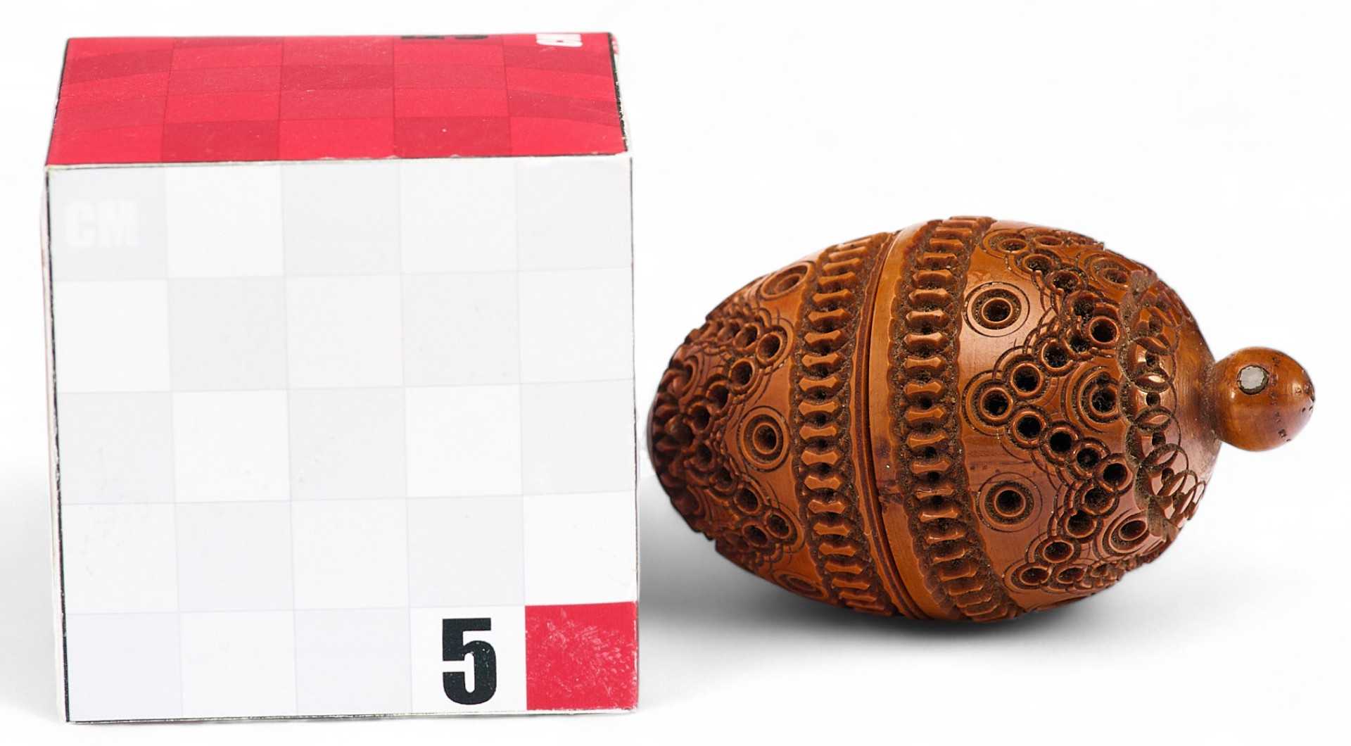 Представлено разъемное пасхальное яйцю. Изготовленное из дерева. Тулово украшено резным орнаментом, в основном состоящим из круглых сквозных отверстии. Обычай дарить крашеные яйца как напоминание о воскресении Христа восходит к преданию о принесении святой равноапостольной Марией Магдалиной красного яйца императору Тиберию, люди обменивались на Пасху подарками в форме яиц, выполненных из различных материалов: дерева, фарфора, стекла, серебра и золота. Пасхальное яйцо - непременный атрибут каждого праздничного стола в светлый день Воскресения Христова. Пасхальные яйца, освященные в церкви, считались мощным оберегом жилища. Их прятали за икону, где они лежали до следующей Пасхи, охраняя дом и его обитателей от всех неприятностей.