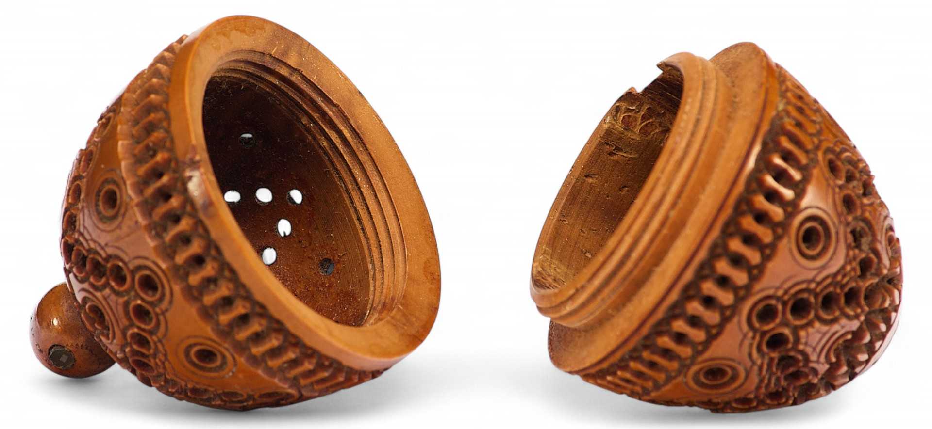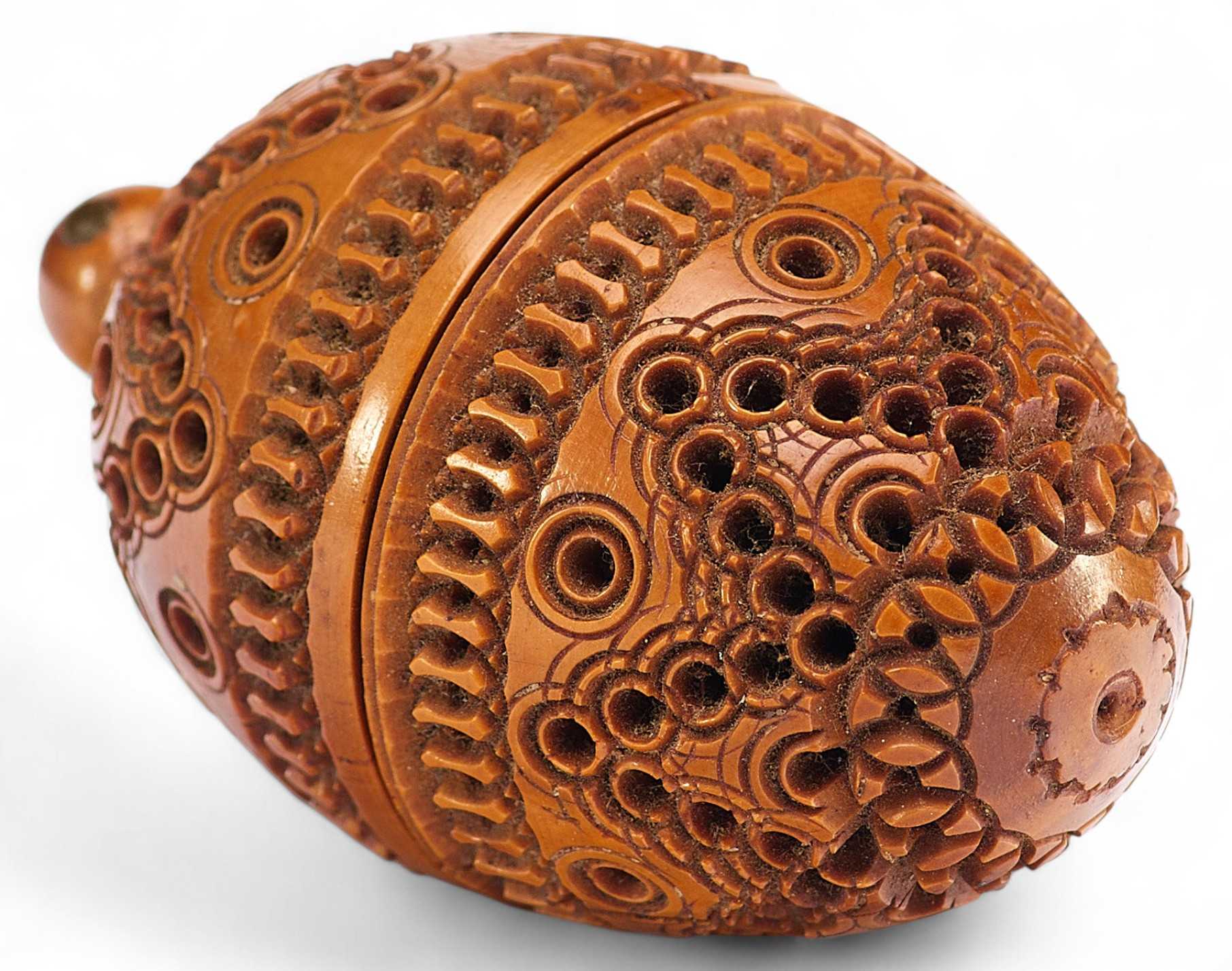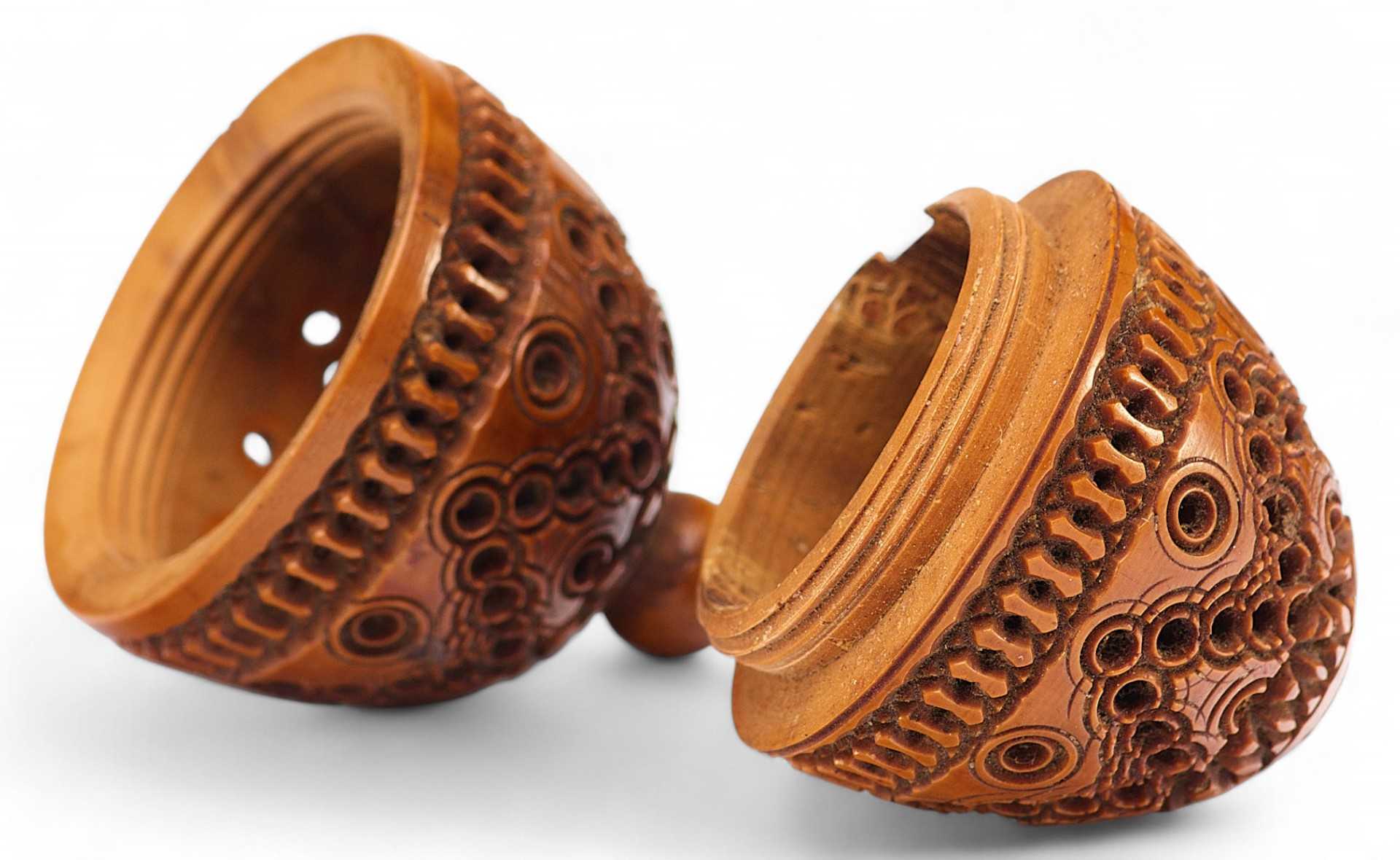 Представлено разъемное пасхальное яйцю. Изготовленное из дерева. Тулово украшено резным орнаментом, в основном состоящим из круглых сквозных отверстии. Обычай дарить крашеные яйца как напоминание о воскресении Христа восходит к преданию о принесении святой равноапостольной Марией Магдалиной красного яйца императору Тиберию, люди обменивались на Пасху подарками в форме яиц, выполненных из различных материалов: дерева, фарфора, стекла, серебра и золота. Пасхальное яйцо - непременный атрибут каждого праздничного стола в светлый день Воскресения Христова. Пасхальные яйца, освященные в церкви, считались мощным оберегом жилища. Их прятали за икону, где они лежали до следующей Пасхи, охраняя дом и его обитателей от всех неприятностей.