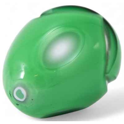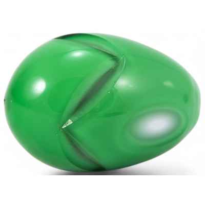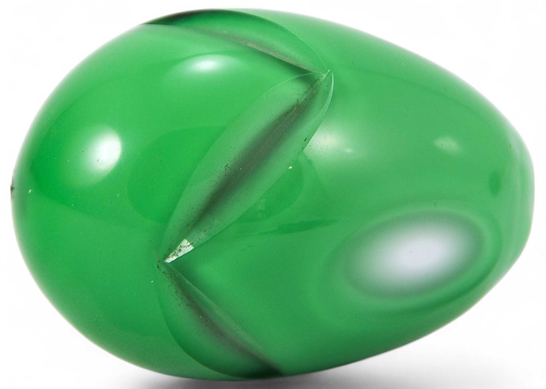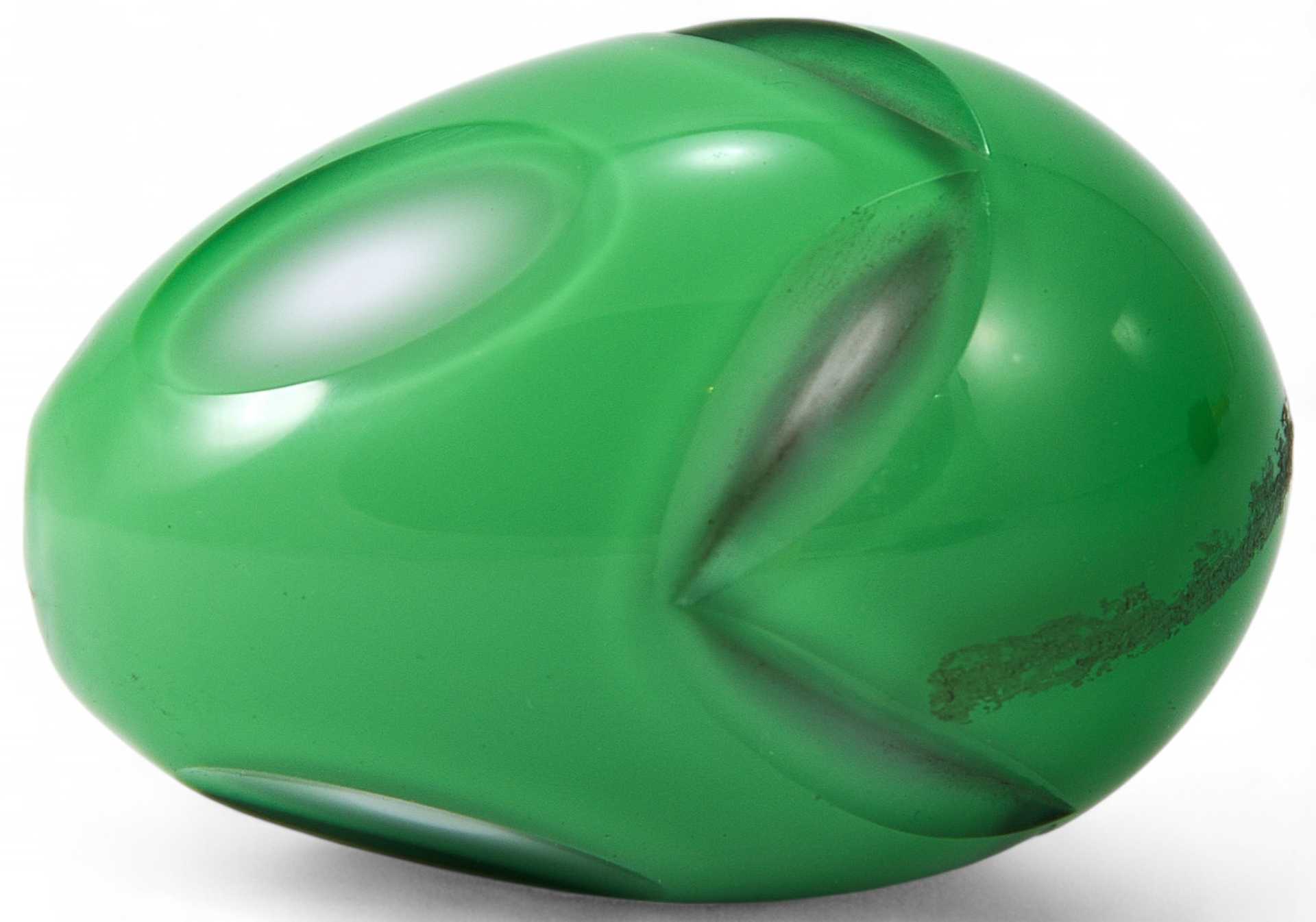 Представлено пасхальное яйцо, изготовленное из двуслойного стекла зелено-белого цвета. На поверхности тулова орнамент в виде кругов и прорезанных длинных узких листьев. Обычай дарить крашеные яйца как напоминание о воскресении