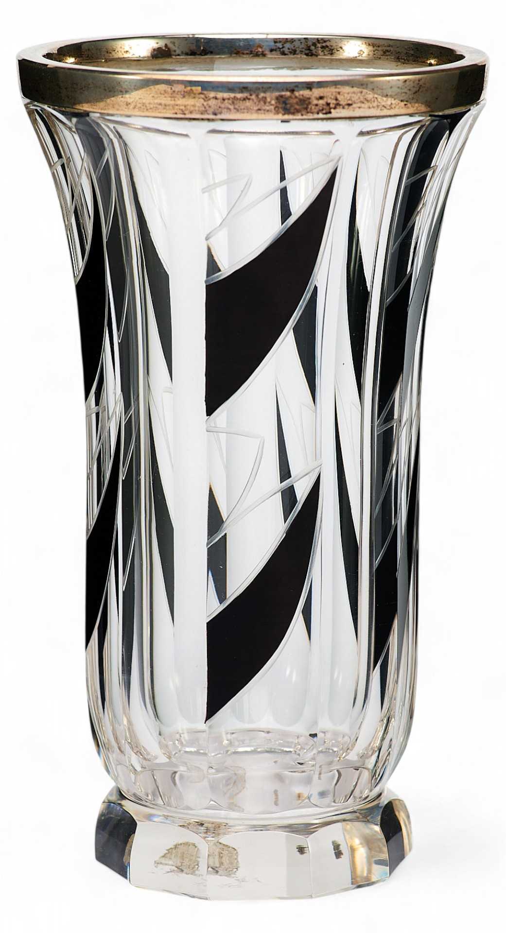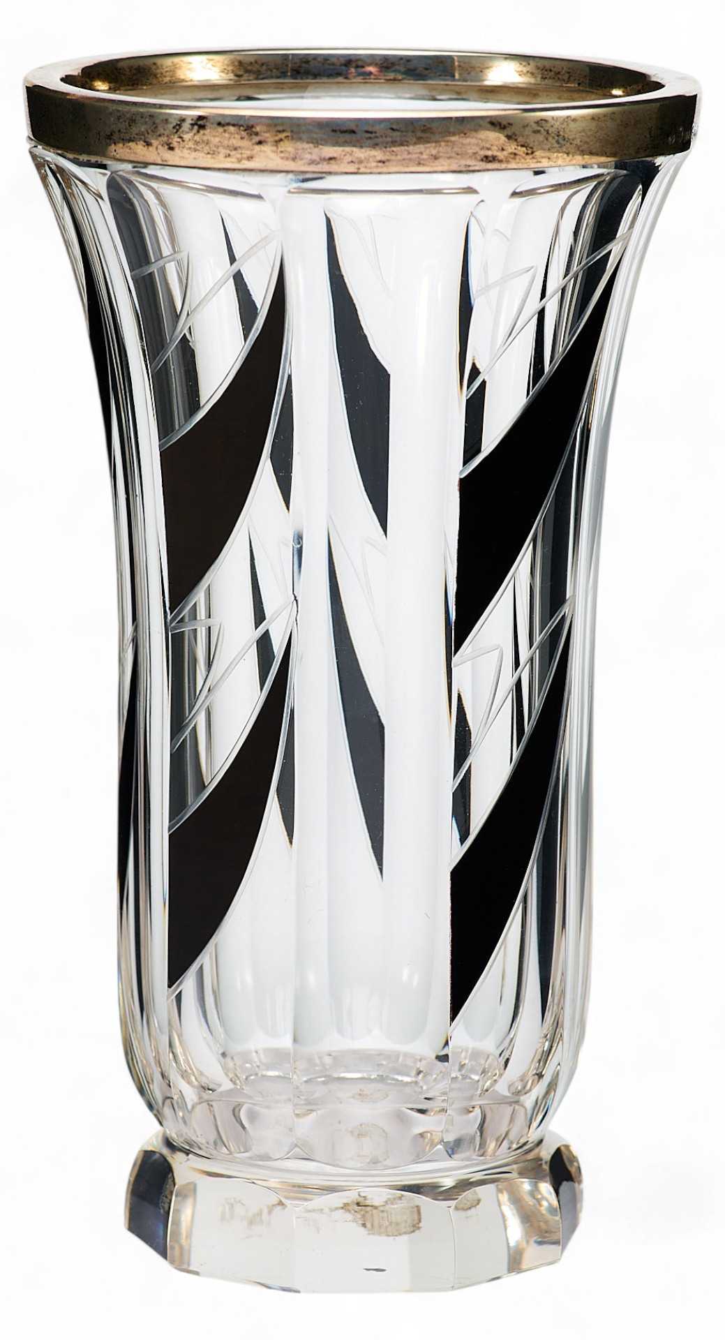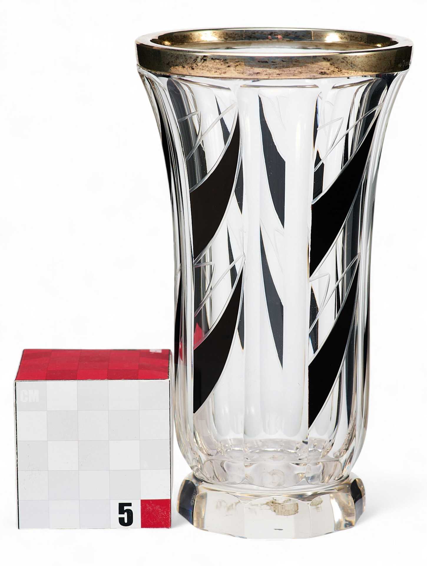Стеклянная ваза конусовидной формы на профилированном основании. Оправа горла серебряная. На оправе имеются клейма: Изображение птицы-удода в щитке с обозначениями “4” и “W” — клеймо для изделий из серебра 800, принятое в Вене (Австрия) после 1922 г. Обозначение “800” пробы.