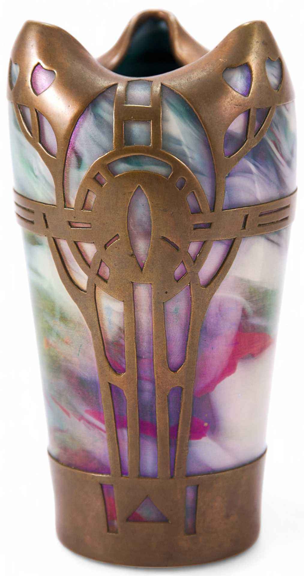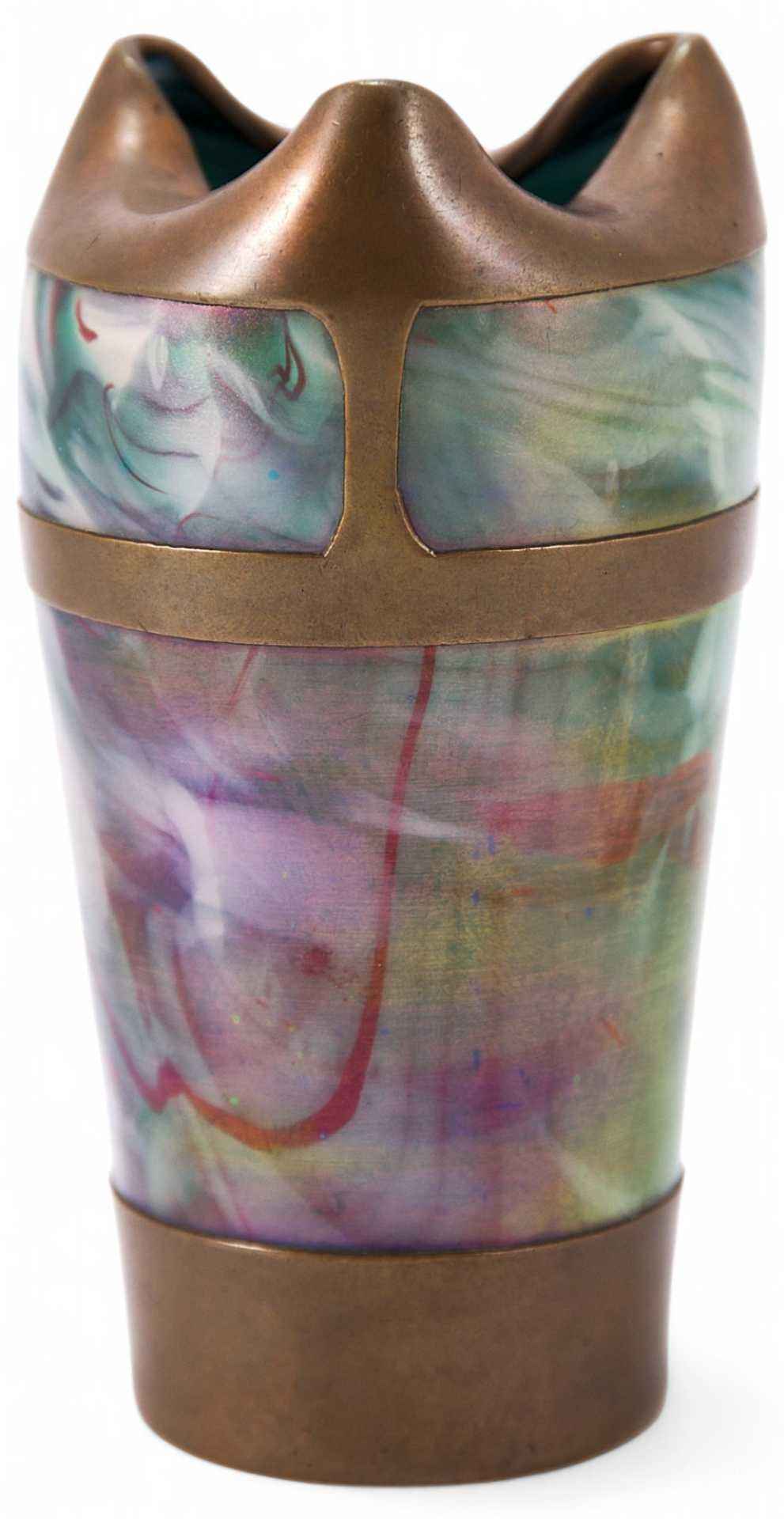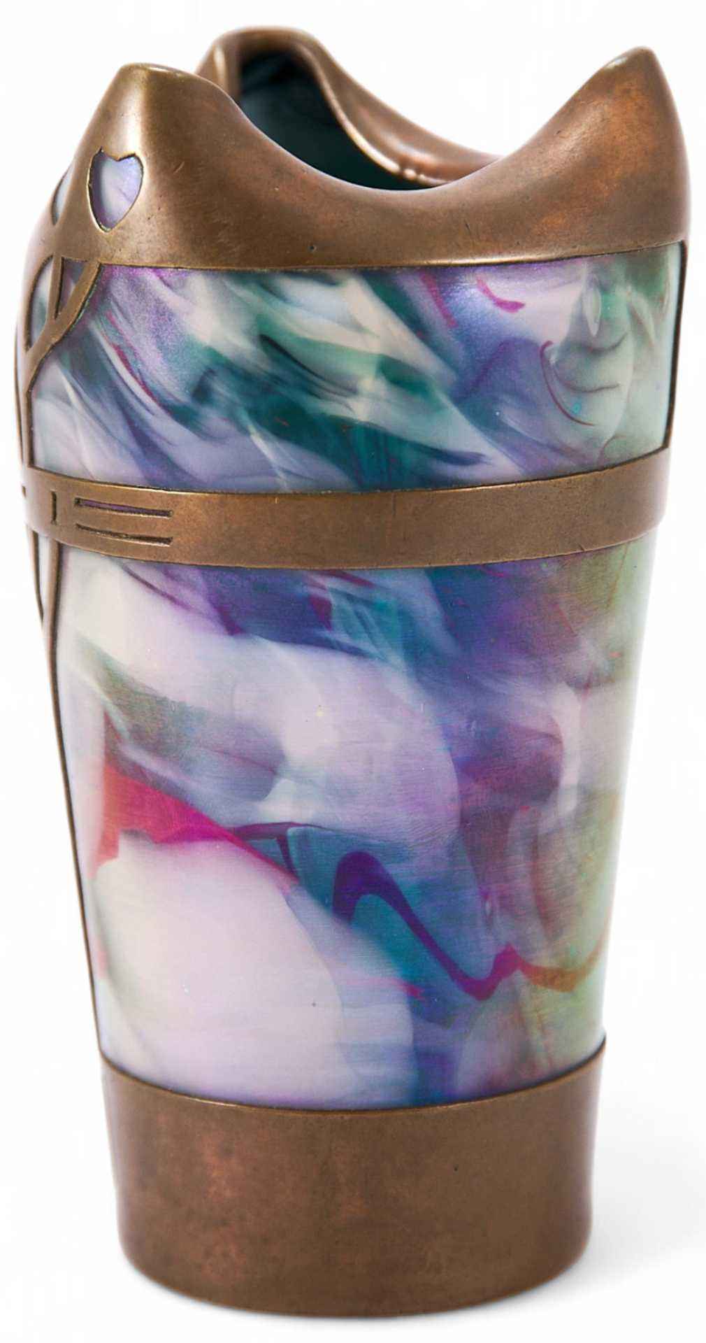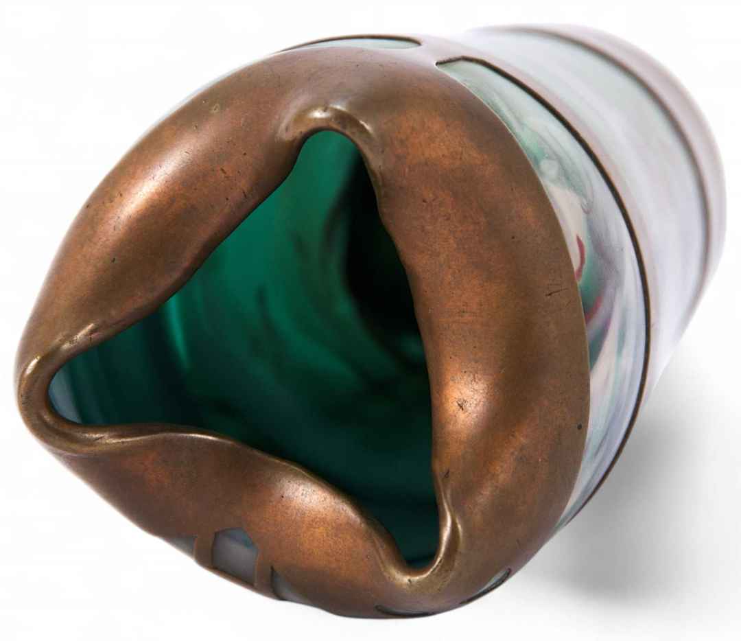 Ваза выполнена из цветного стекла в стиле «модерн»; декорирована резной медной окантовкой.
