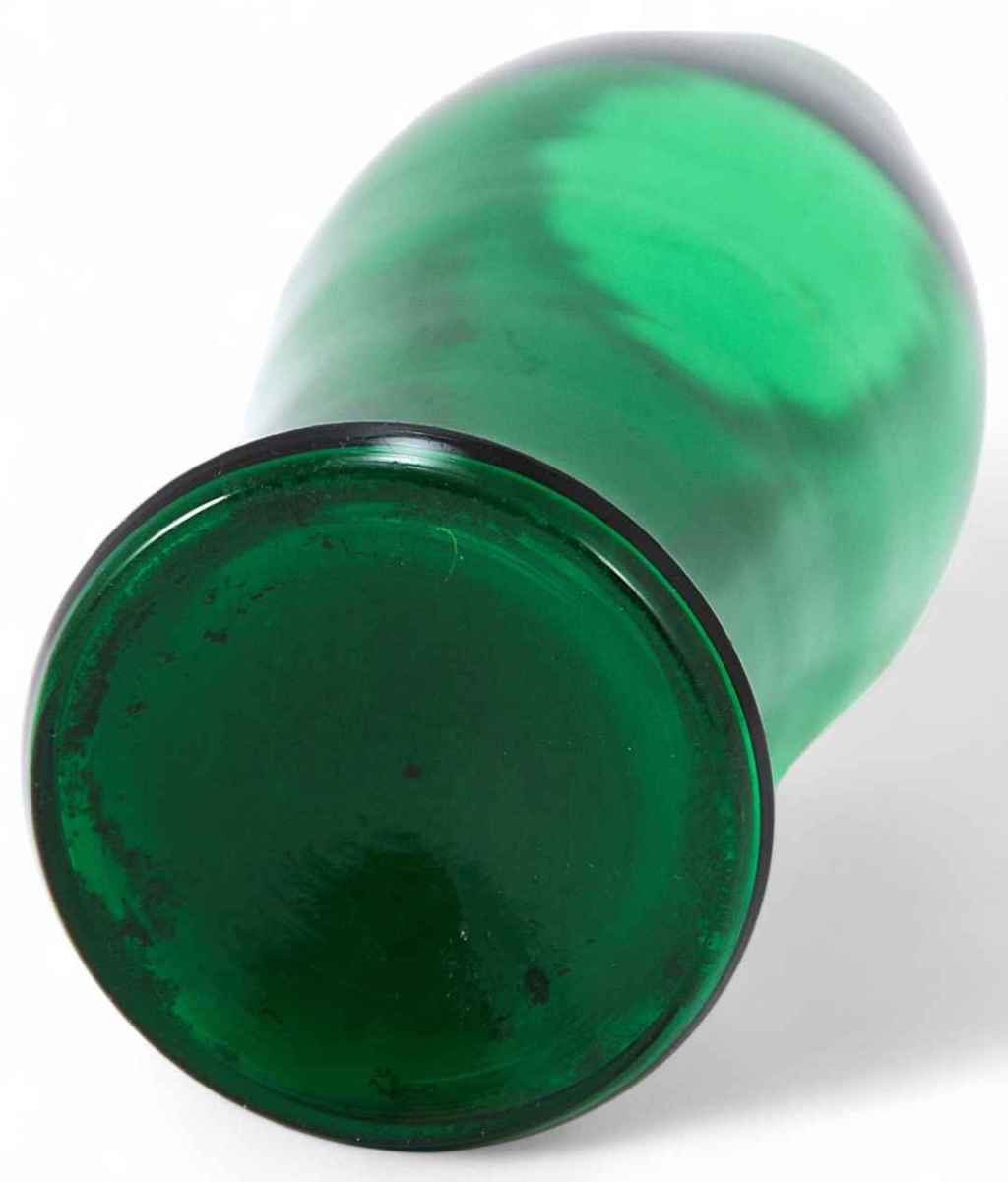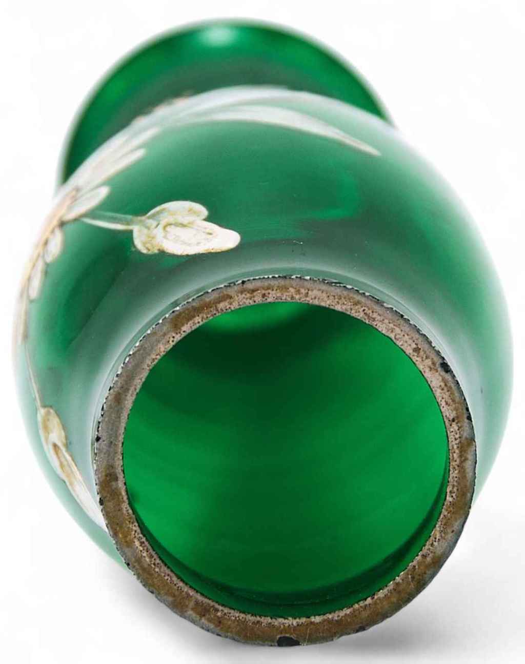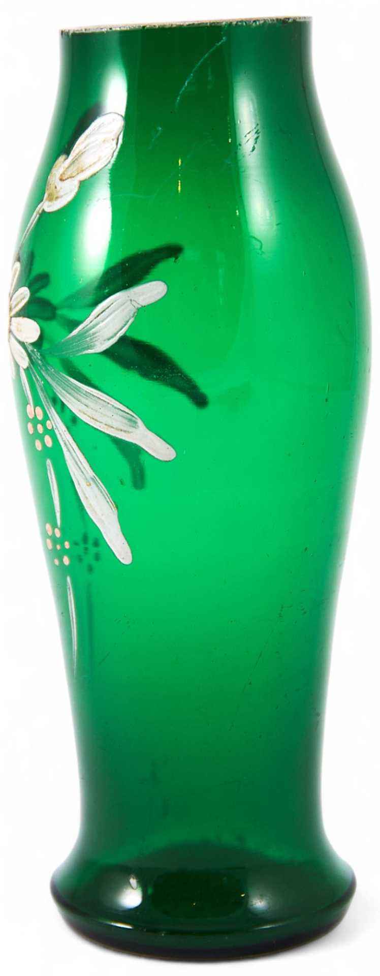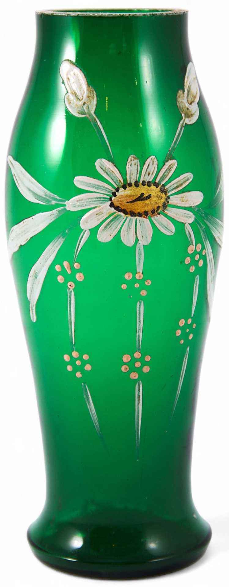 Невысокая декоративная вазочка выполнена из зеленого прозрачного стекла. Простая лаконичная форма предмета компенсируется контрастной эмалевой росписью — стилизованным изображением цветка ромашки и растительными элементами, выполненными в лубочном стиле, что позволяет отнести предмет к неорусскому направлению модерна. Изделие выполнено на хорошем техническом уровне.