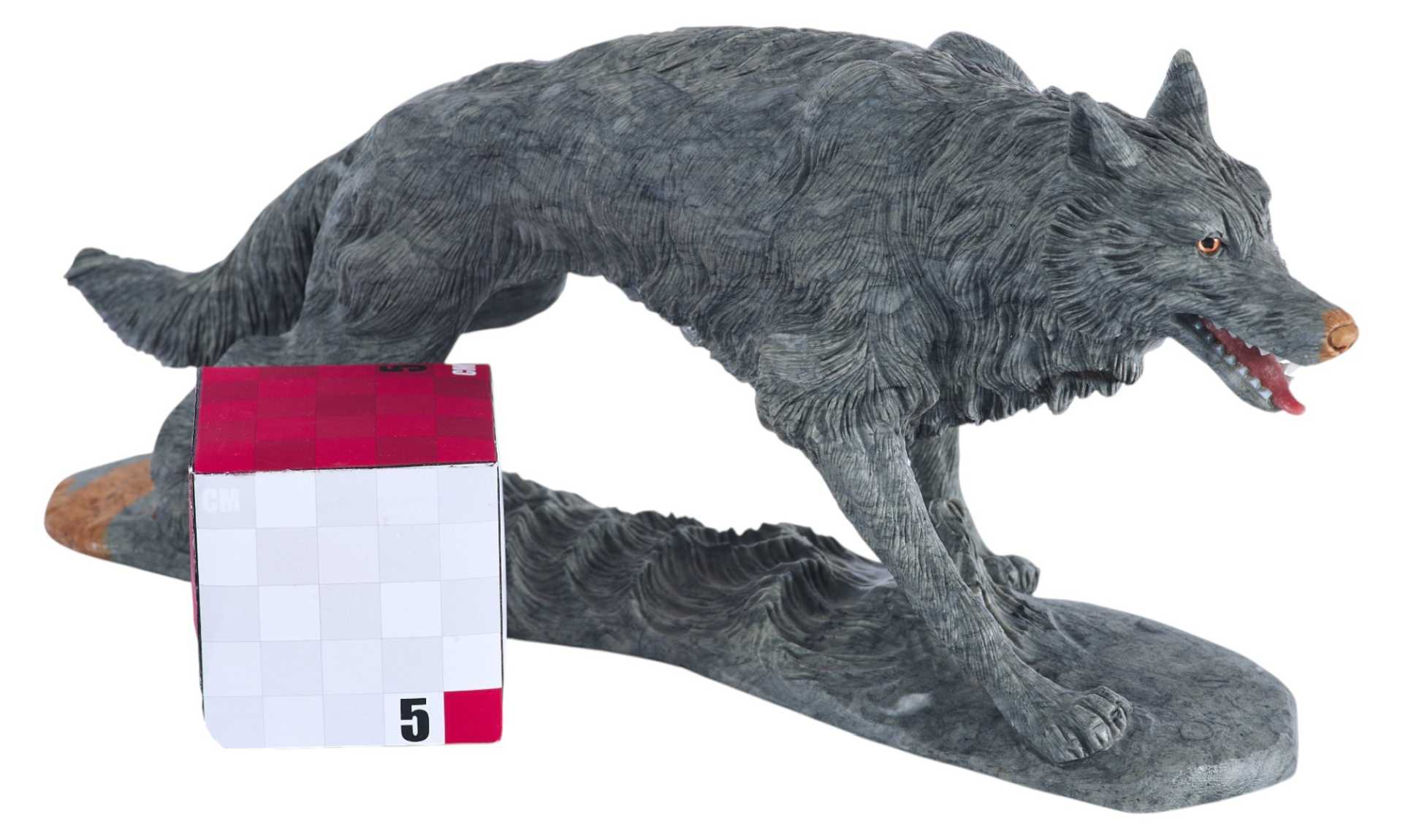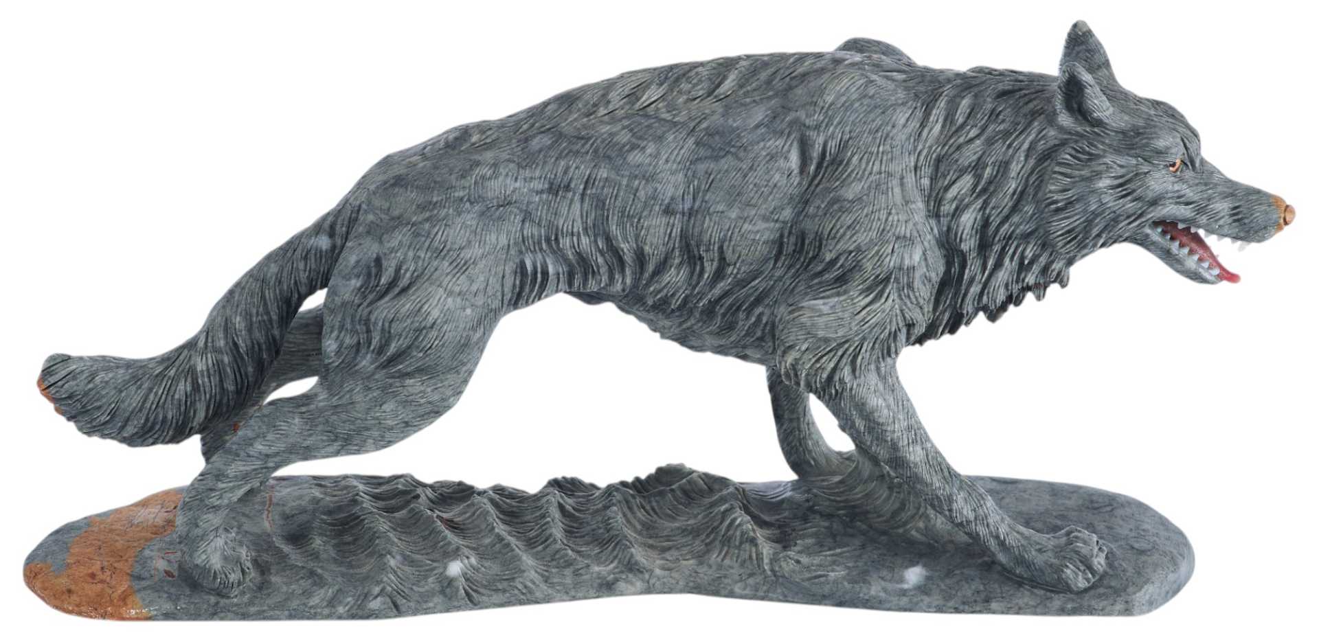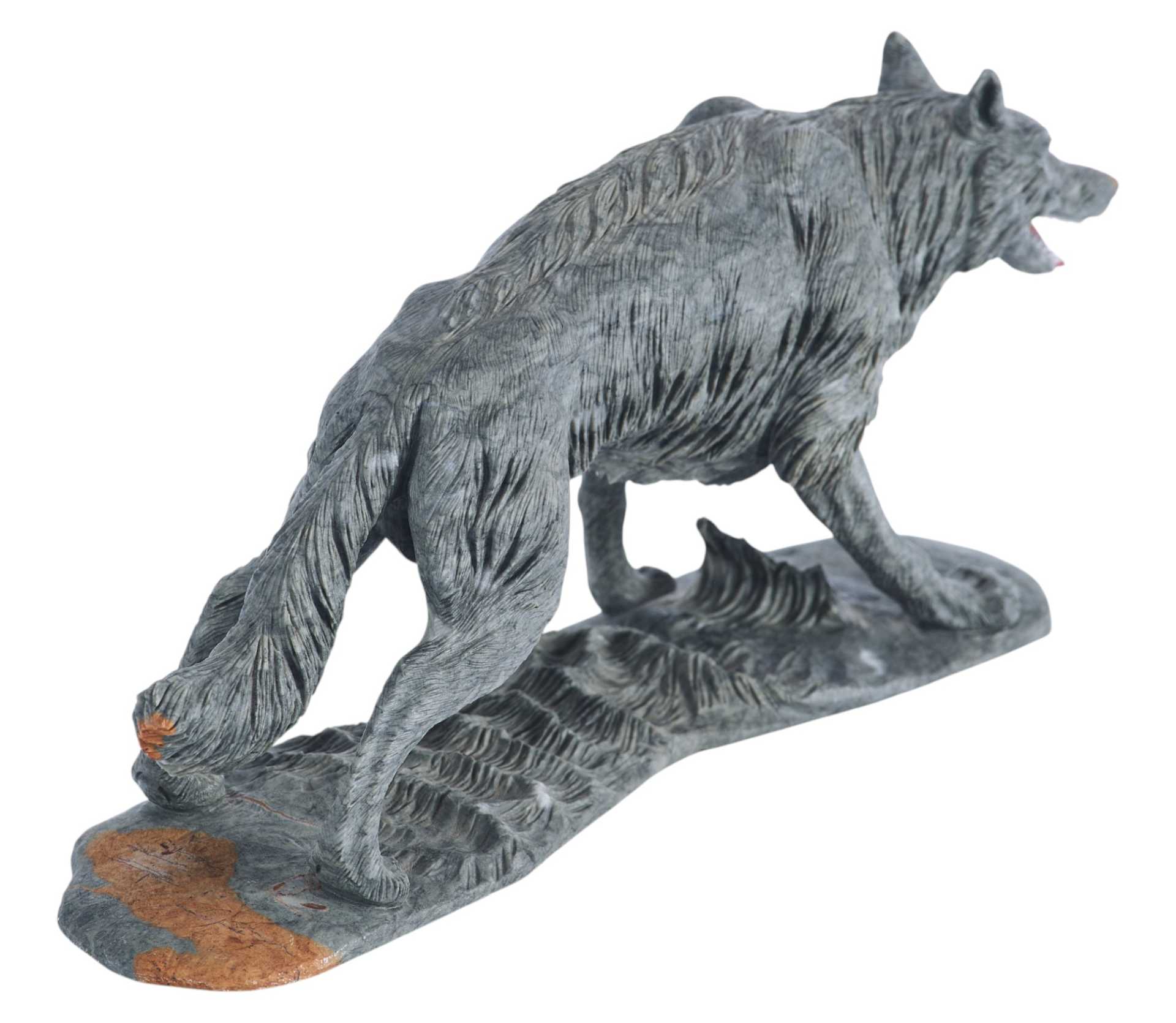 Представленная скульптура выполнена в анималистическом жанре в реалистичной манере, вырезана из цельного куска каменной породы (дополнена вставками из перламутра - зубы, и цветного стекла -глаза животного). Фигура волка и анатомические особенности зверя (такие как шкура, рельефность напряженных мышц, характерная поза) - проработаны тщательно, детально, даже натуралистично.