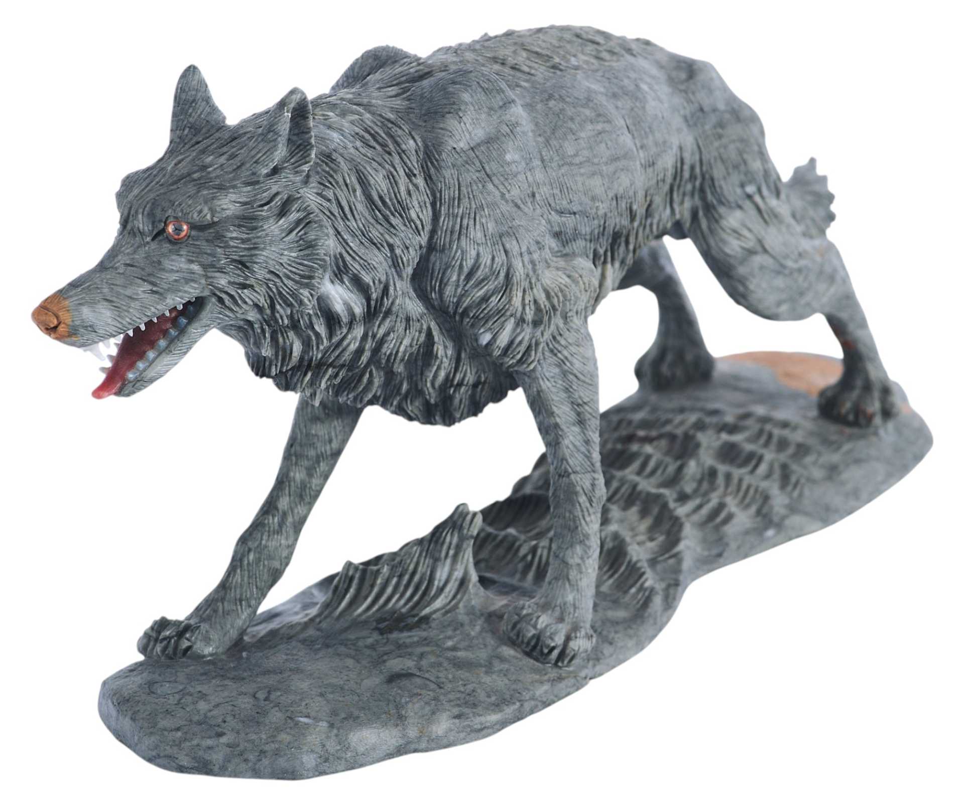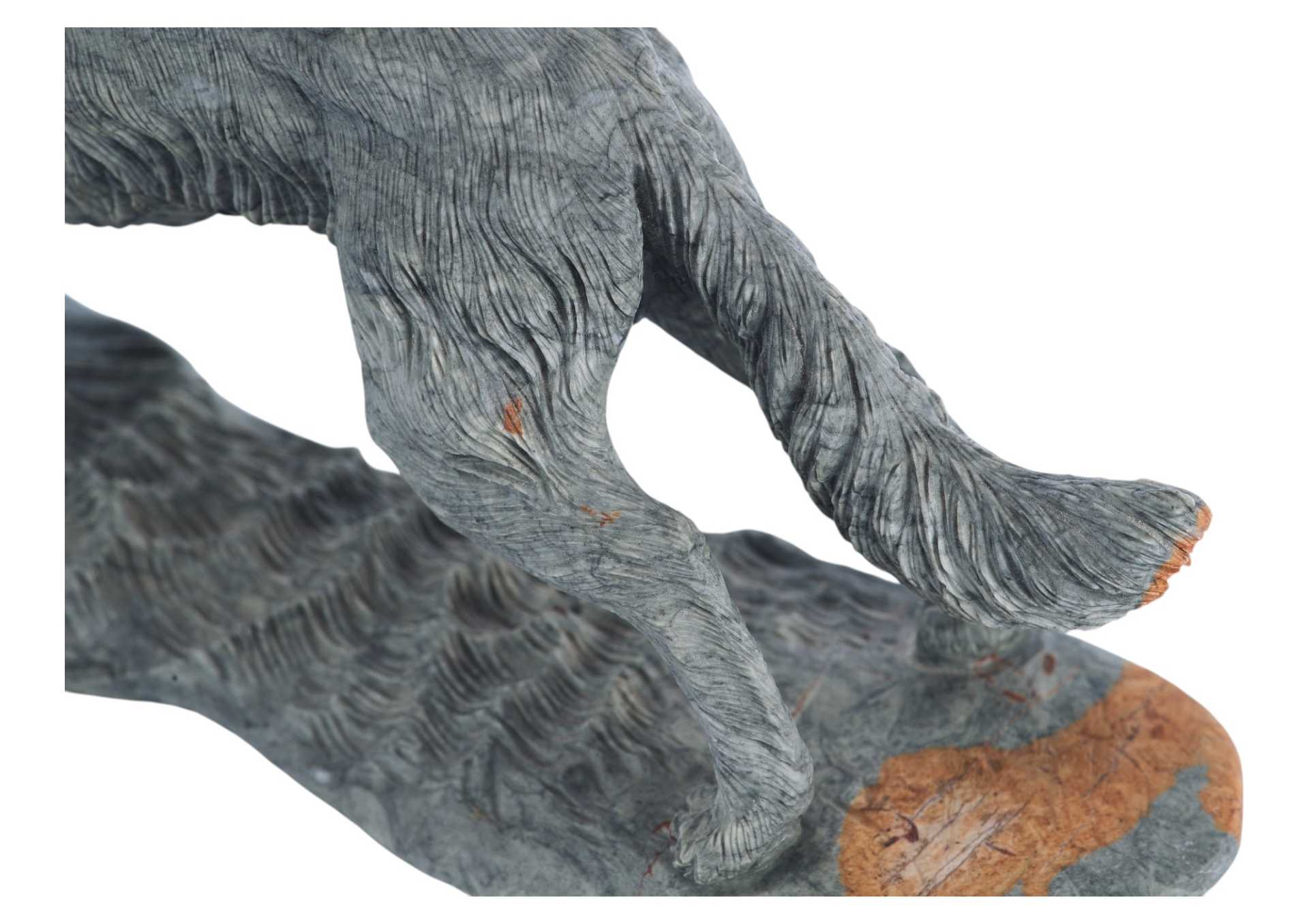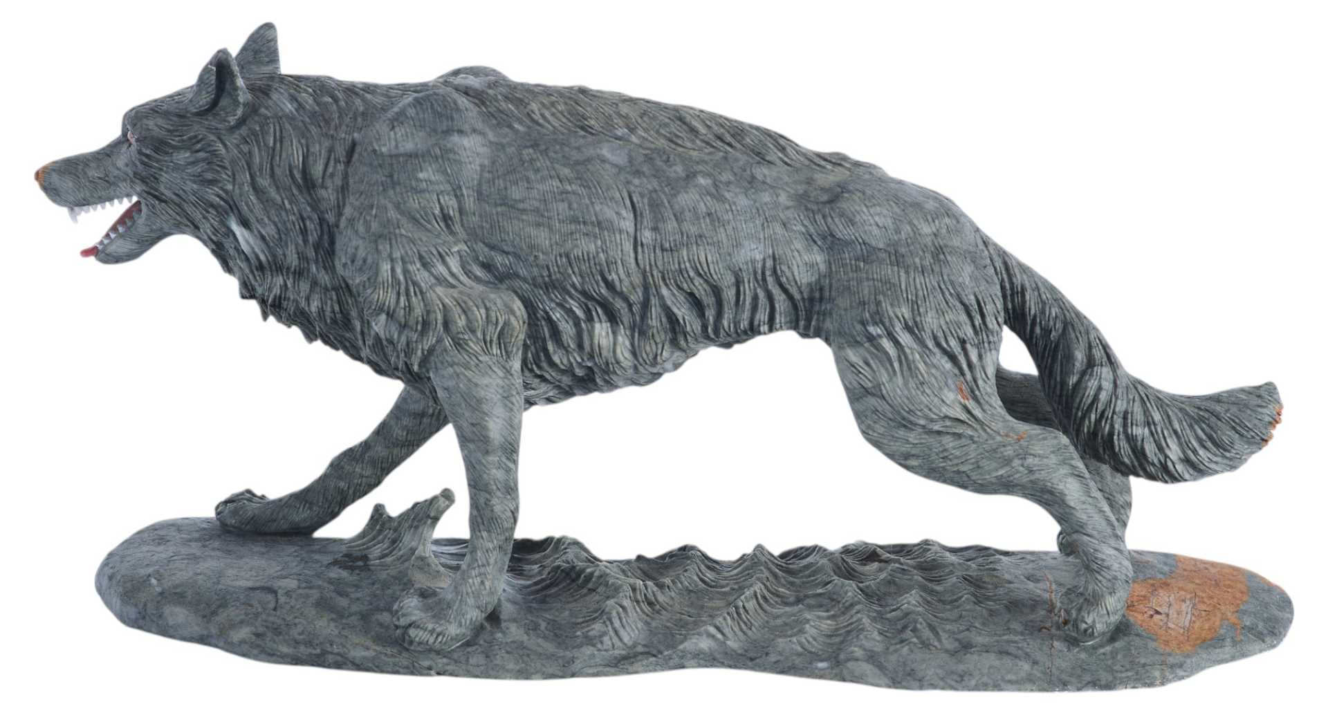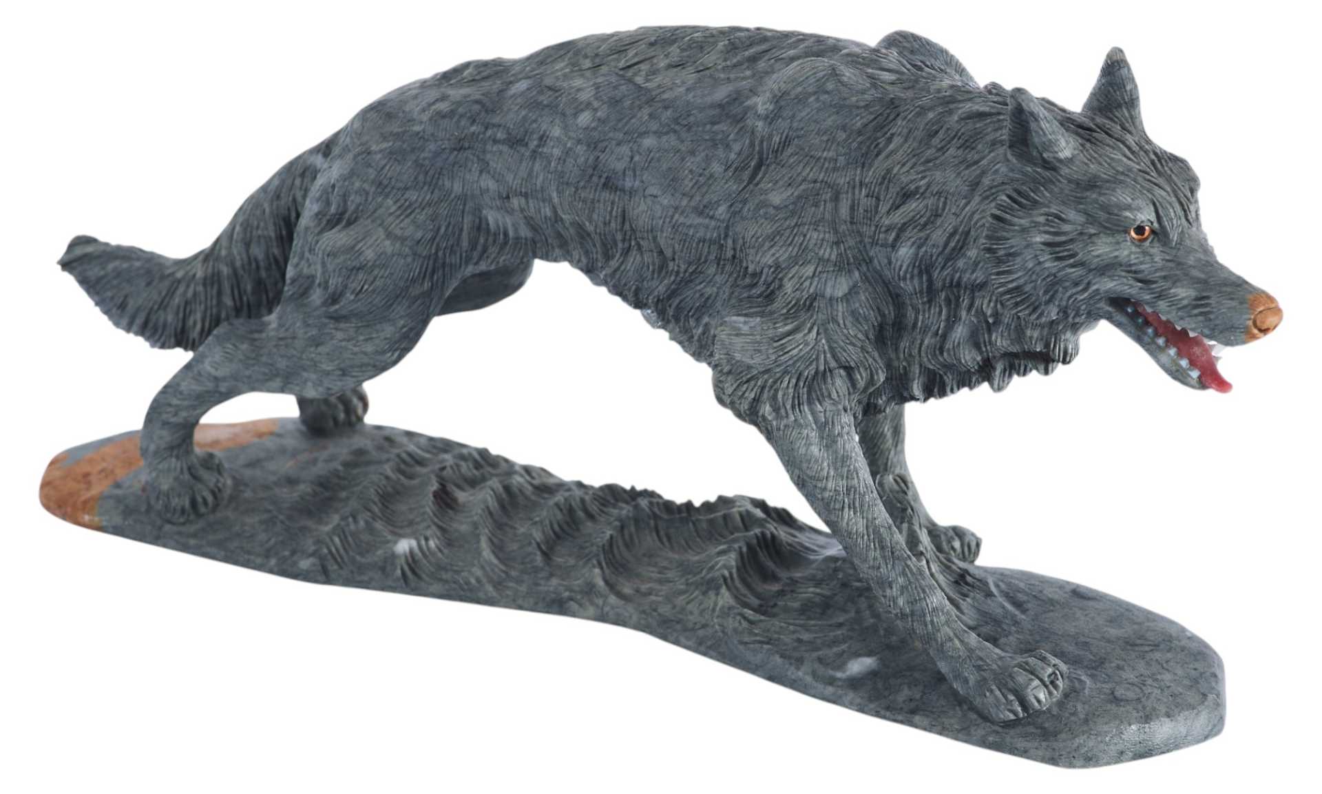 Представленная скульптура выполнена в анималистическом жанре в реалистичной манере, вырезана из цельного куска каменной породы (дополнена вставками из перламутра - зубы, и цветного стекла -глаза животного). Фигура волка и анатомические особенности зверя (такие как шкура, рельефность напряженных мышц, характерная поза) - проработаны тщательно, детально, даже натуралистично.