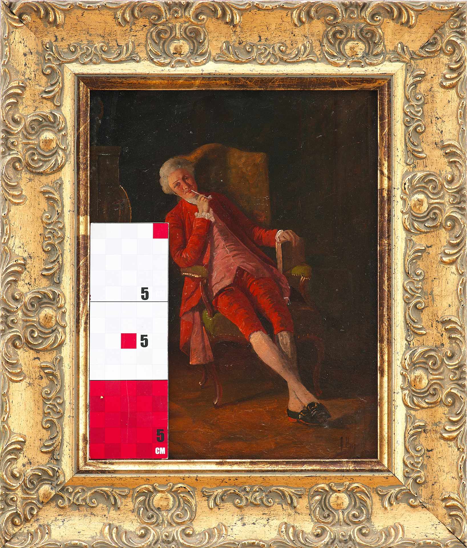 На темном фоне изображен молодой аристократ, сидящий в кресле. Его поза свободная , раскованная. Левая рука мужчины лежит на старинном фолианте. а в правой держит трубку. Лицо задумчивое, мечтательное. Его голову украшает седой парик, одет в красный камзол со светлой жилеткой .