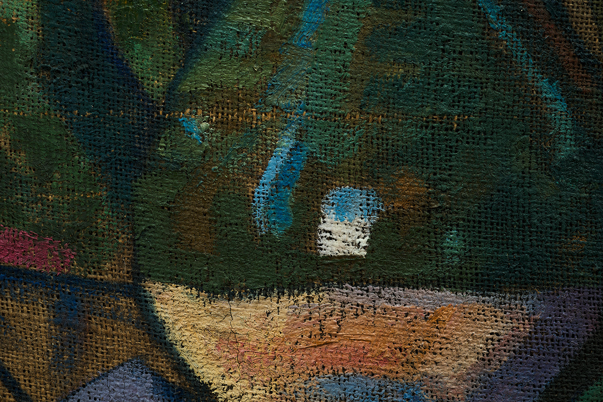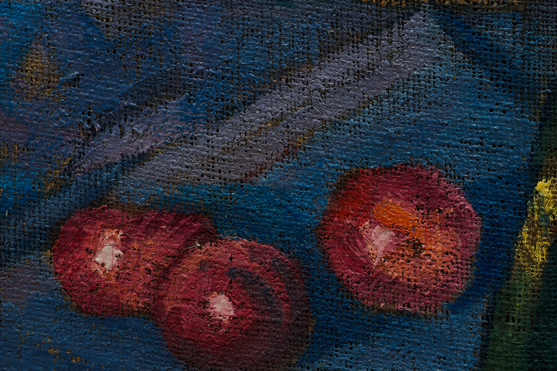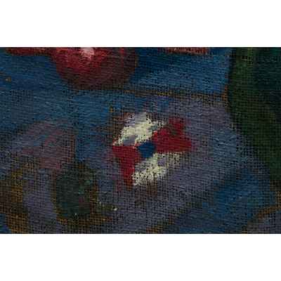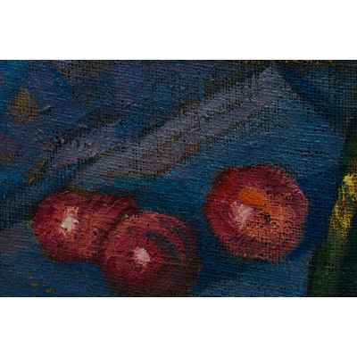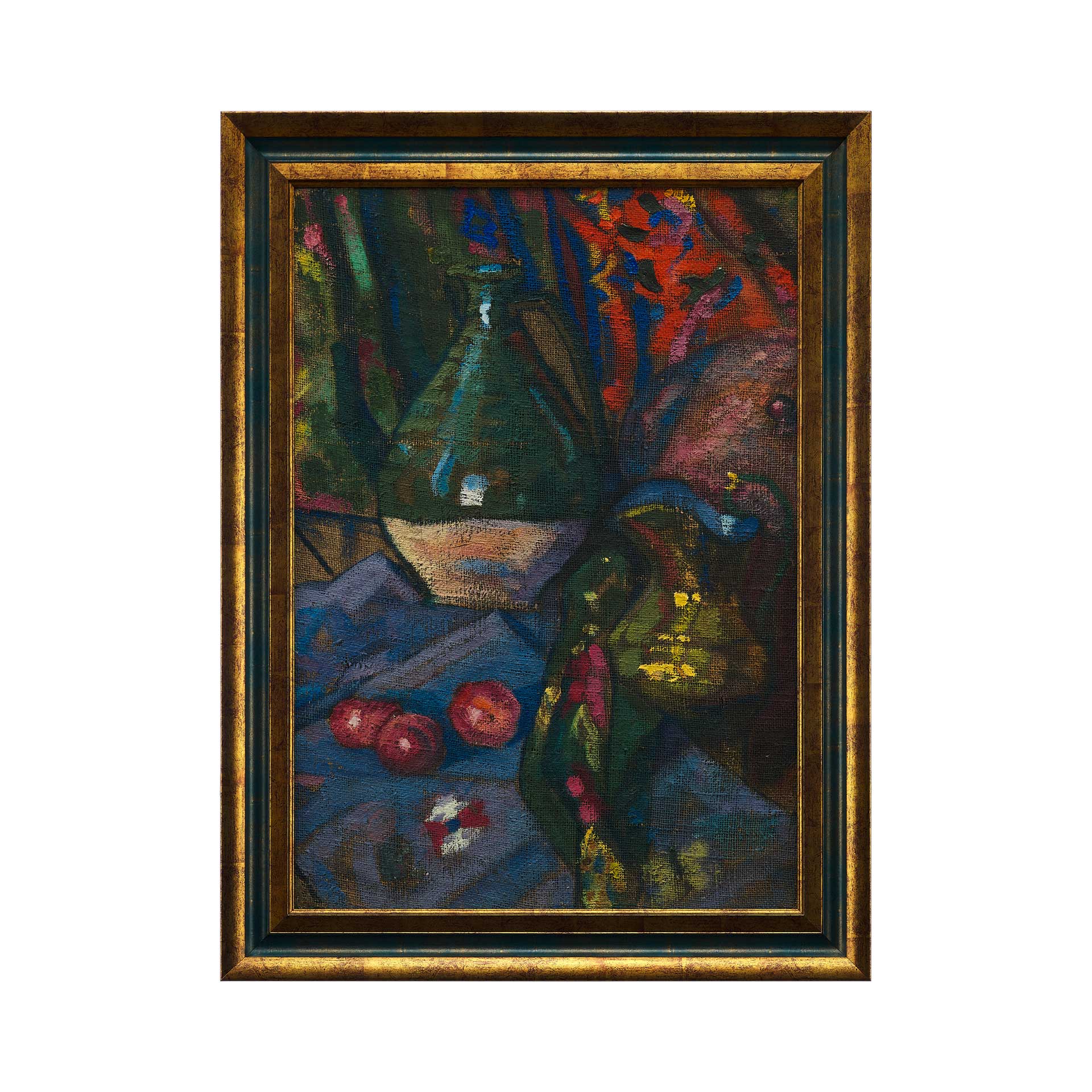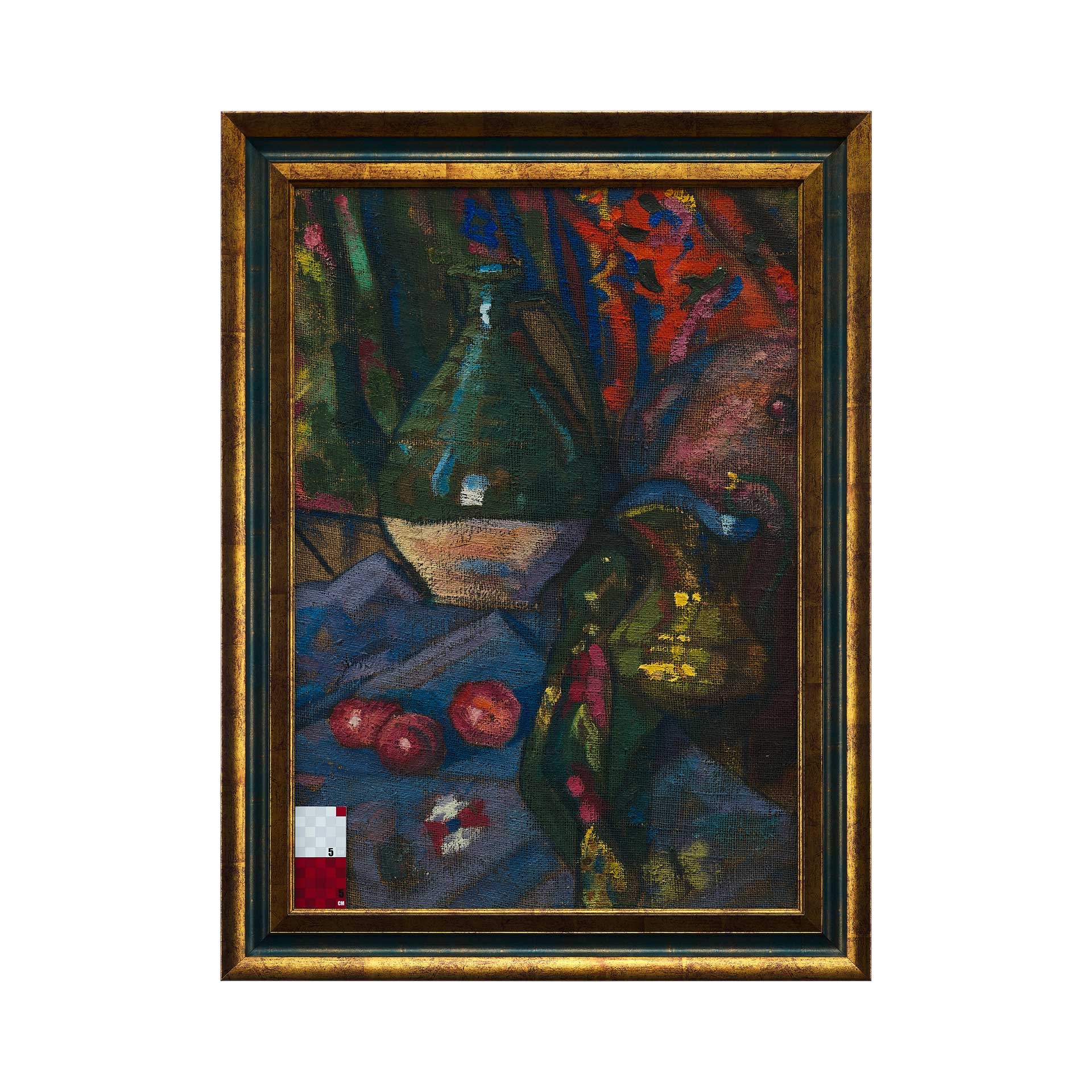 Изображение представляет собой тщательно выстроенную композицию с двумя сосудами и несколькими фруктами, лежащими на синей драпировке. Цветовая палитра насыщена, но сдержанна — в ней преобладают глубокие оттенки синего, зелёного, красного и жёлтого. Предметы трактуются не как реалистические объекты, а как геометризированные формы, что указывает на влияние авангардной живописи. Очертания предметов подчеркнуты линией, формы сведены к условным плоскостям, создающим ощущение декоративности и одновременной глубины.