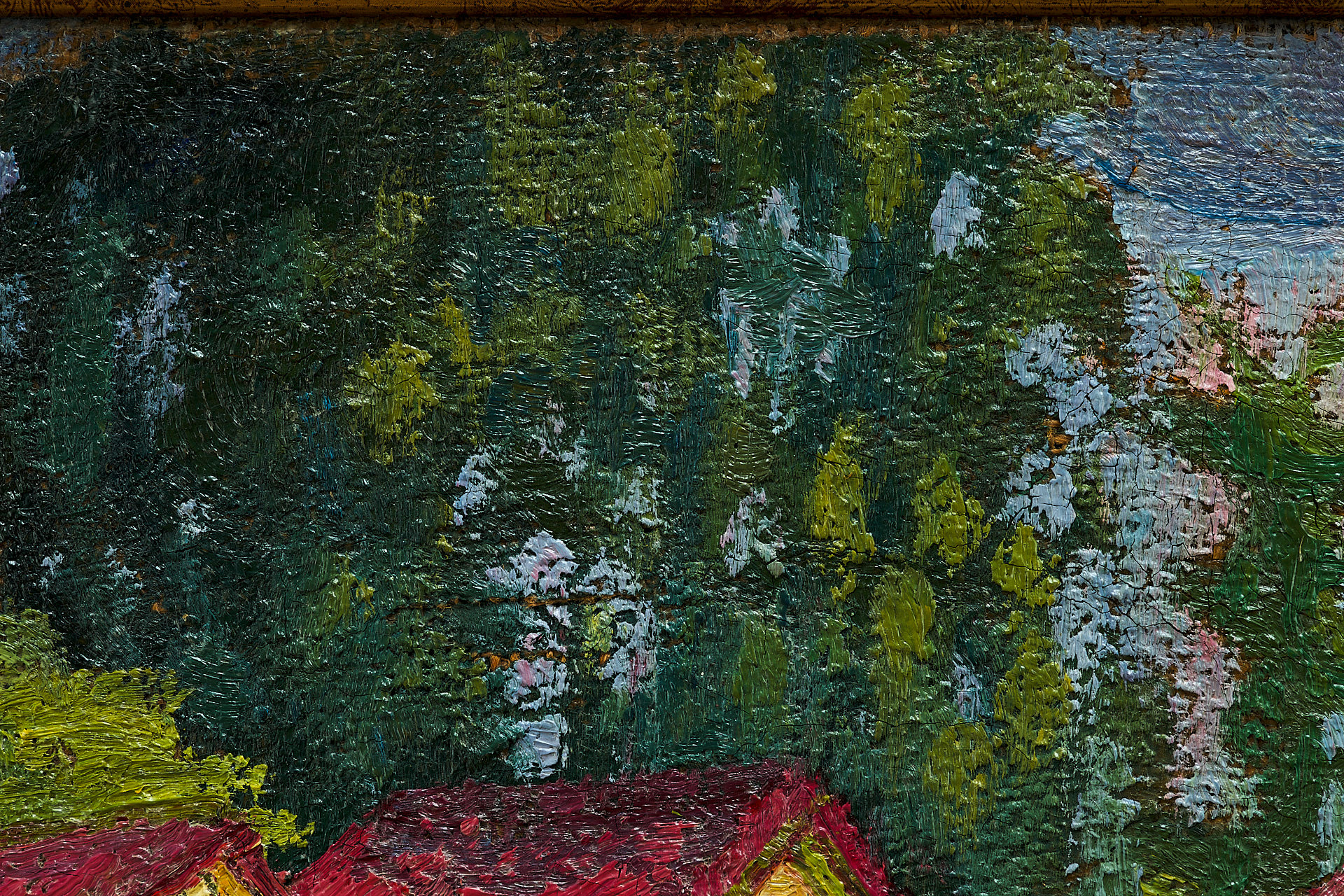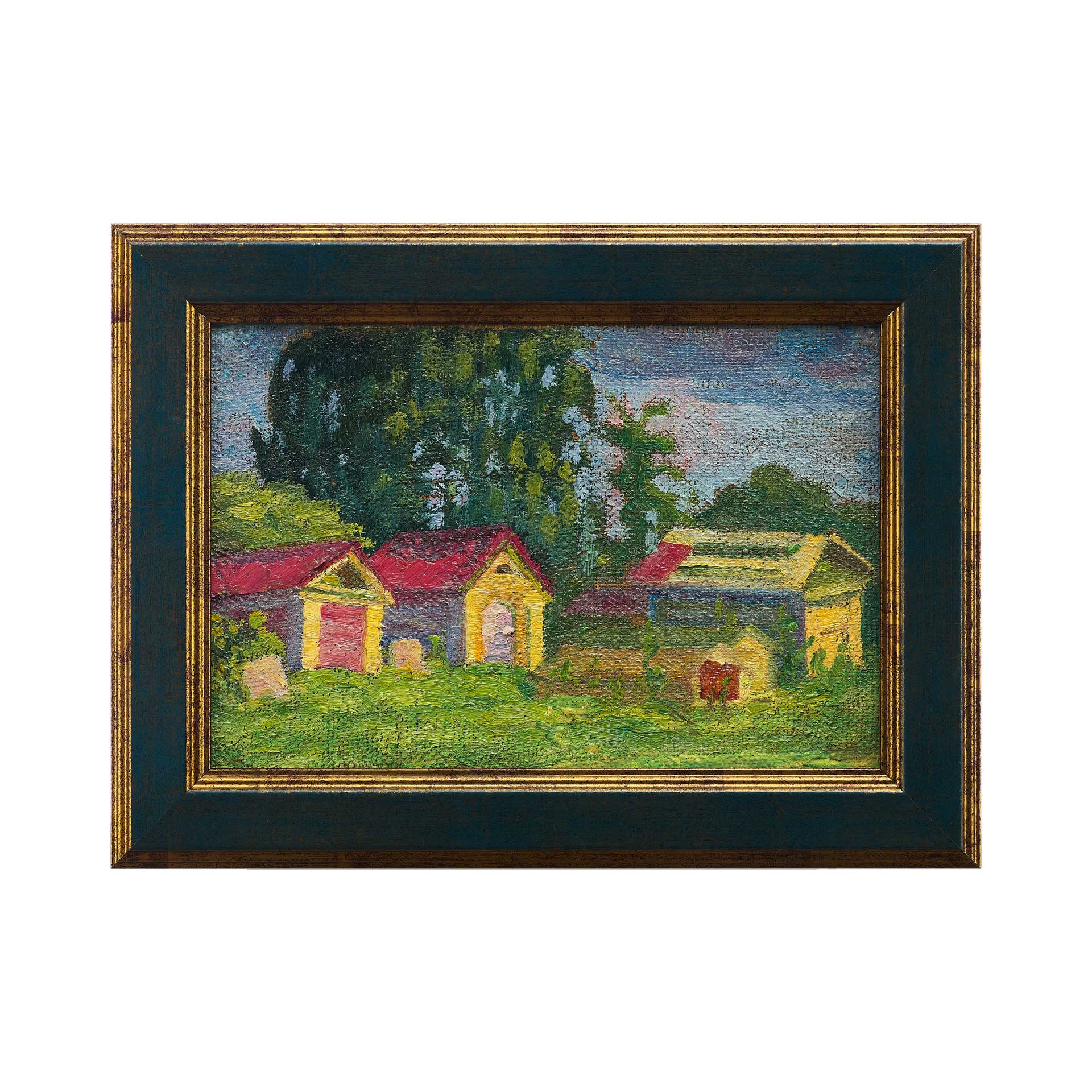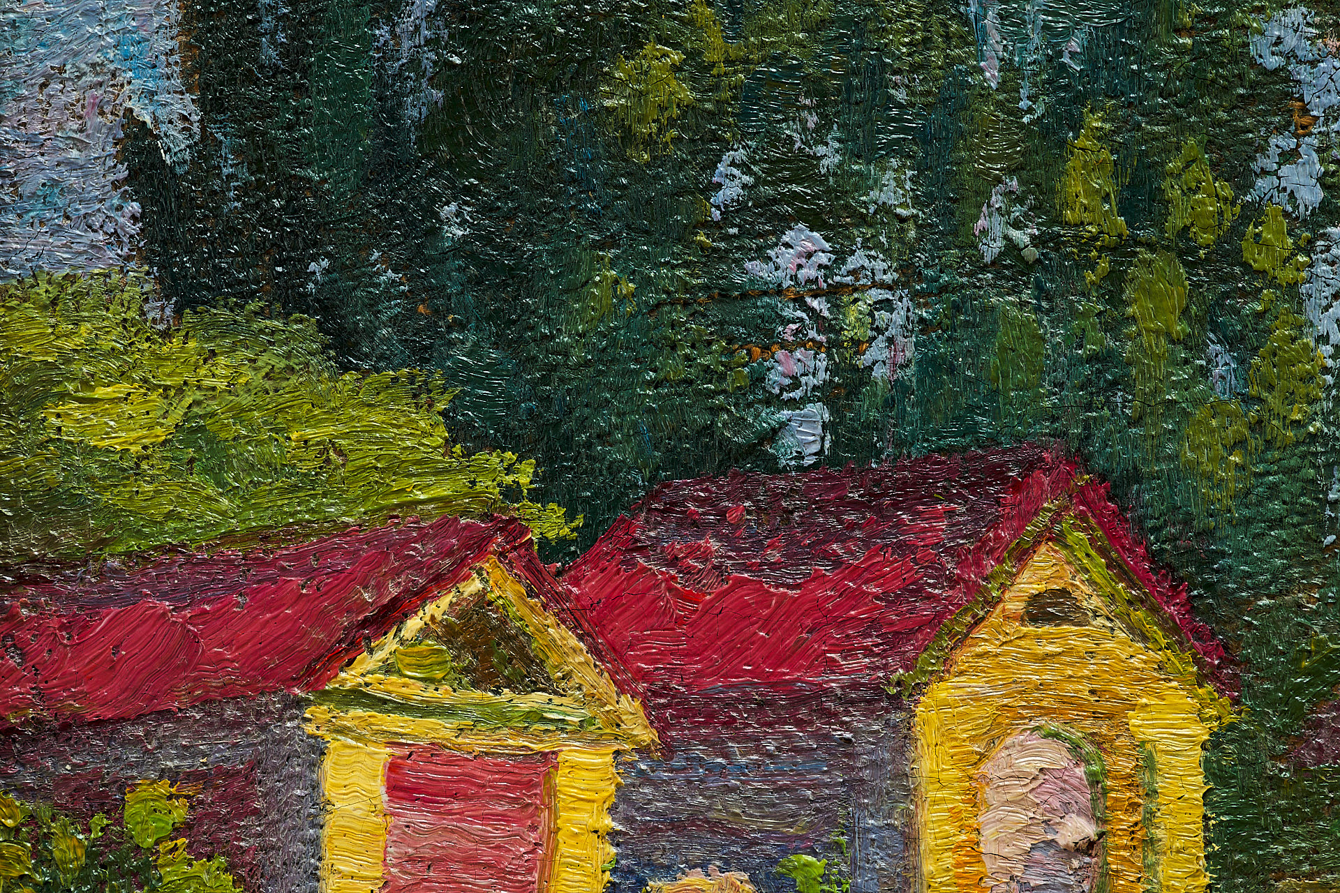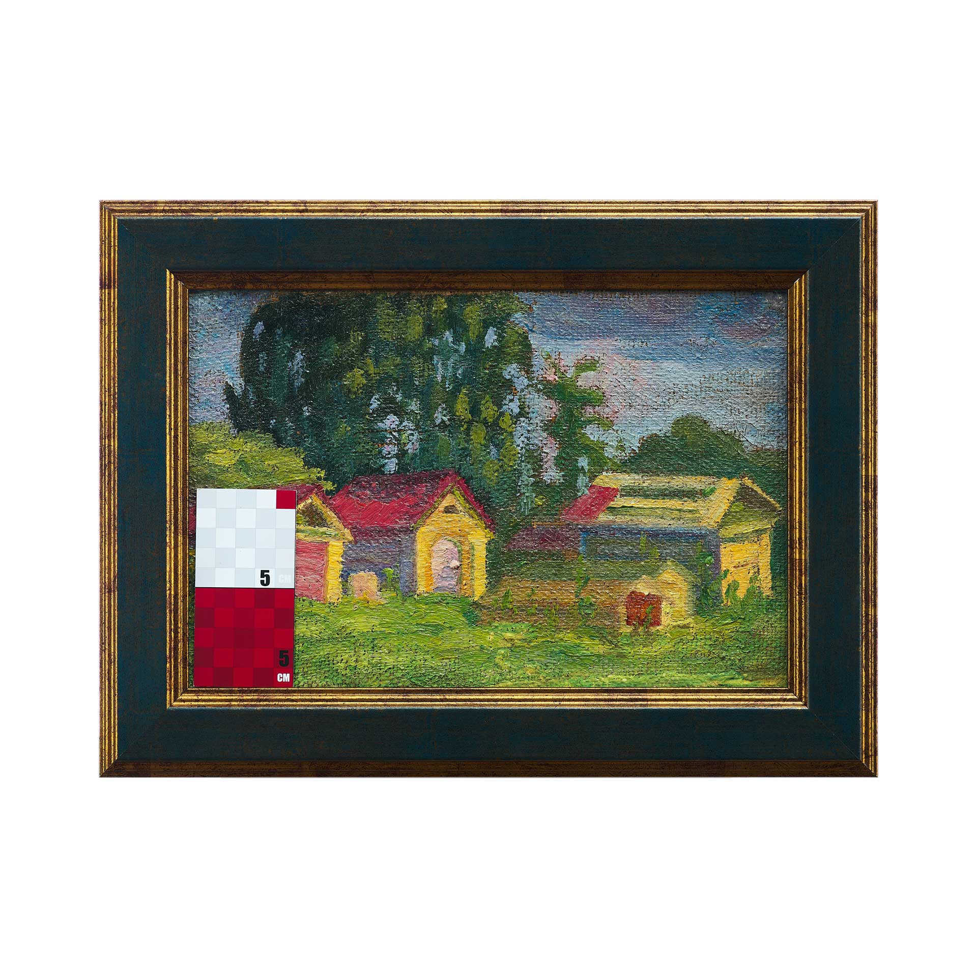 На картине представлен летний пейзаж с домиками. Пейзаж написан в пастозной манере живописи, в сдержанной цветовой гамме, что соответствует живописным приемам близким манере письма И.Д.Шейнберга в 1910-х гг. Подлинность работы не вызывает сомнений.