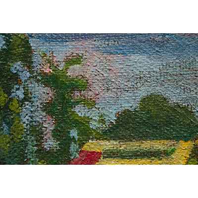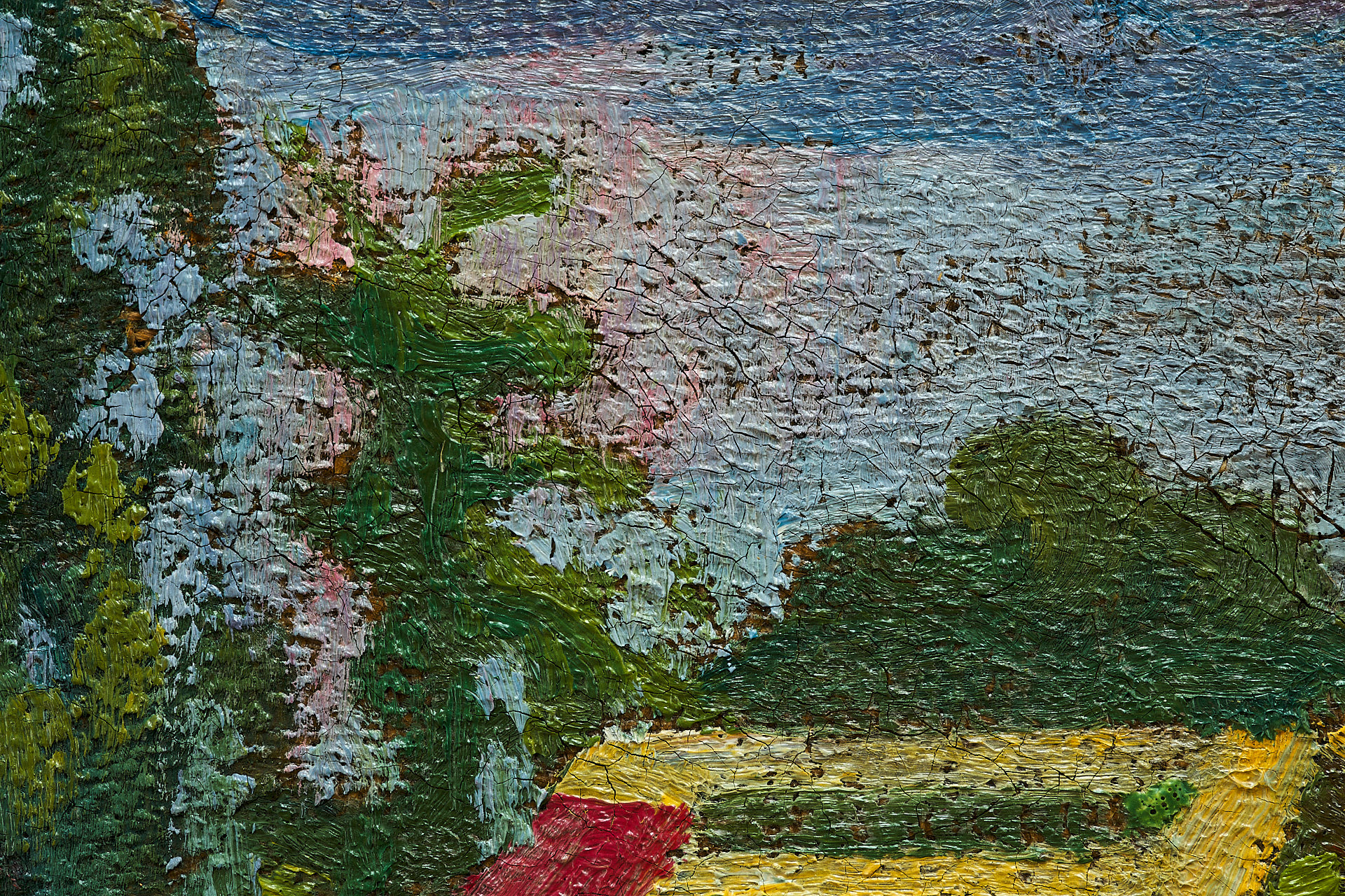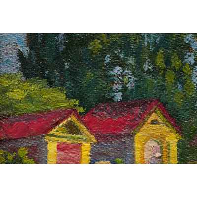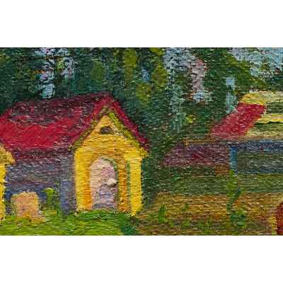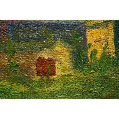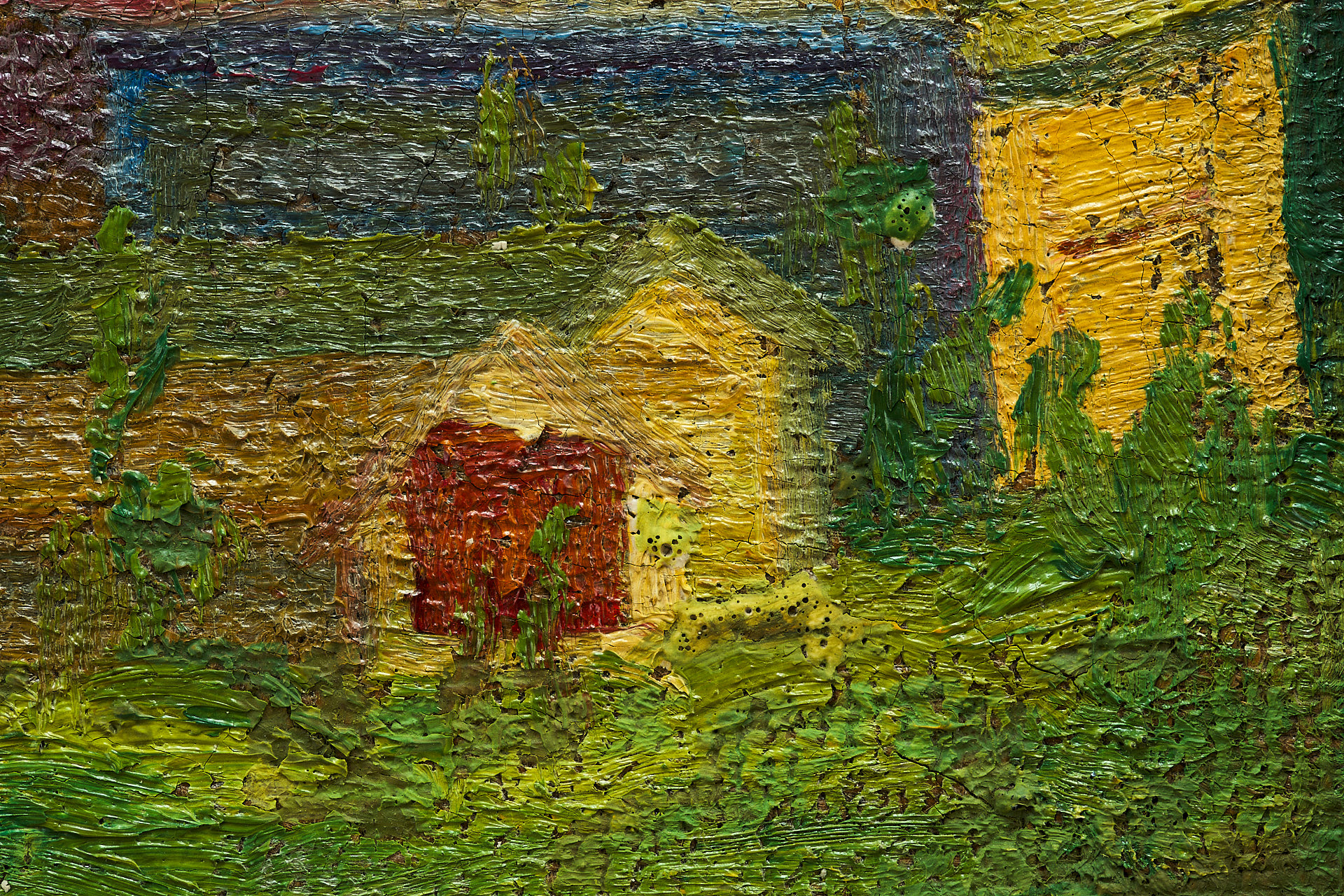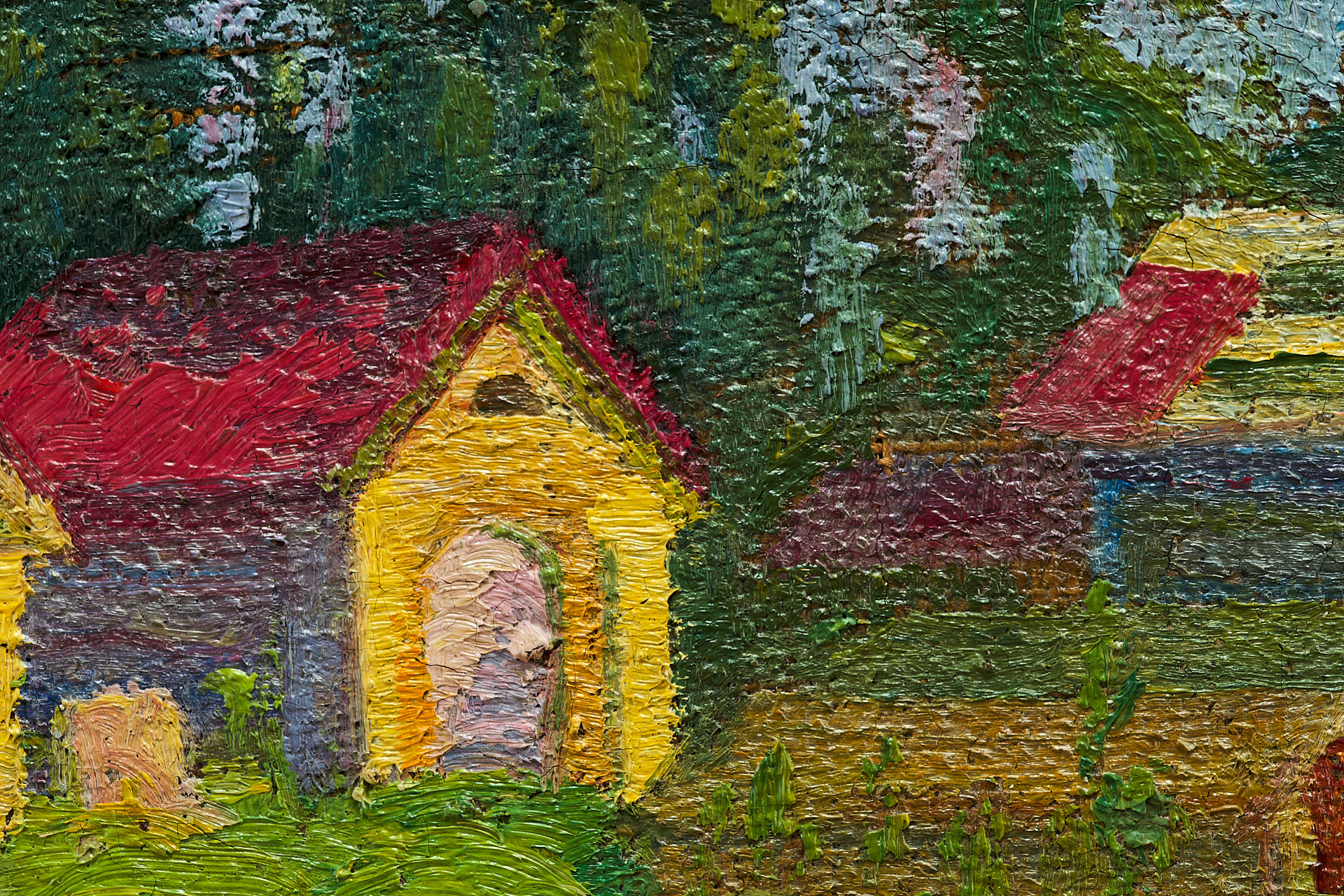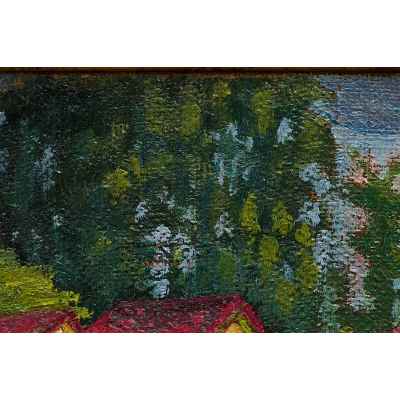 На картине представлен летний пейзаж с домиками. Пейзаж написан в пастозной манере живописи, в сдержанной цветовой гамме, что соответствует живописным приемам близким манере письма И.Д.Шейнберга в 1910-х гг. Подлинность работы не вызывает сомнений.