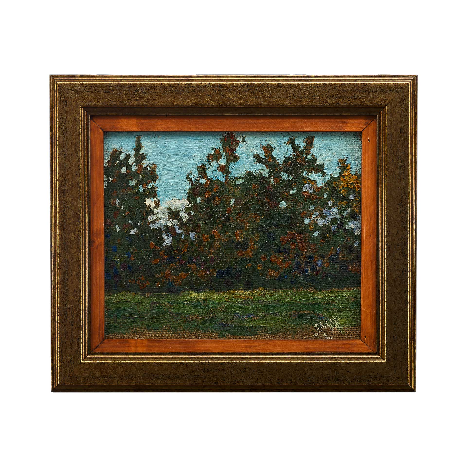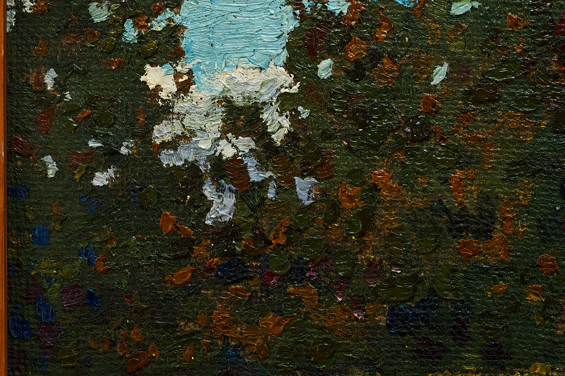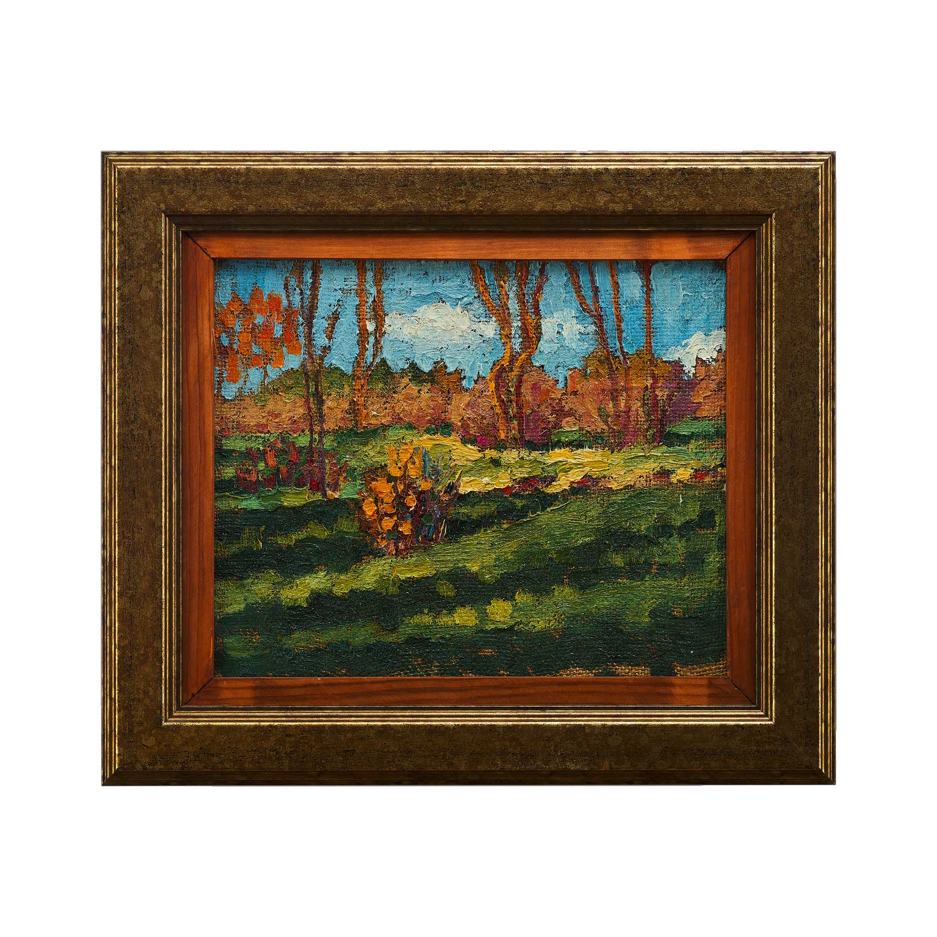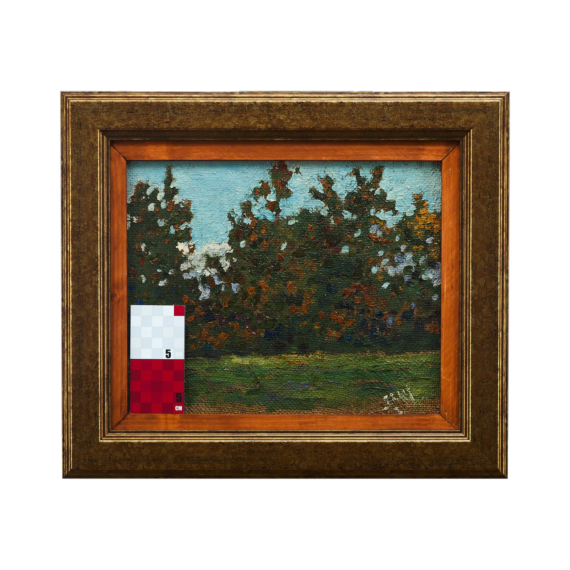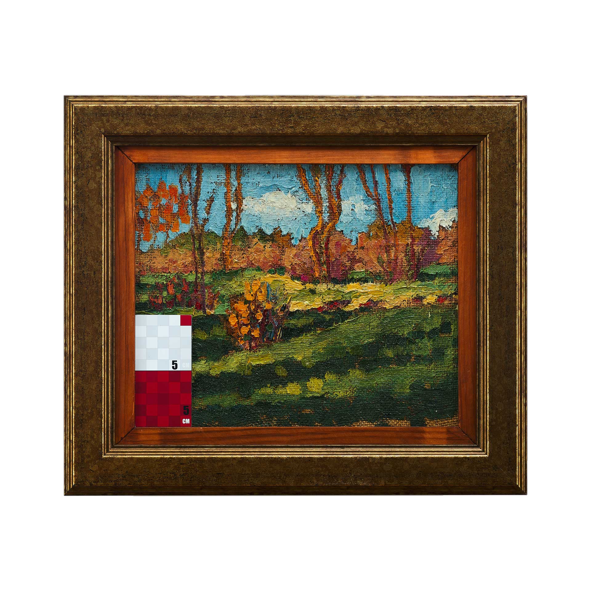 На экспертизу представлен двусторонний этюд, на одной стороне которого изображен пейзаж с деревьями, листья которых чуть тронуты осенью. На обратной стороне изображен яркий солнечный осенний день; зеленая трава с длинными падающими от деревьев тенями на первом плане и ярко-рыжие ку сты на втором плане. Этюды написаны в яркой цветовой гамме, что соответствует живописным приемам близким манере письма И.Д. Шейнберга в 1910-х гг. Подлинность работ не вызывает сомнений.
