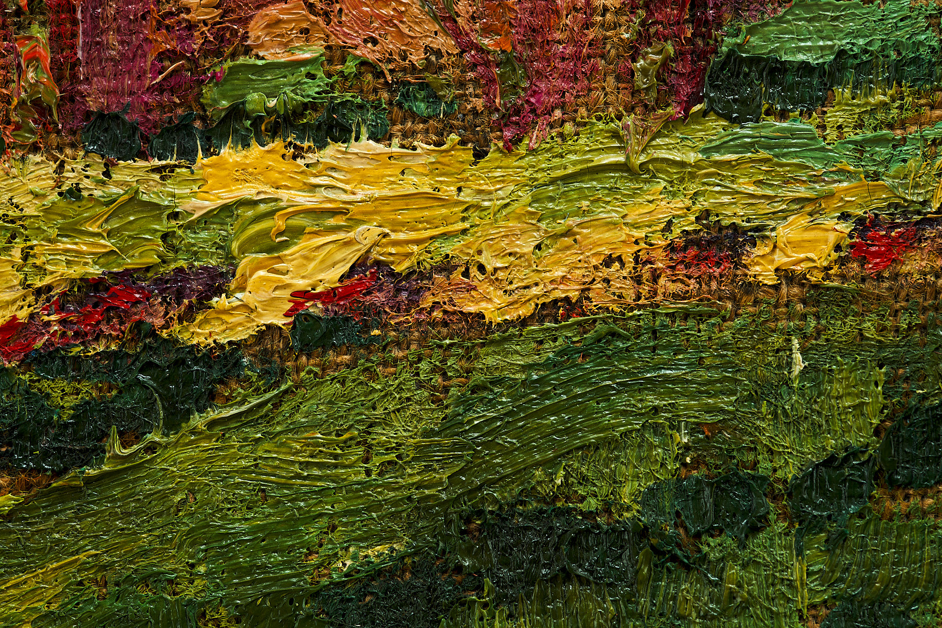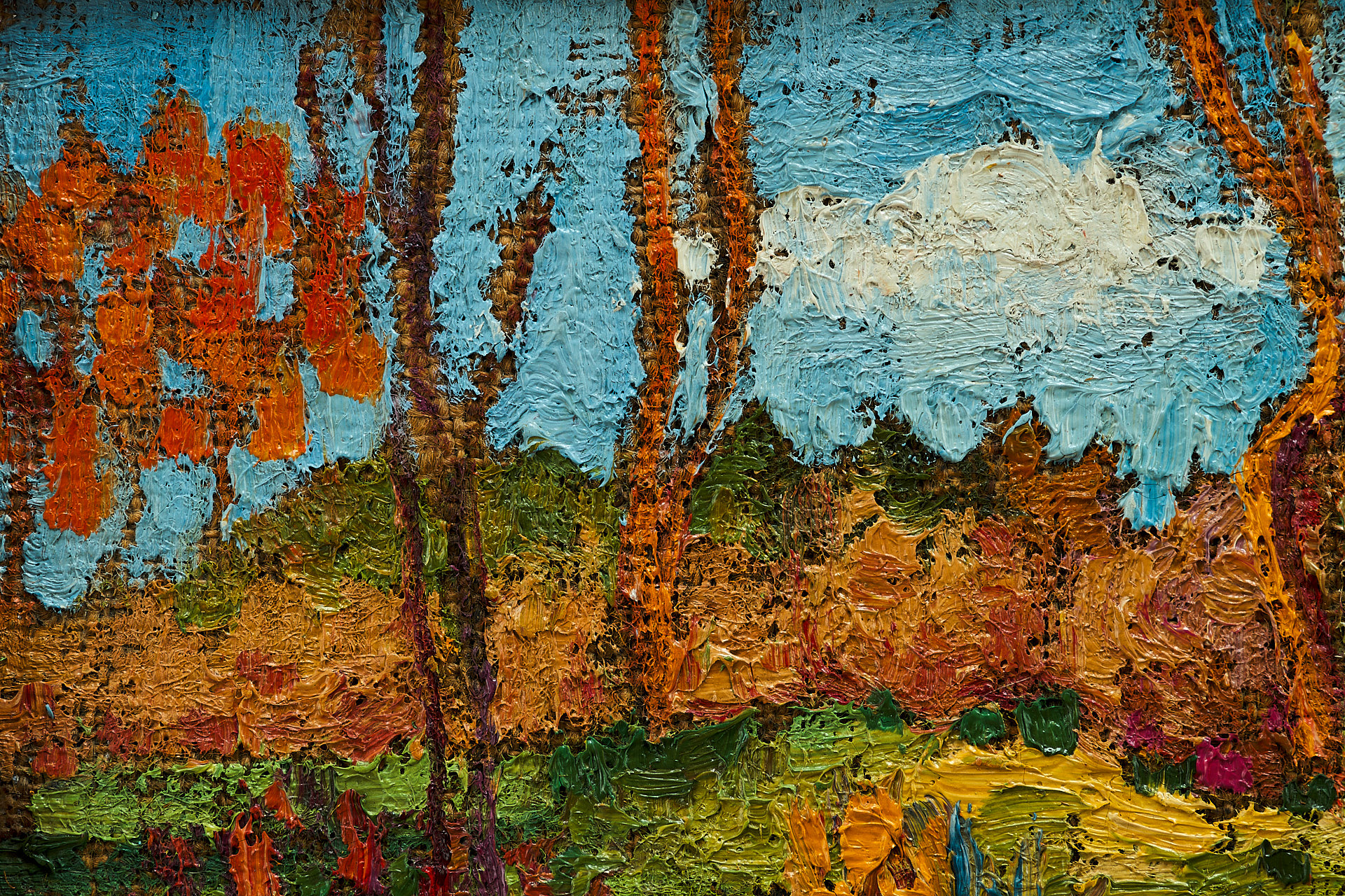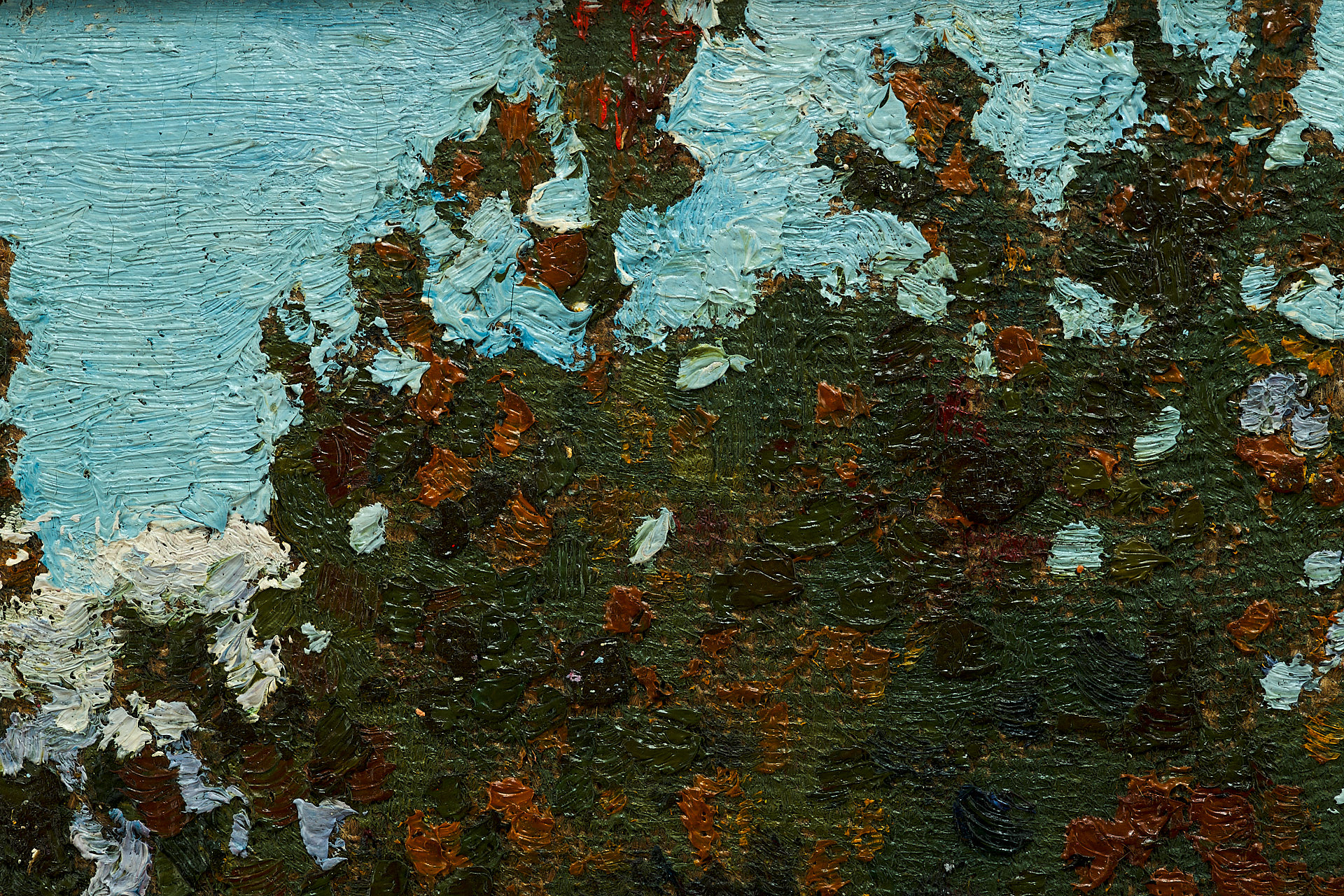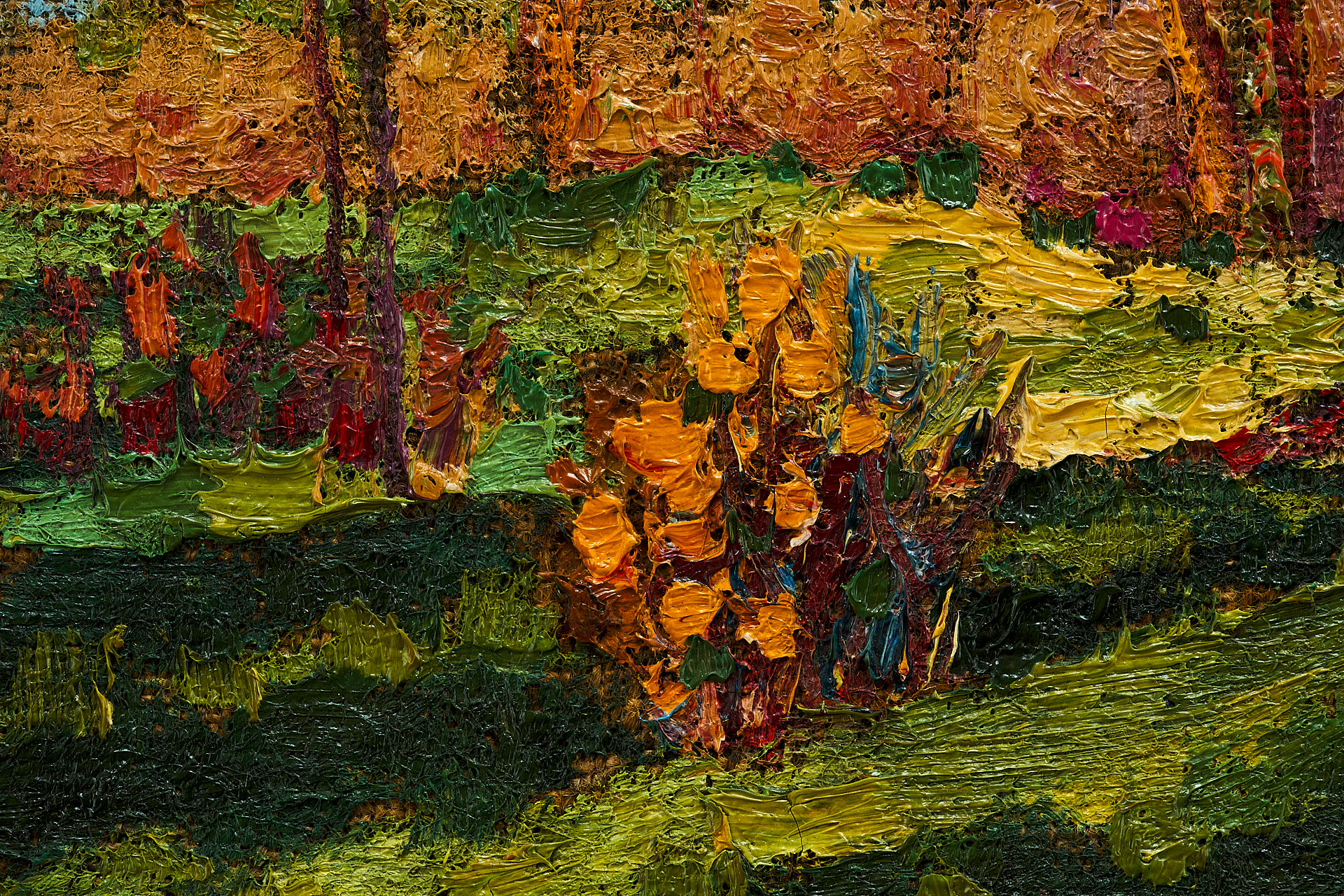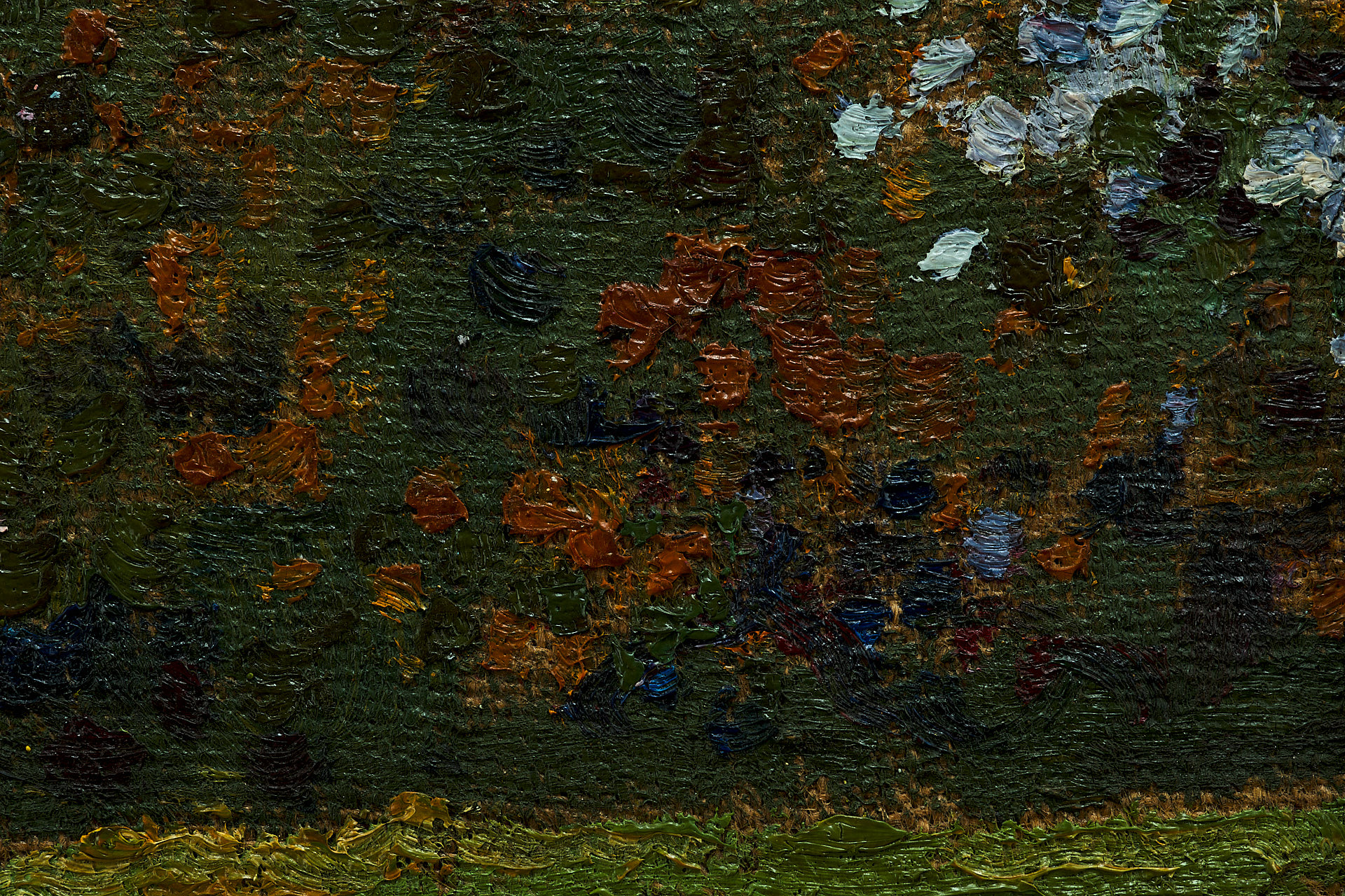 На экспертизу представлен двусторонний этюд, на одной стороне которого изображен пейзаж с деревьями, листья которых чуть тронуты осенью. На обратной стороне изображен яркий солнечный осенний день; зеленая трава с длинными падающими от деревьев тенями на первом плане и ярко-рыжие ку сты на втором плане. Этюды написаны в яркой цветовой гамме, что соответствует живописным приемам близким манере письма И.Д. Шейнберга в 1910-х гг. Подлинность работ не вызывает сомнений.