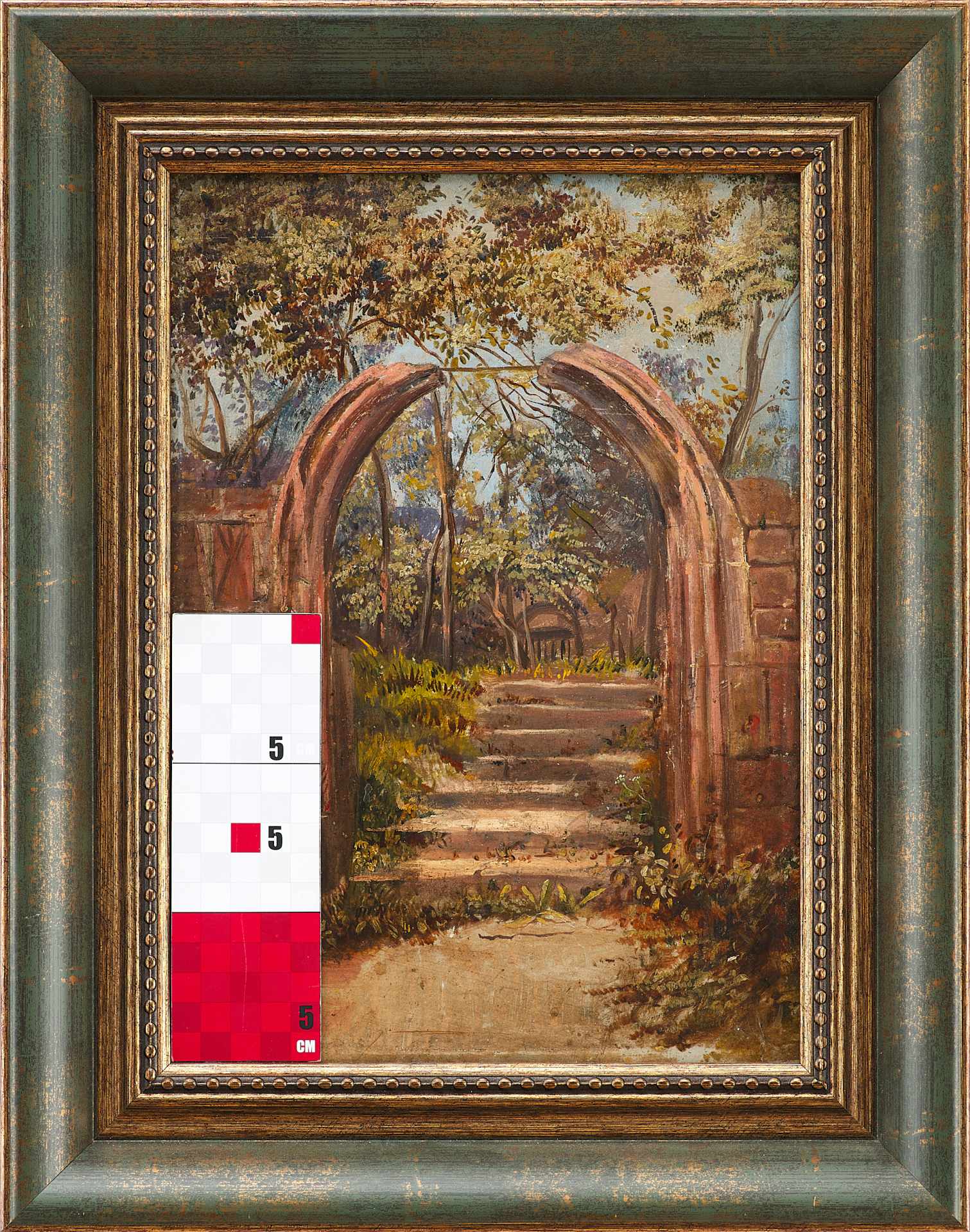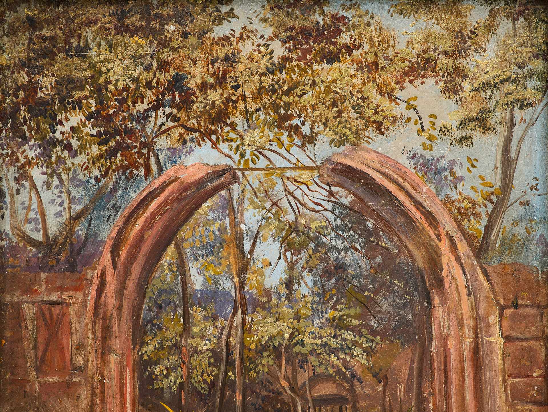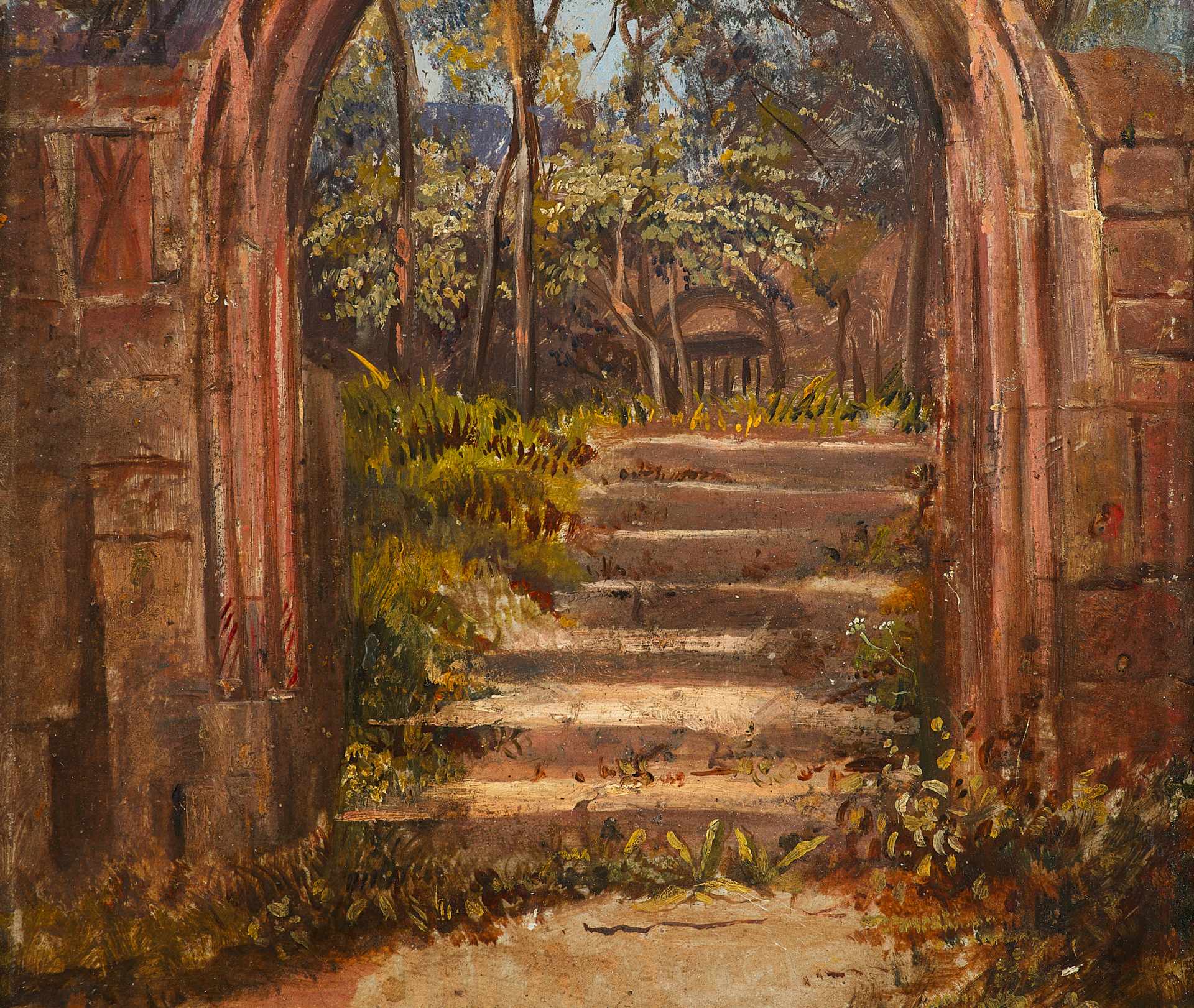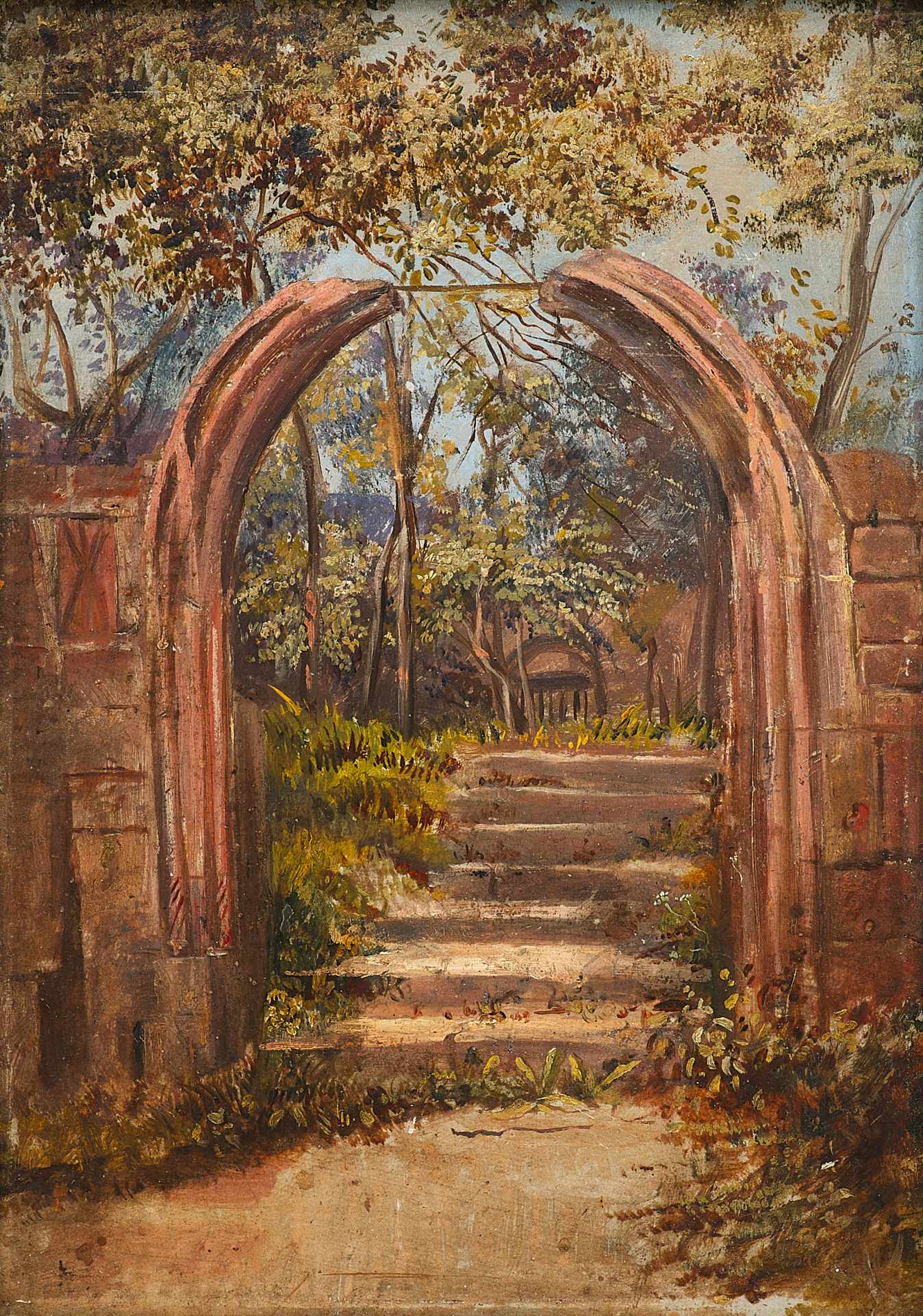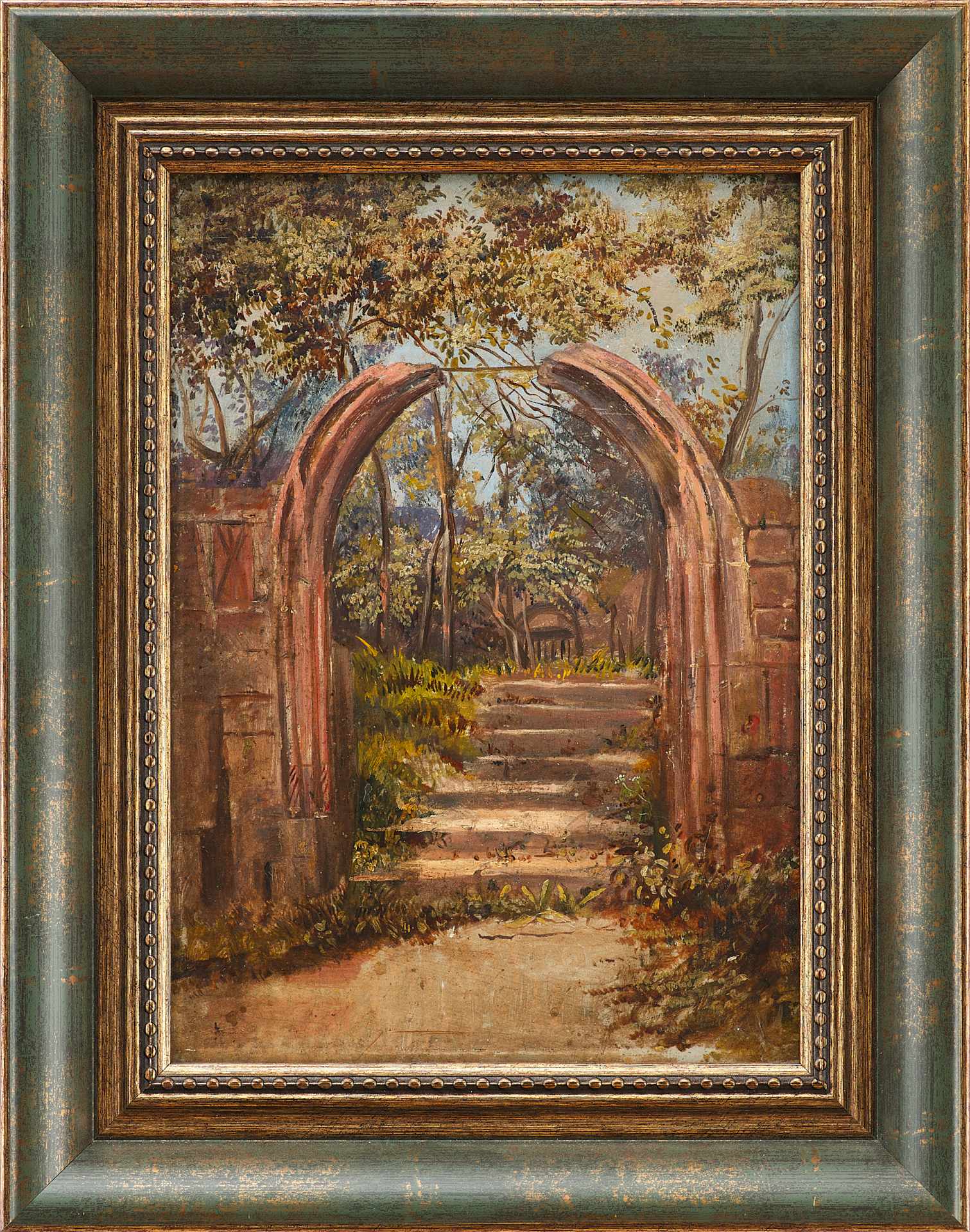 На переднем плане летнего пейзажа арочный портал со следами разрушения сверху, слева и справа фрагменты каменного забора. Несколько, заросших травой, ступеней ведет в сад, засаженный деревьями и кустами . В глубине сада с высокими деревьями виднеются очертания ротонды.