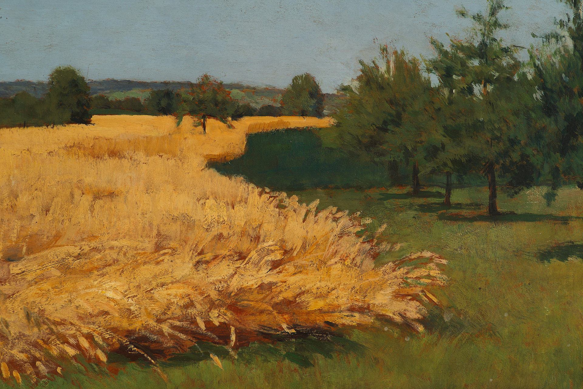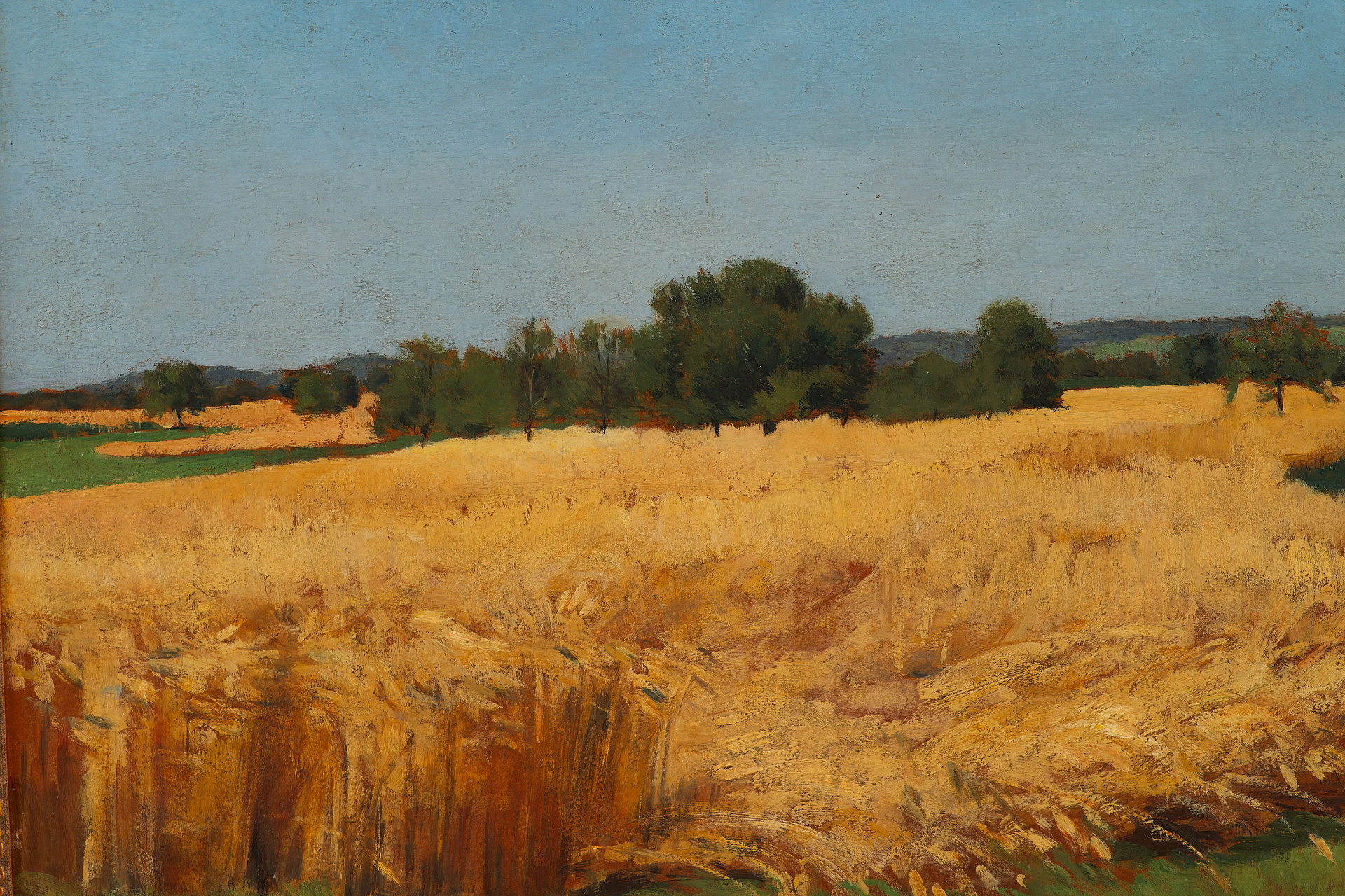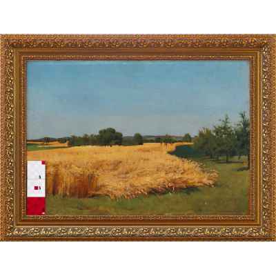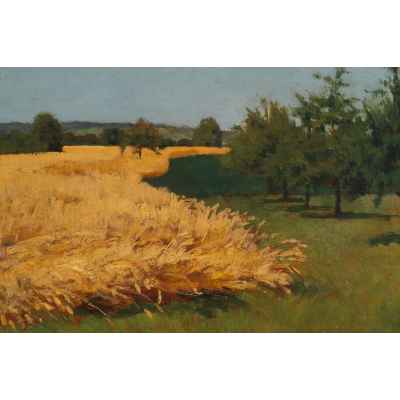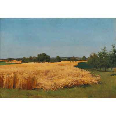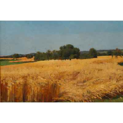 Произведение имеет прямоугольный формат, композиция горизонтальная. На картине изображена равнина на которой растст золотистая рожь. Словно река она простирается по всей повсрхности, обходя деревья и кустарники. На переднем плаяе равнина покрыта ярко-зеленой правой. Фоном картины является высокое светло-голубое небо.