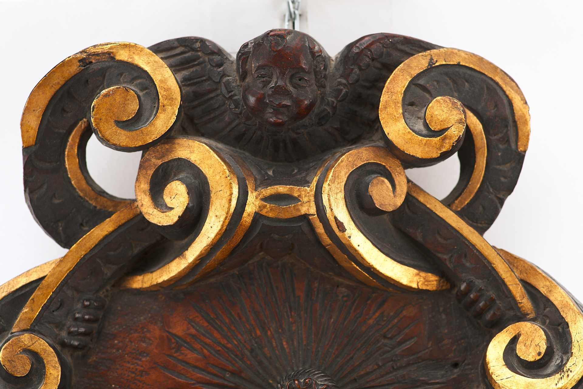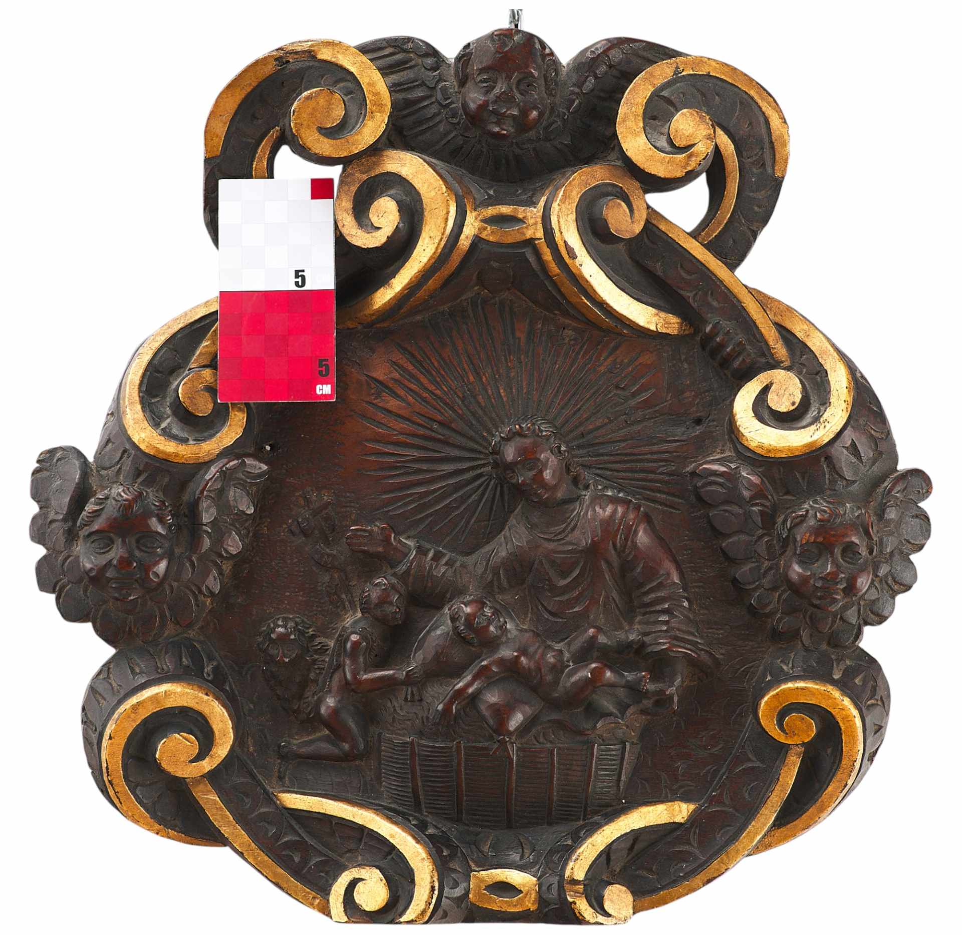 Херувим - один из высших чинов небесной иерархии, самое высшее из духовных существ, ближайшее к Богу. В деревянной резьбе представляются чаще всего в виде головки, окруженной крыльями. Европейская резная пластика XVII века отличается богатством и тонкостью моделировки. Уделялось внимание контрастам освещения, интенсивности и направленности света, с помощью которого выявляются детали пластической формы. По своим художественным признакам горельеф относится к произведениям европейских мастерских второй половины XVII века.