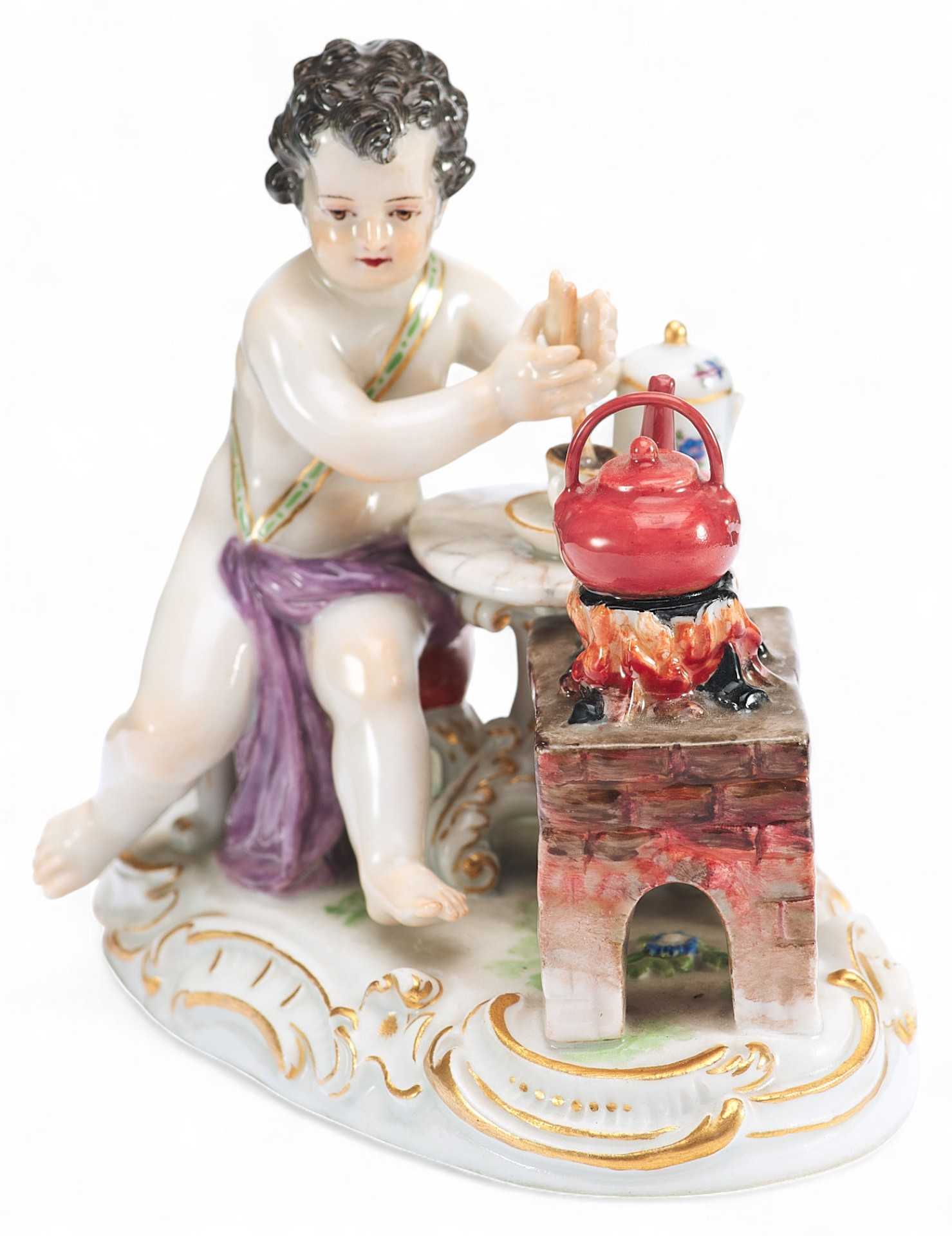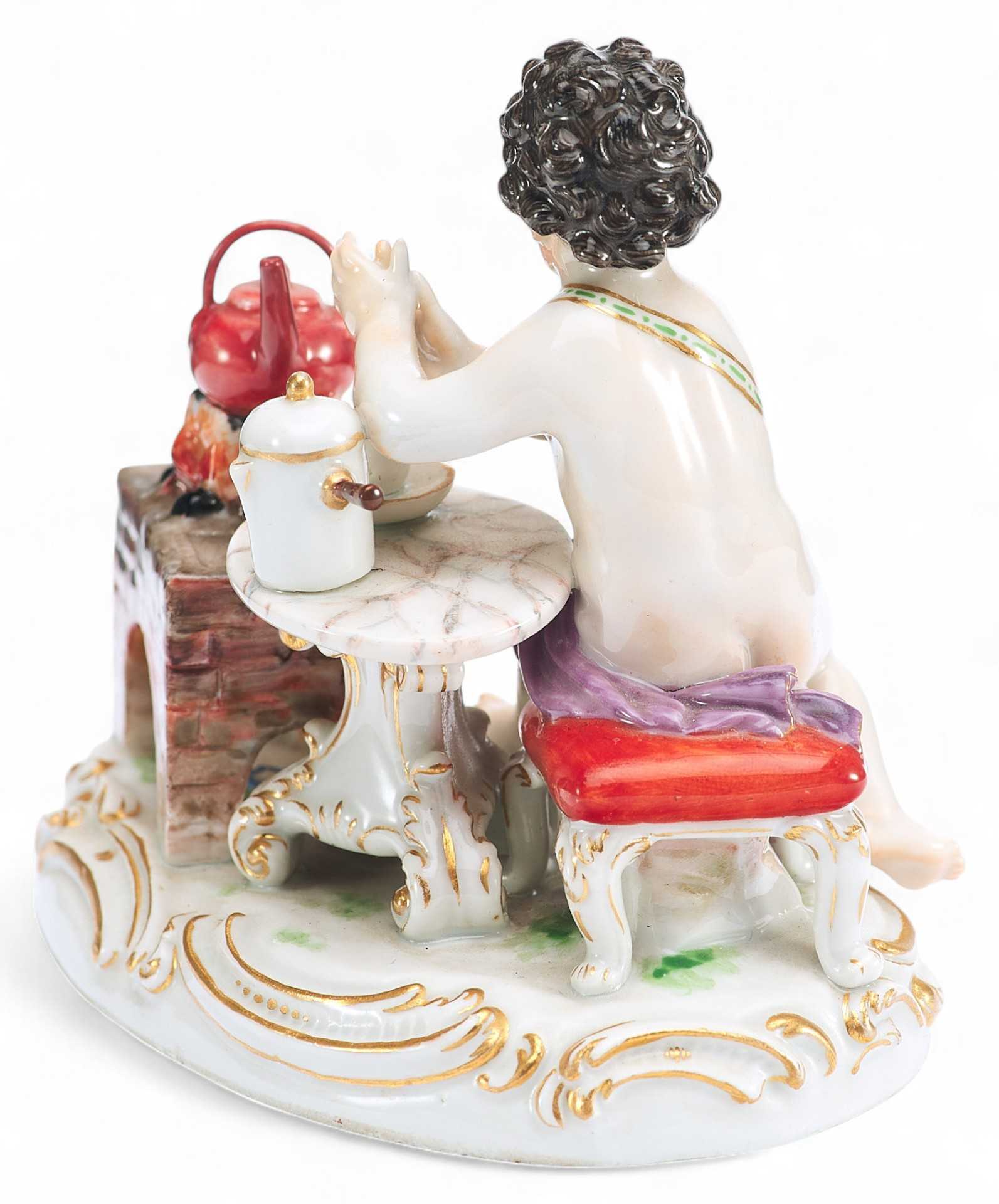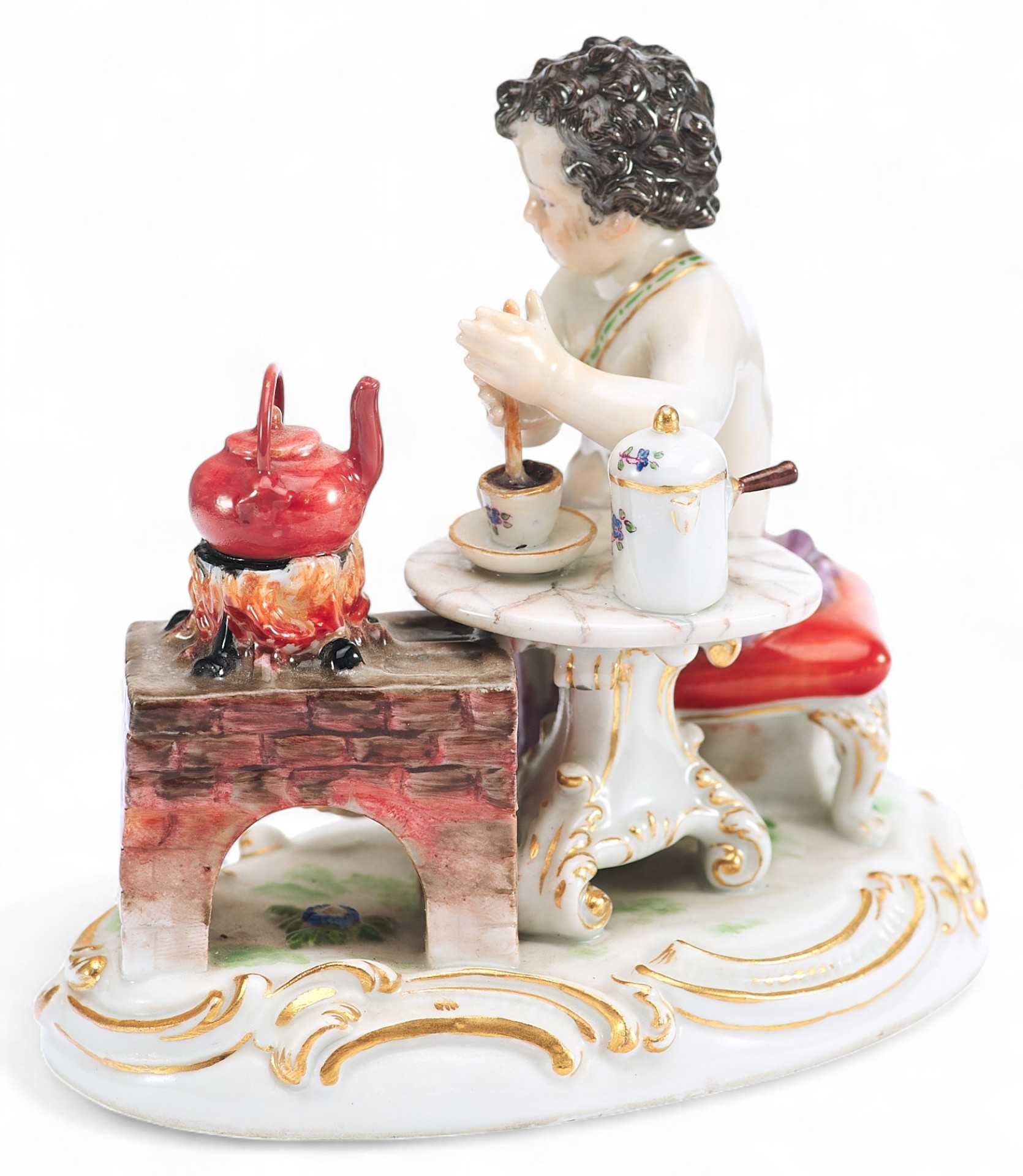 Представлена фарфоровая скульптура пути, варящего любовное зелье, скорее всего шоколад, в чашечке. На огне закипает красный чайник. На основании скульптуры клейма: 1. Синее подглазурное клеймо Мейсенской фарфоровой мануфактуры