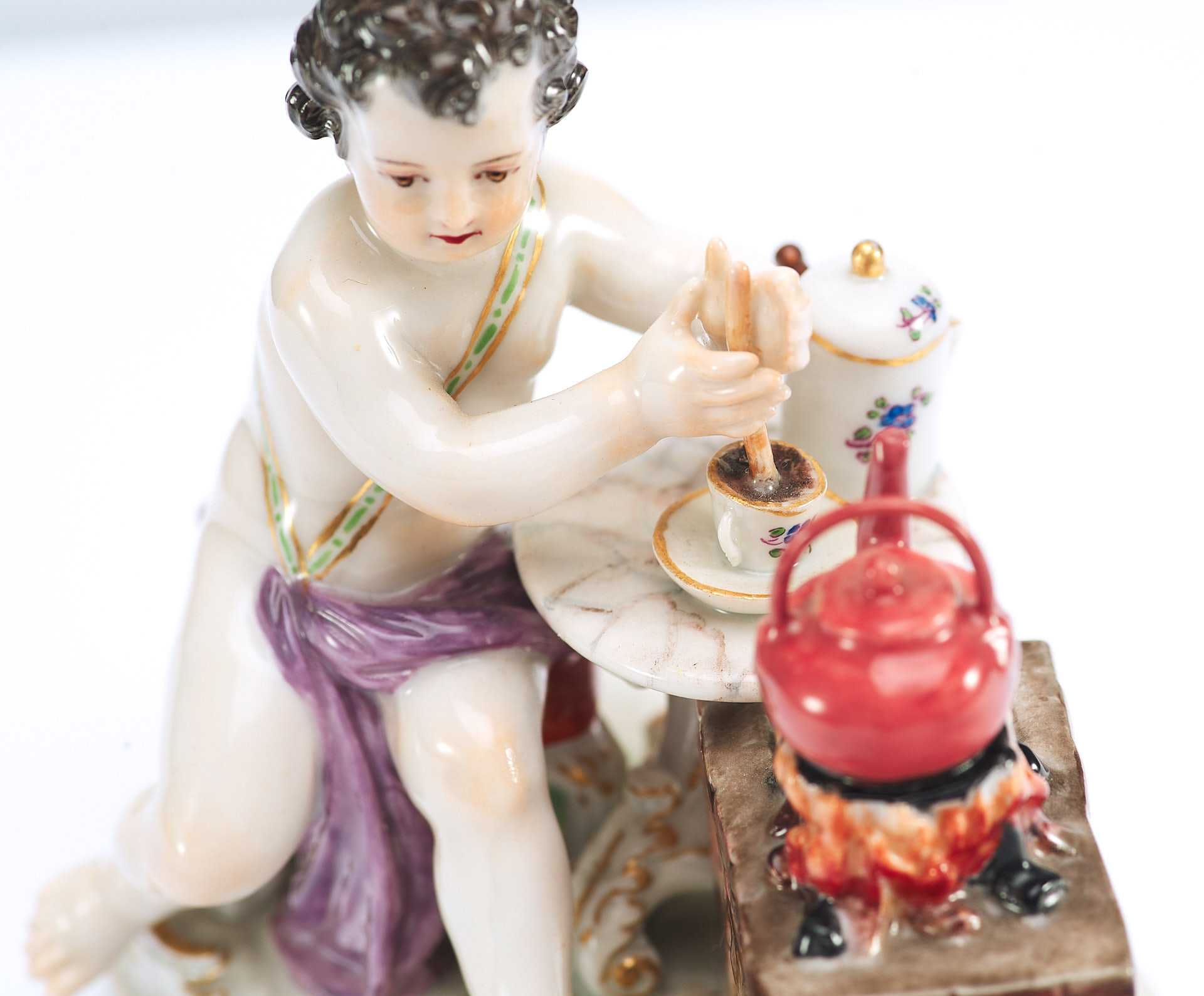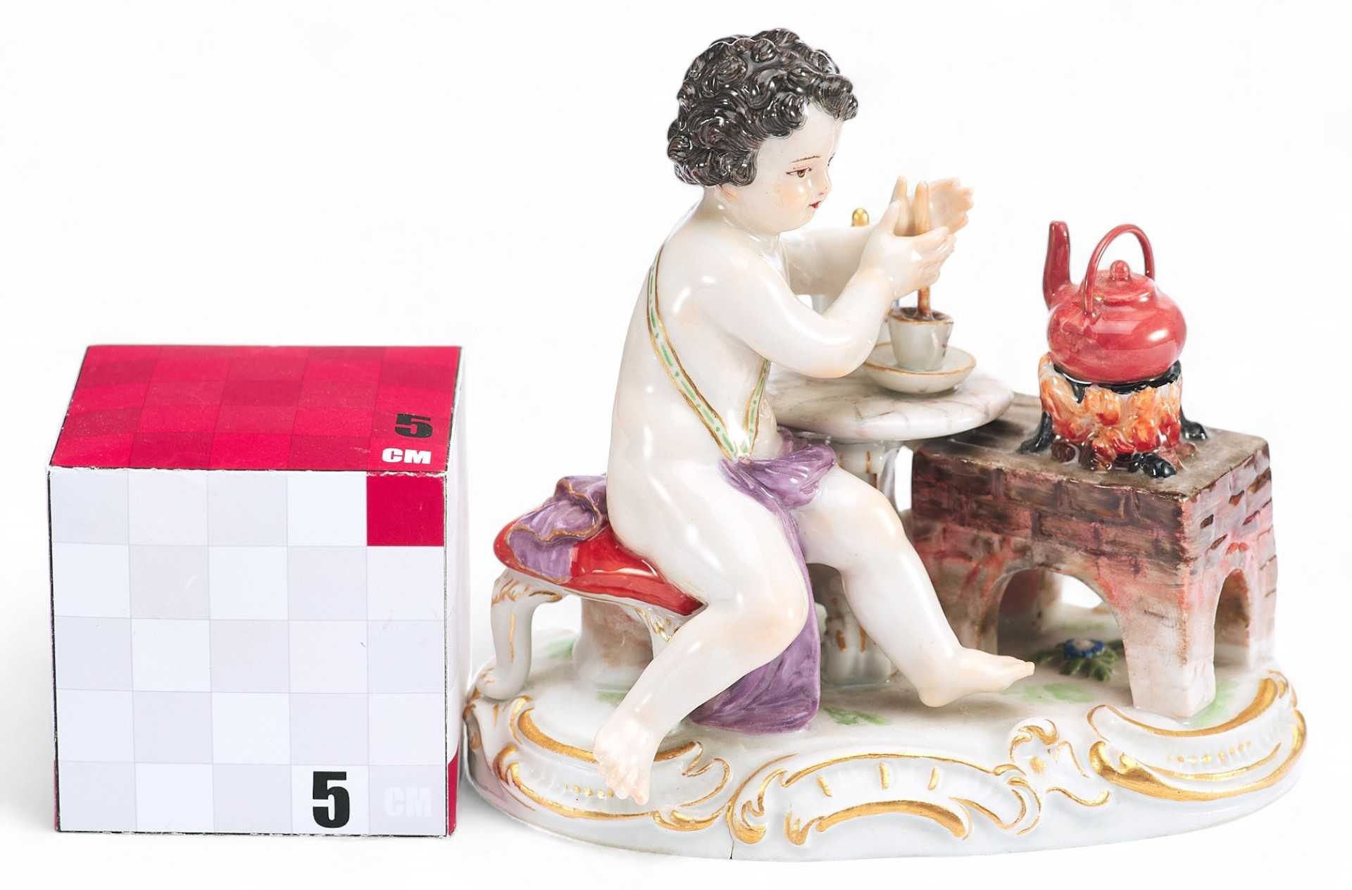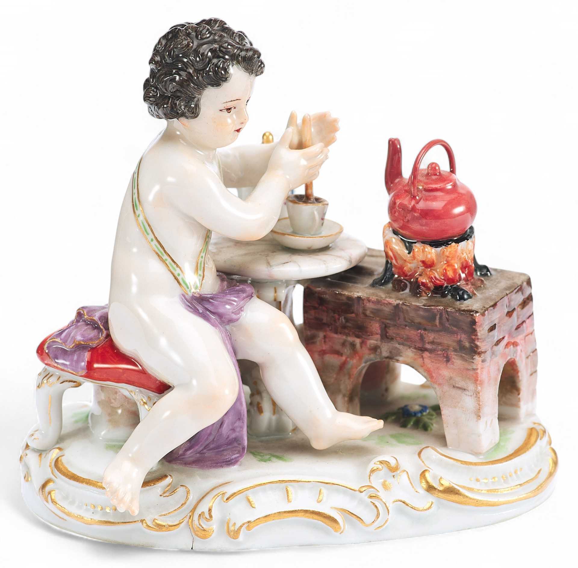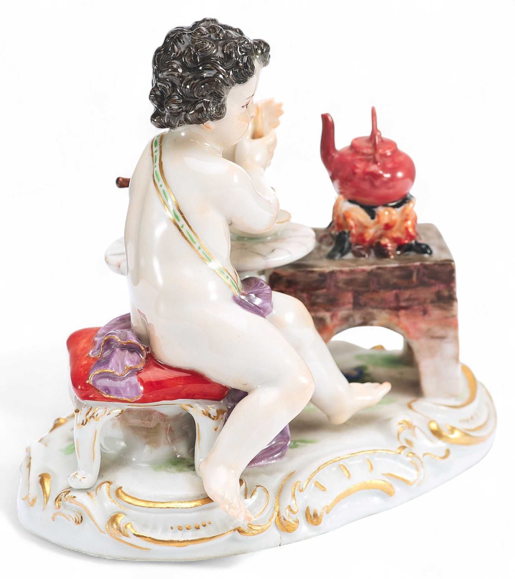 Представлена фарфоровая скульптура пути, варящего любовное зелье, скорее всего шоколад, в чашечке. На огне закипает красный чайник. На основании скульптуры клейма: 1. Синее подглазурное клеймо Мейсенской фарфоровой мануфактуры