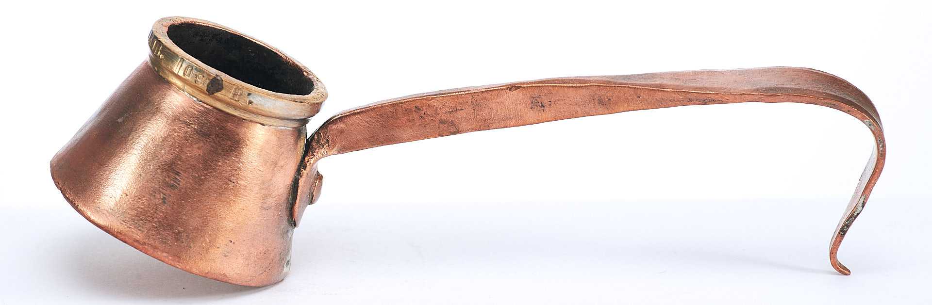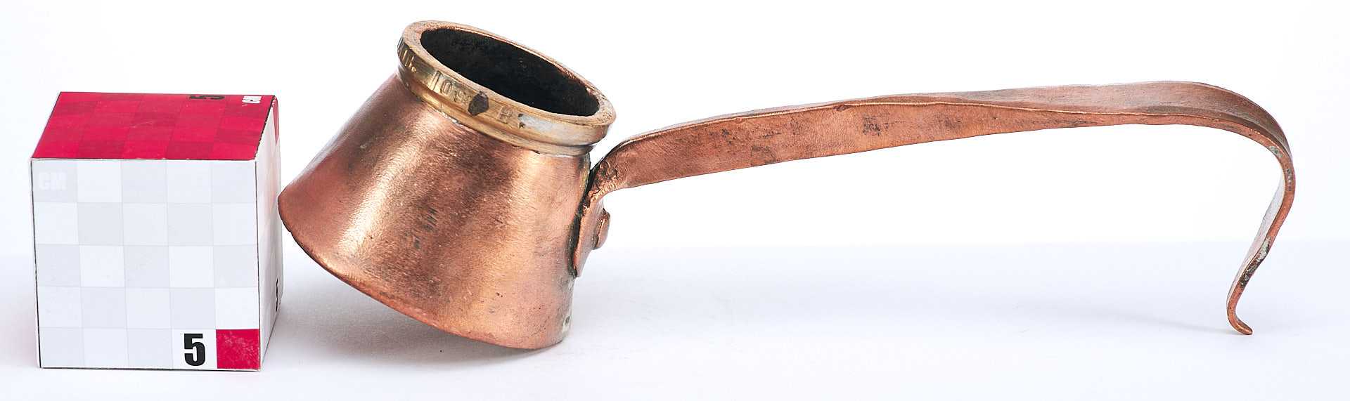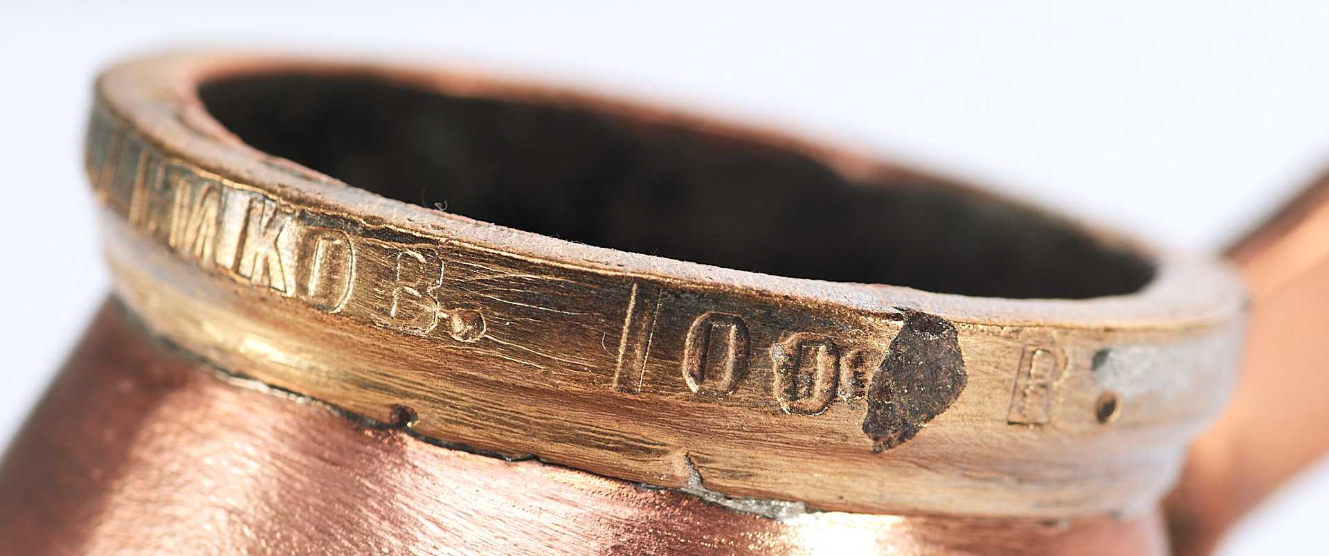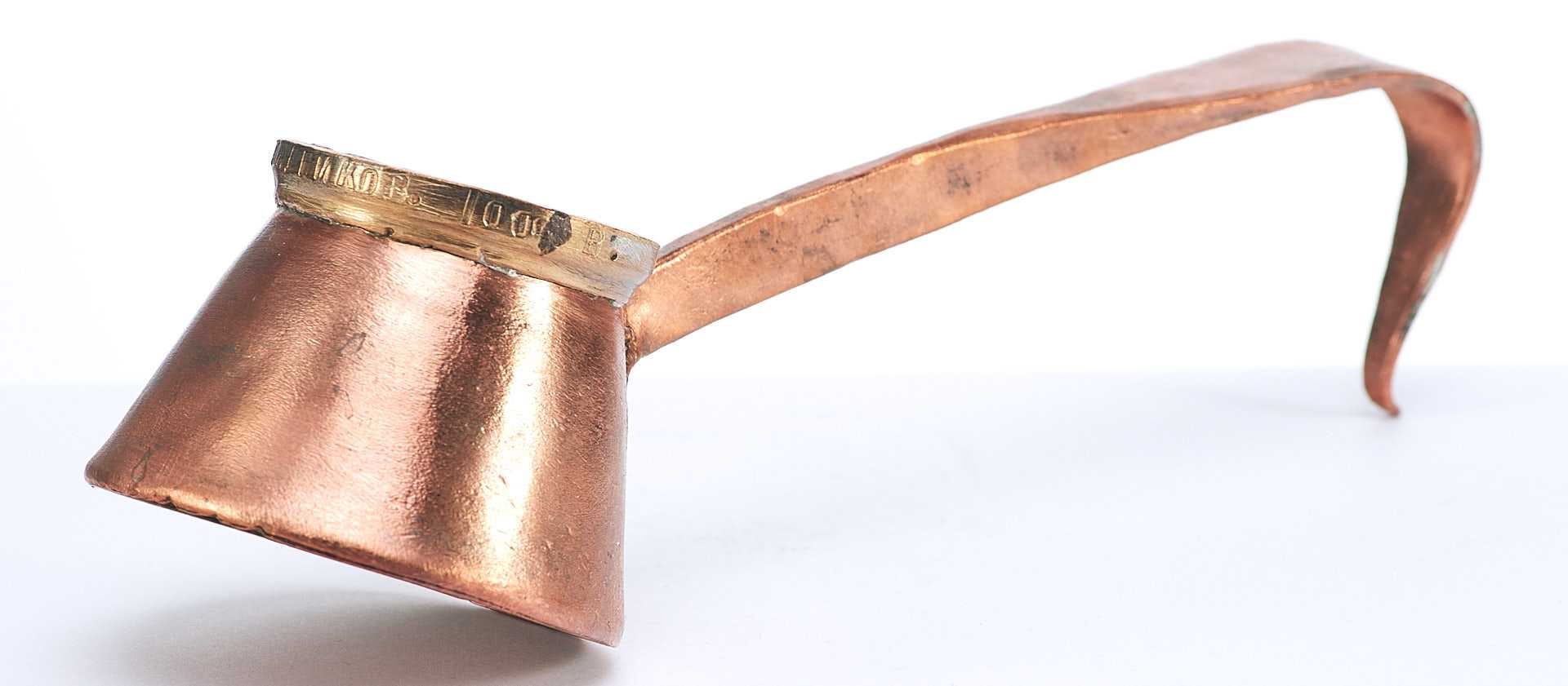 Представлена стандартная мерка для жидких тел. Такие мерки использовались в кабаках и трактирах дореволюционной России. Такой объем назывался крючокъ (корецъ) - кабацкая мерка водки, примерно одна чарка (1/10 штофа). На мерке по верхнему краю надпись: «Перм П. И.Безукладников 100 В.».