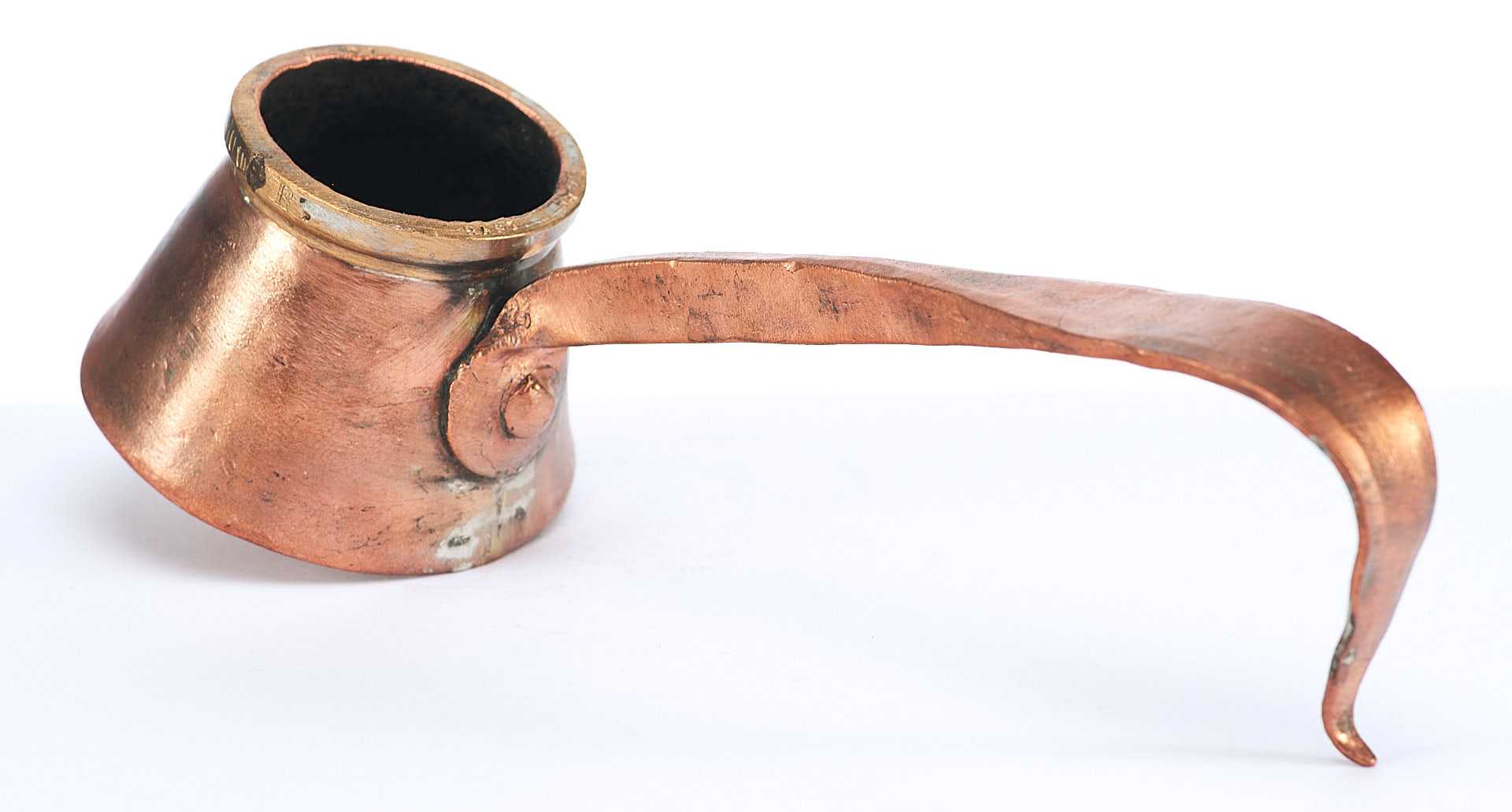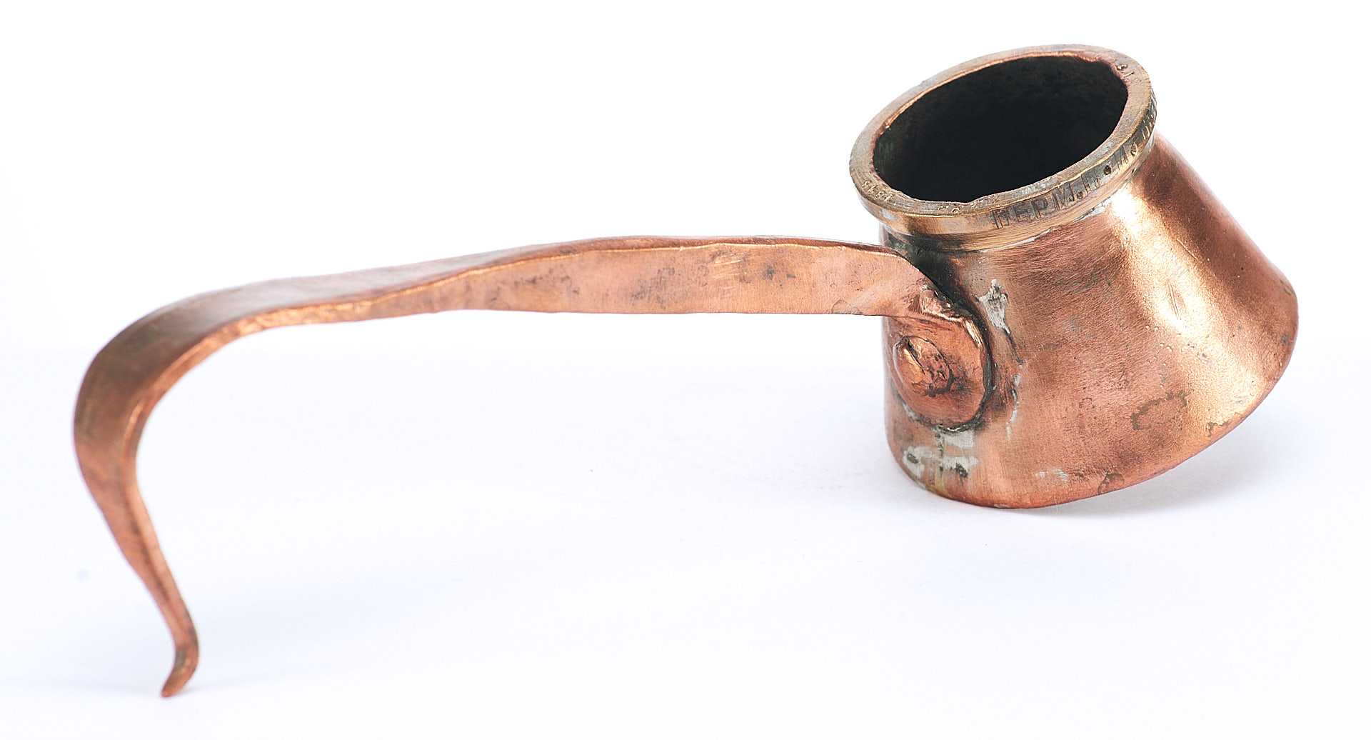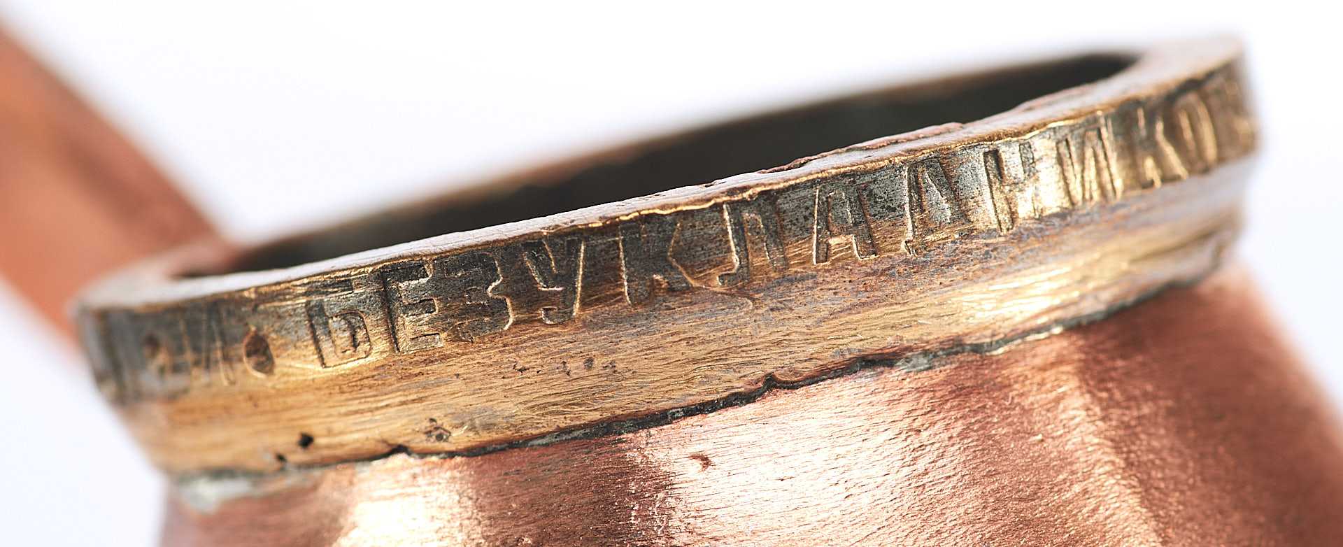 Представлена стандартная мерка для жидких тел. Такие мерки использовались в кабаках и трактирах дореволюционной России. Такой объем назывался крючокъ (корецъ) - кабацкая мерка водки, примерно одна чарка (1/10 штофа). На мерке по верхнему краю надпись: «Перм П. И.Безукладников 100 В.».