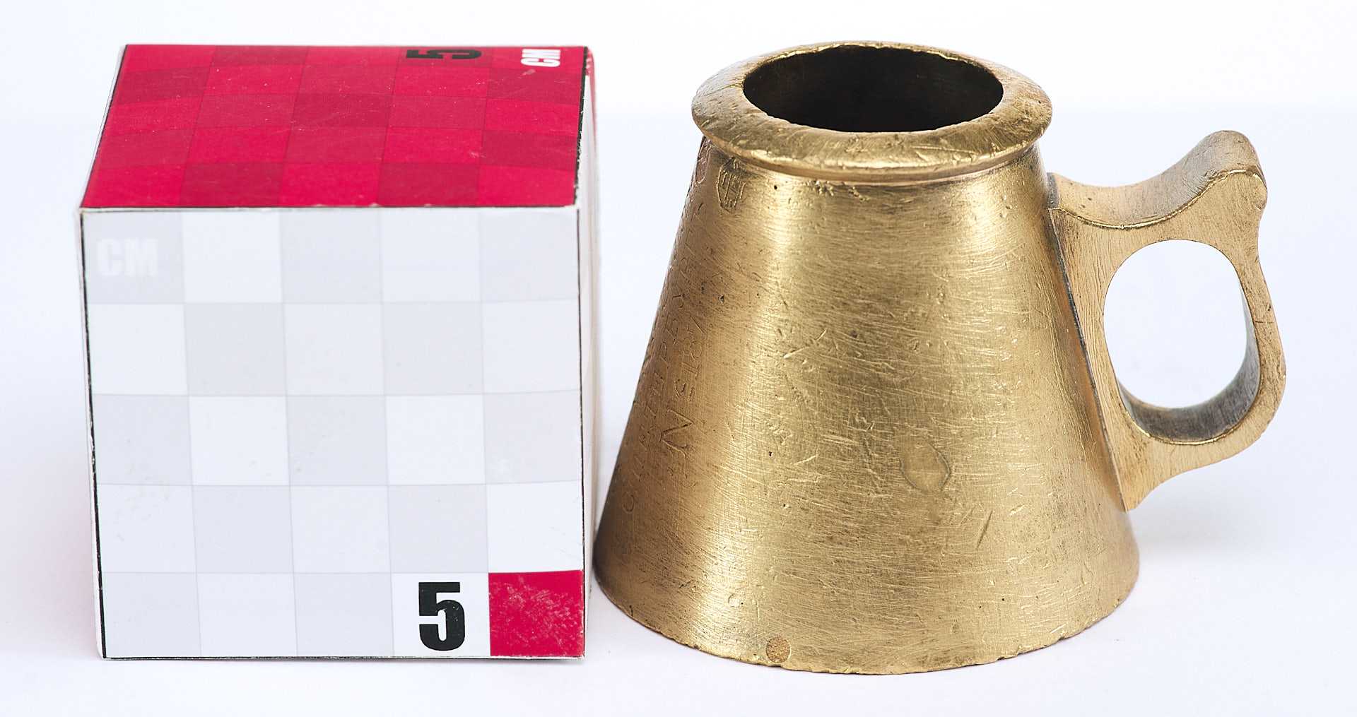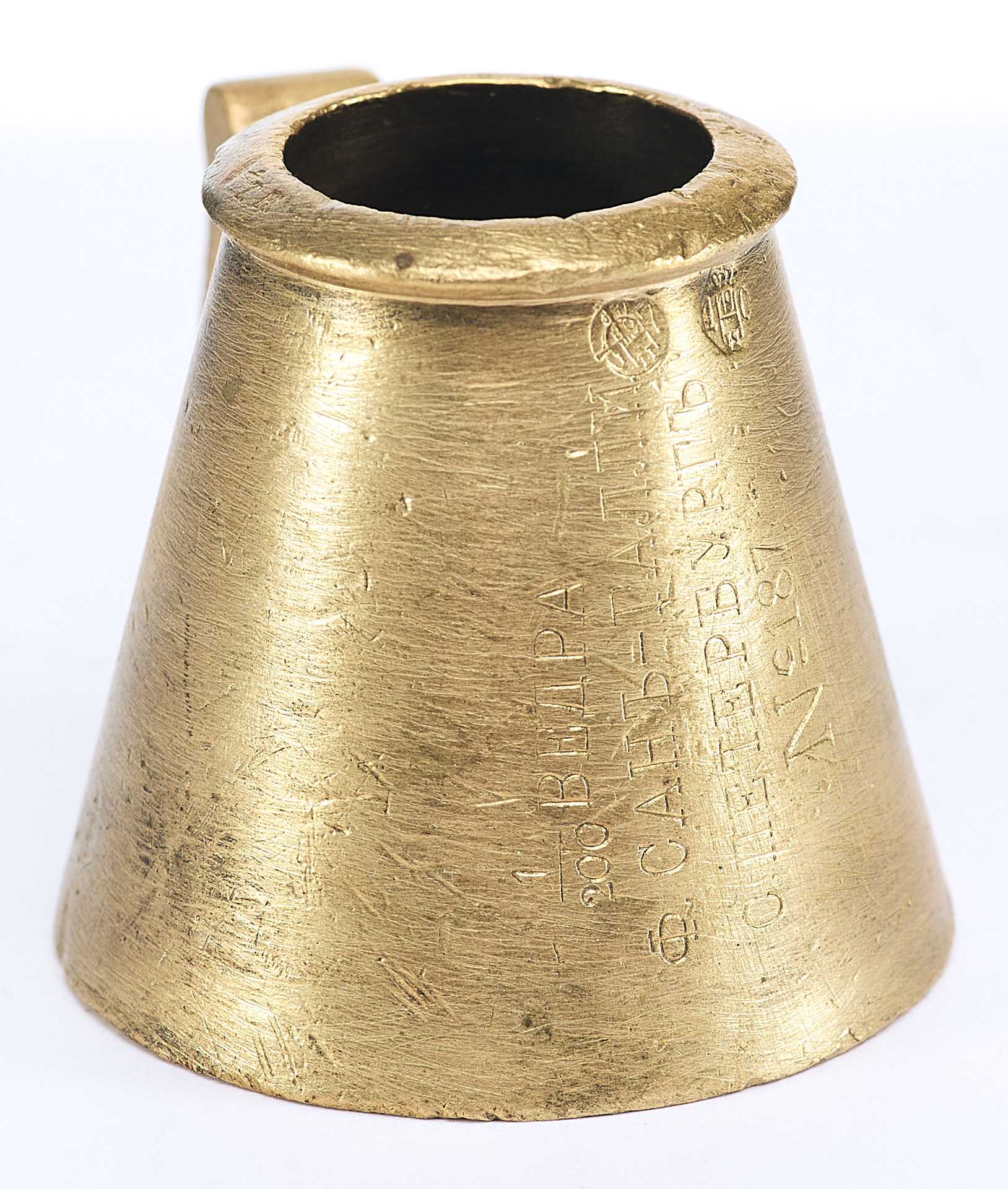 Представлена стандартная мерка для жидких тел («винная мера»). Такие мерки использовались в кабаках, трактирах, бакалеях, лавках дореволюционной России.