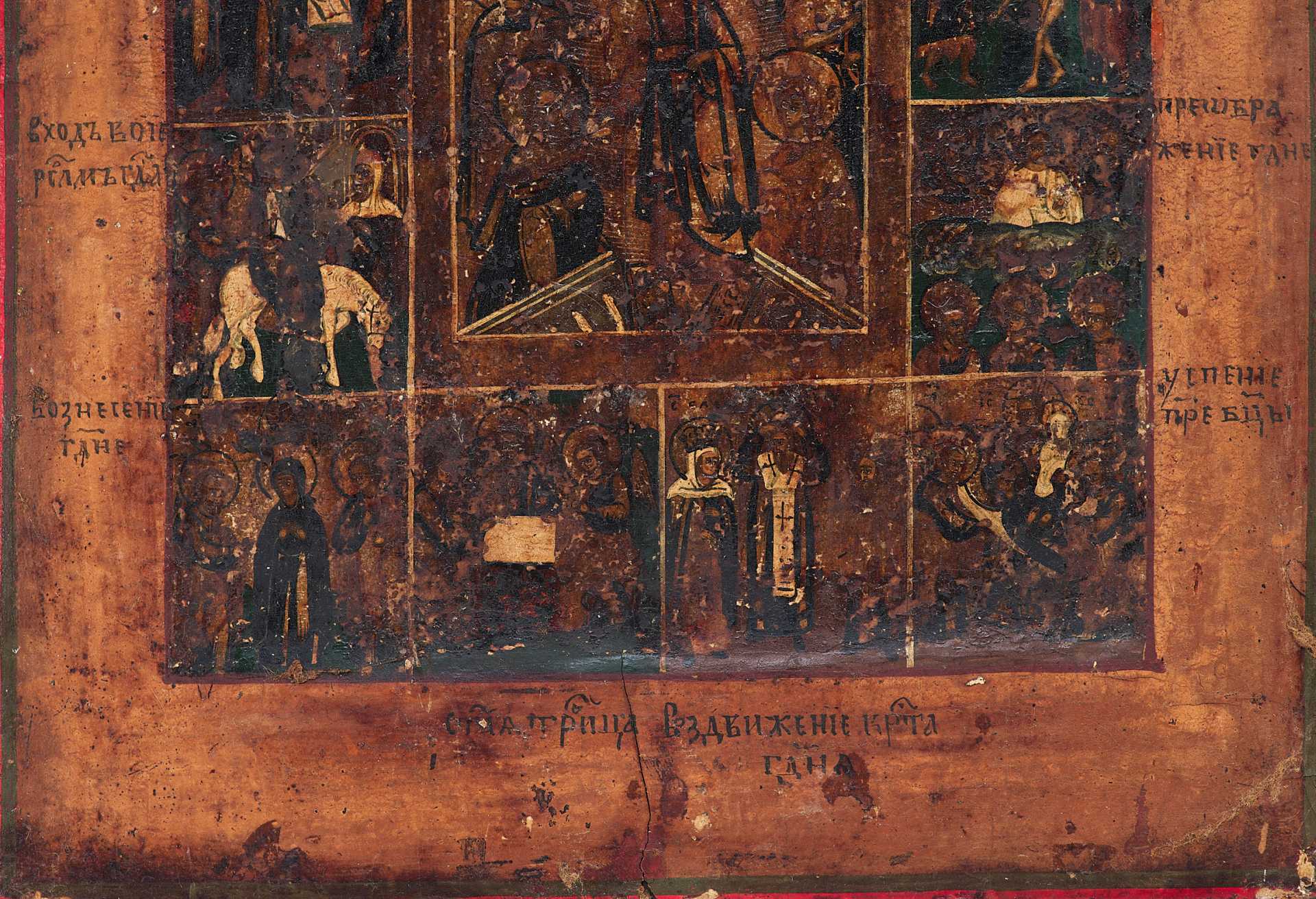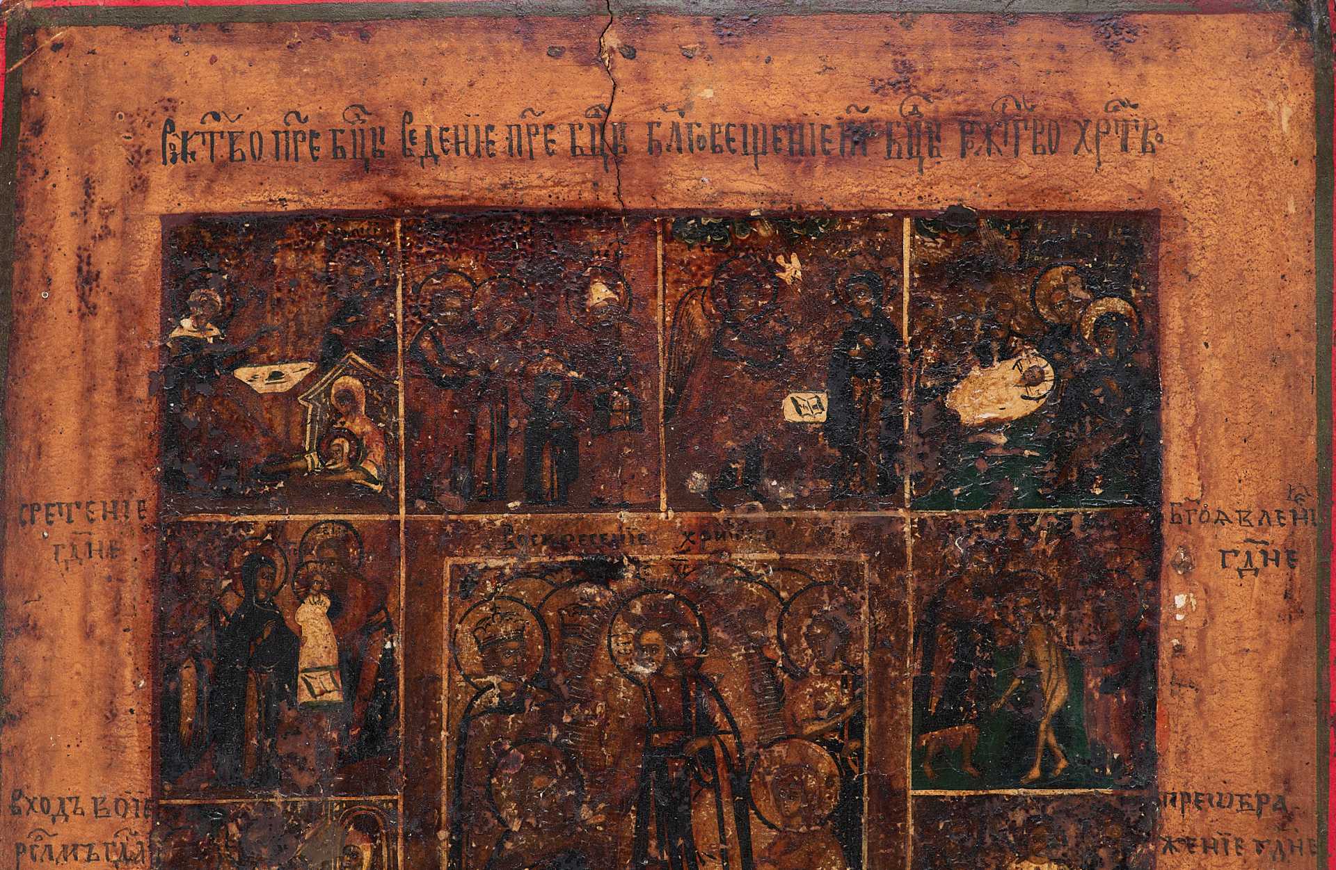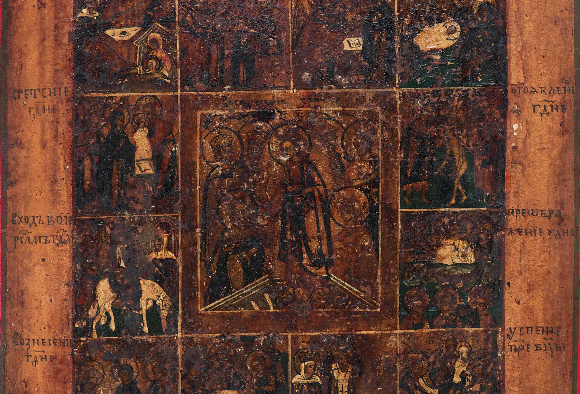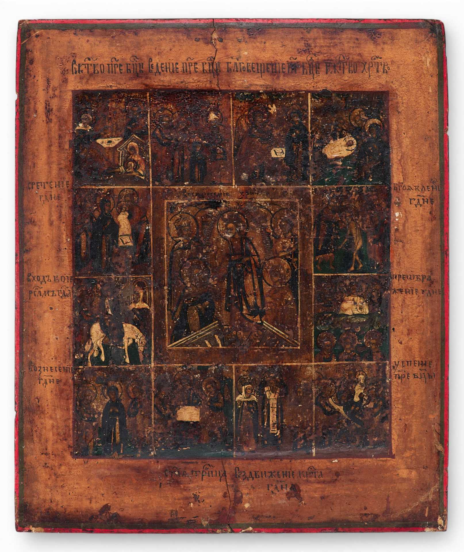 На иконе изображены Двунадесятые праздники. Установлены христианской церковью в память о событиях из жизни Иисуса Христа, Богоматери и некоторых преданий церковной истории.