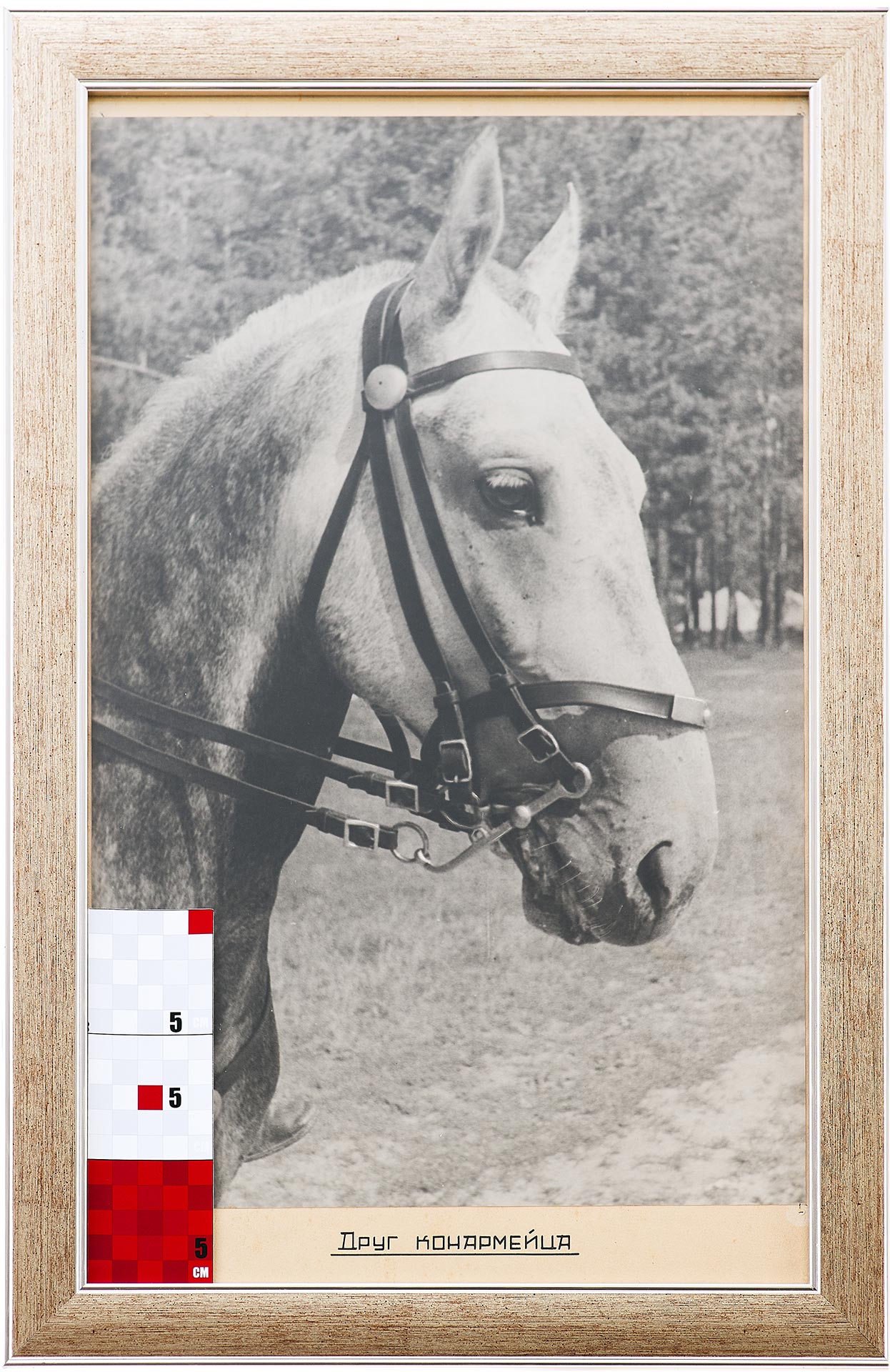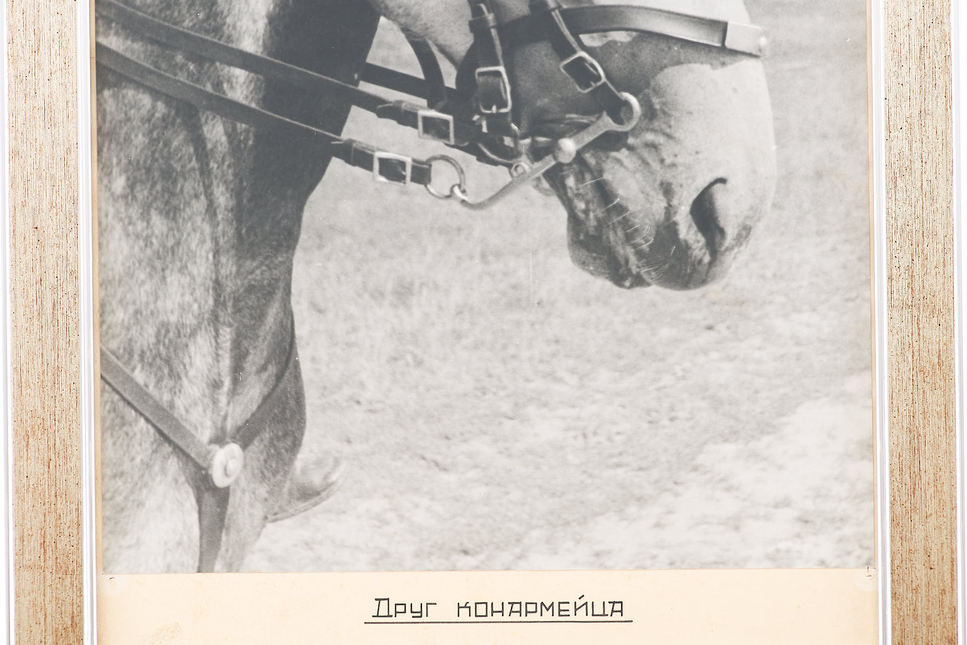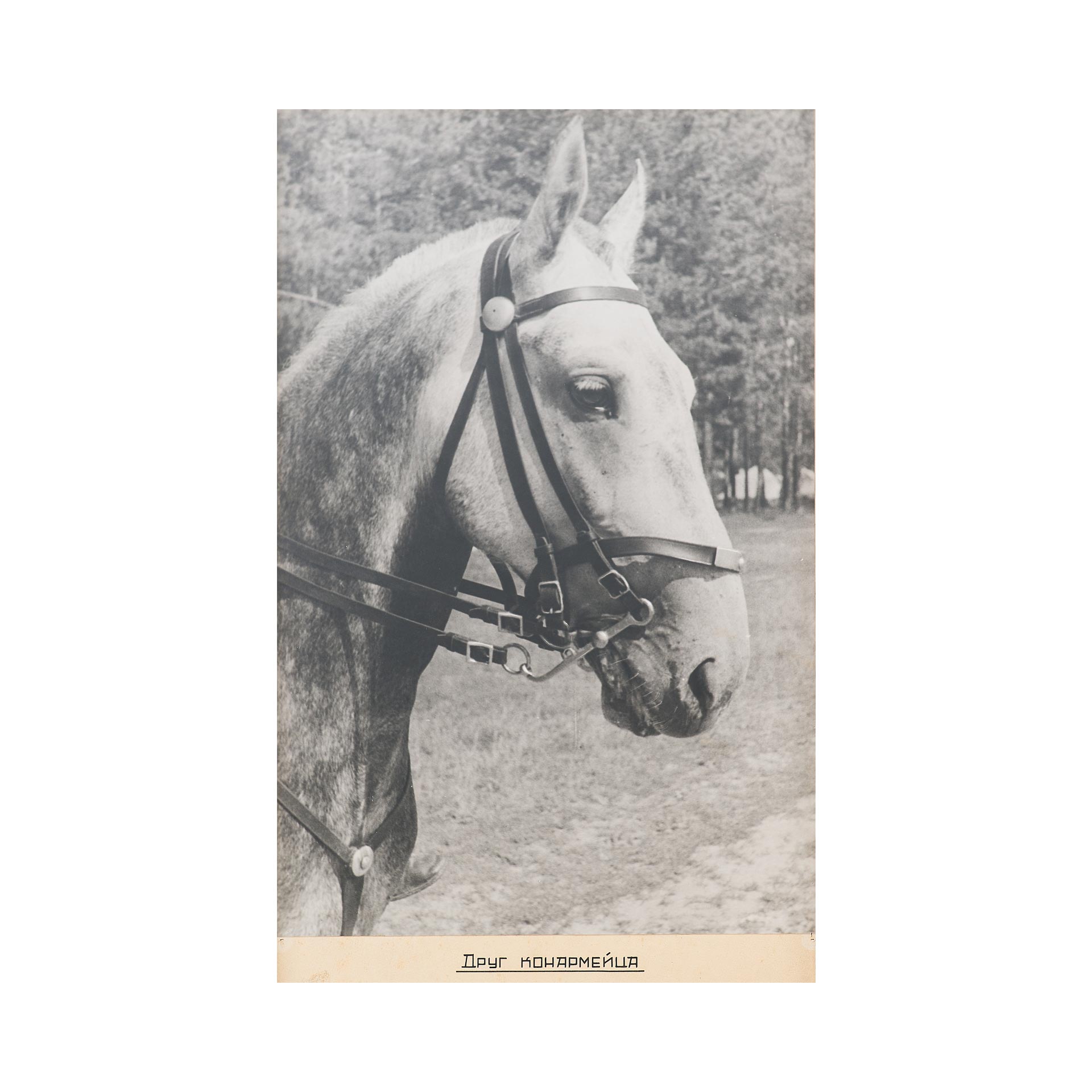 Фотография «Друг конармейца» представляет собой выразительное черно-белое изображение лошади в сбруе, выполненное в июле 1936 года во время военных учений в Свердловской области. Композиция сосредоточена на крупном плане головы животного, что создаёт эффект близости и доверия, передавая атмосферу сослуживческого товарищества между бойцом и его конём. На фотографии отсутствуют излишние детали, фон сливается с лесным пейзажем, подчёркивая главное — характер и выносливость коня как символа военной службы.