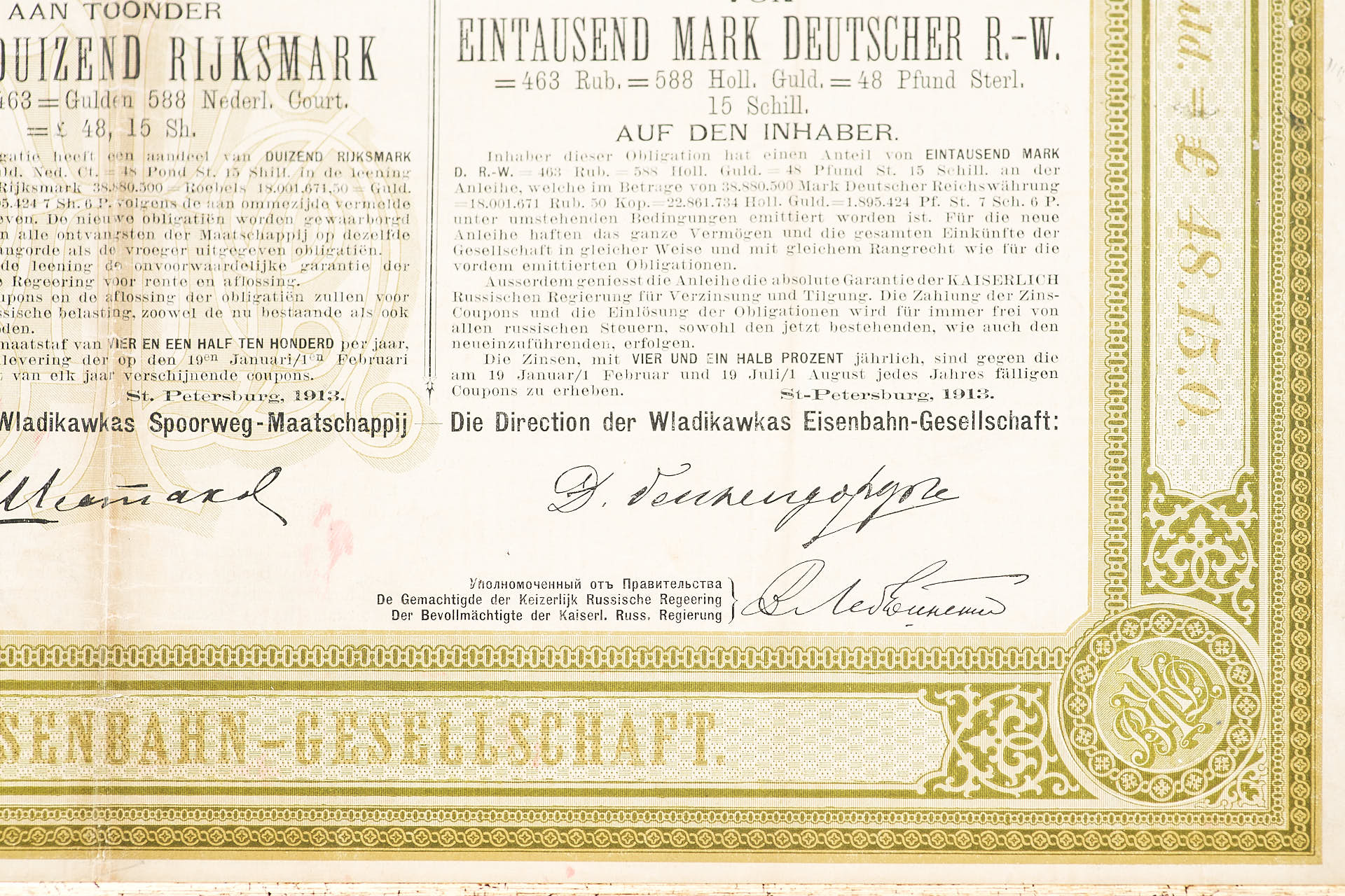 Облигация на предъявителя под номером 36877. В 1897 году нарицательный капитал состоял в 19750400 рублей золотом. Облигации номиналом 500 (20000 листов), 1000 (20000 листов) и 2000 (17000 листов) марок имперской германской валюты "На постройку новой ветви от Петровска до Дербента, длиною около 121 версты; на окончание постройки линии от Тихорецкой до Царицына, на устройство порта в Серепте.