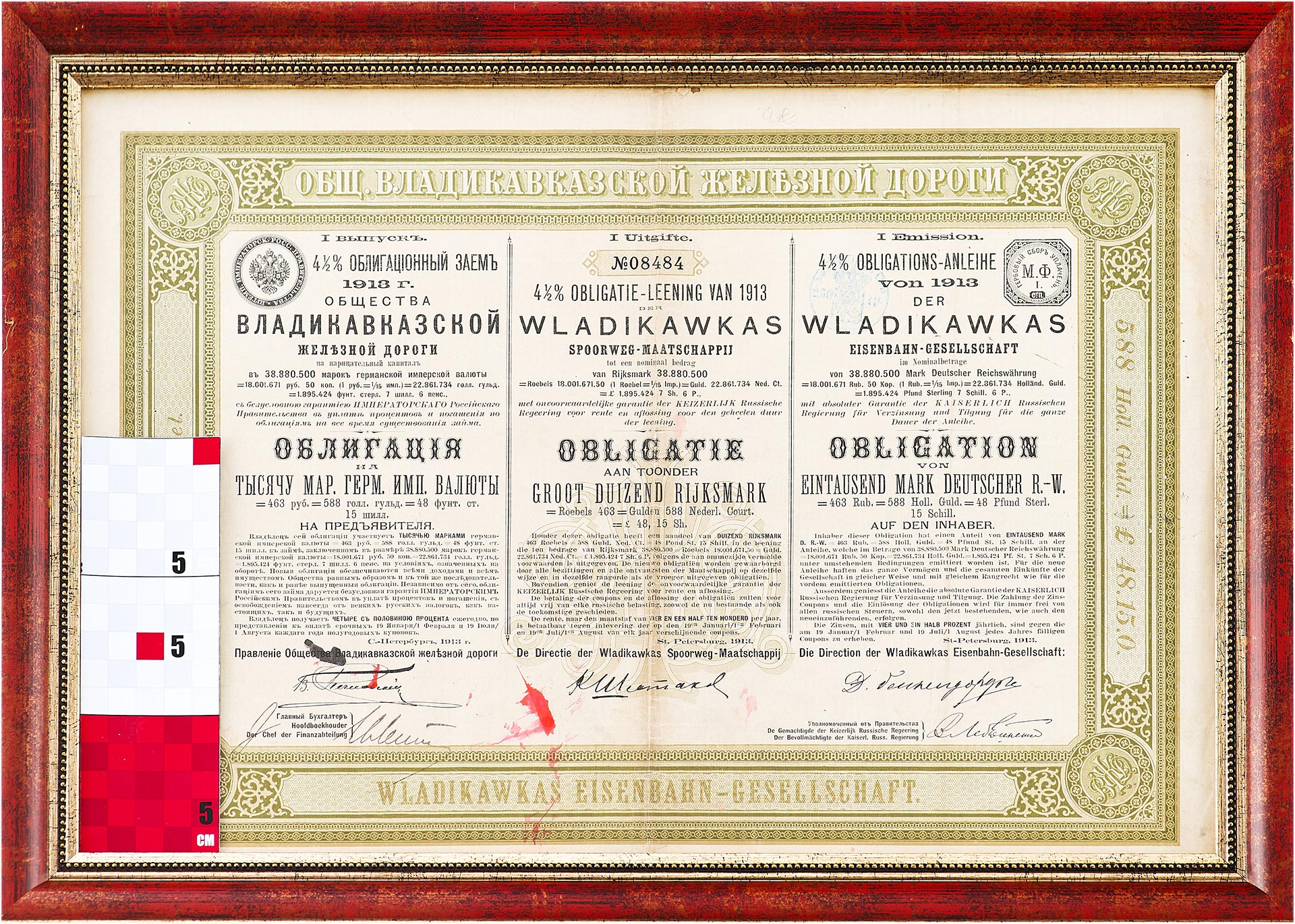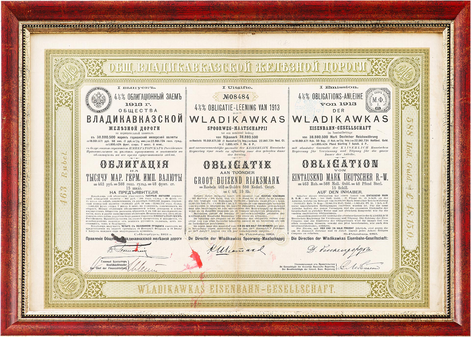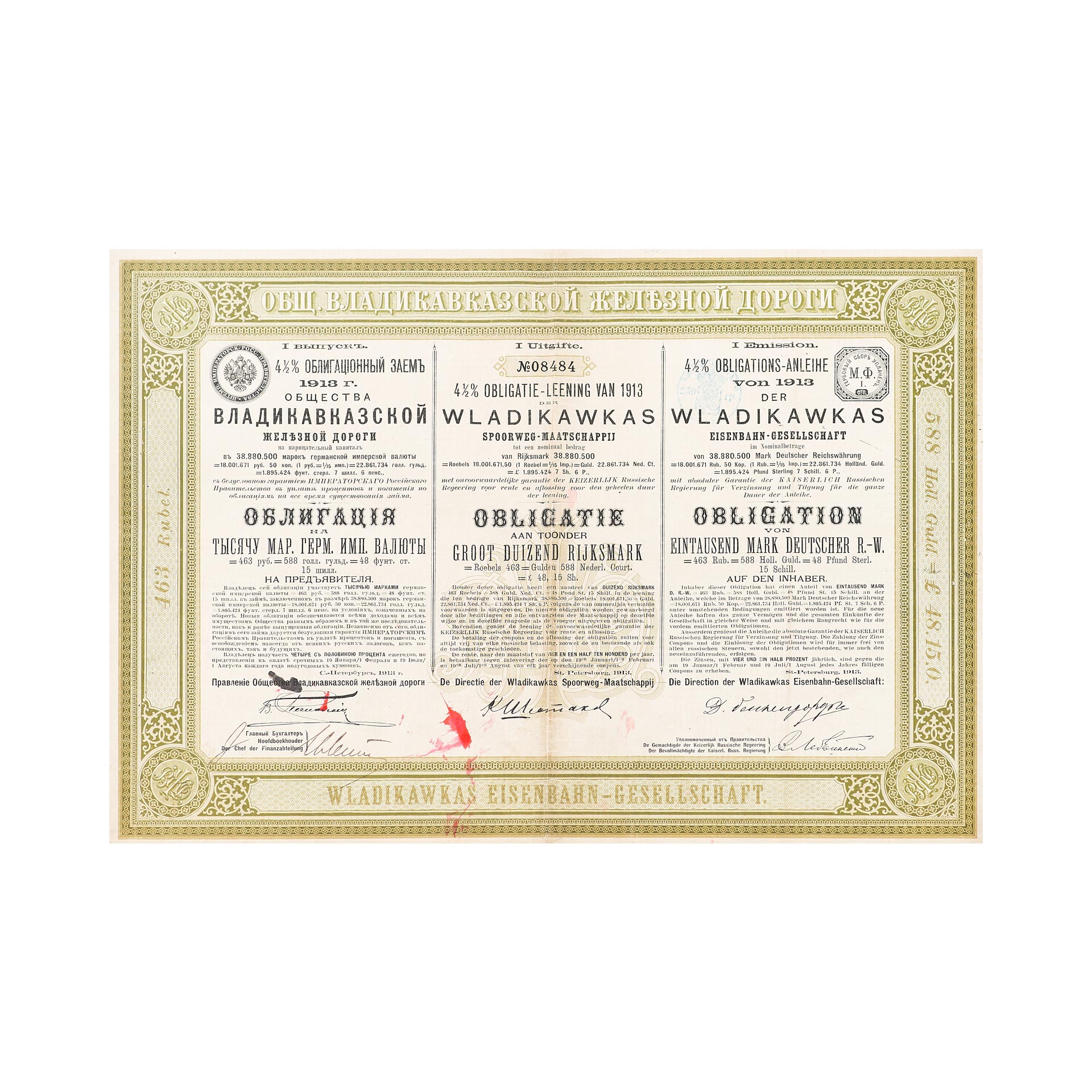 4 процентный облигационный заем Общества Владикавказской железной дороги был выпущен в 1897 году на сумму тысячу марок германской имперской валюты (463 рубля).