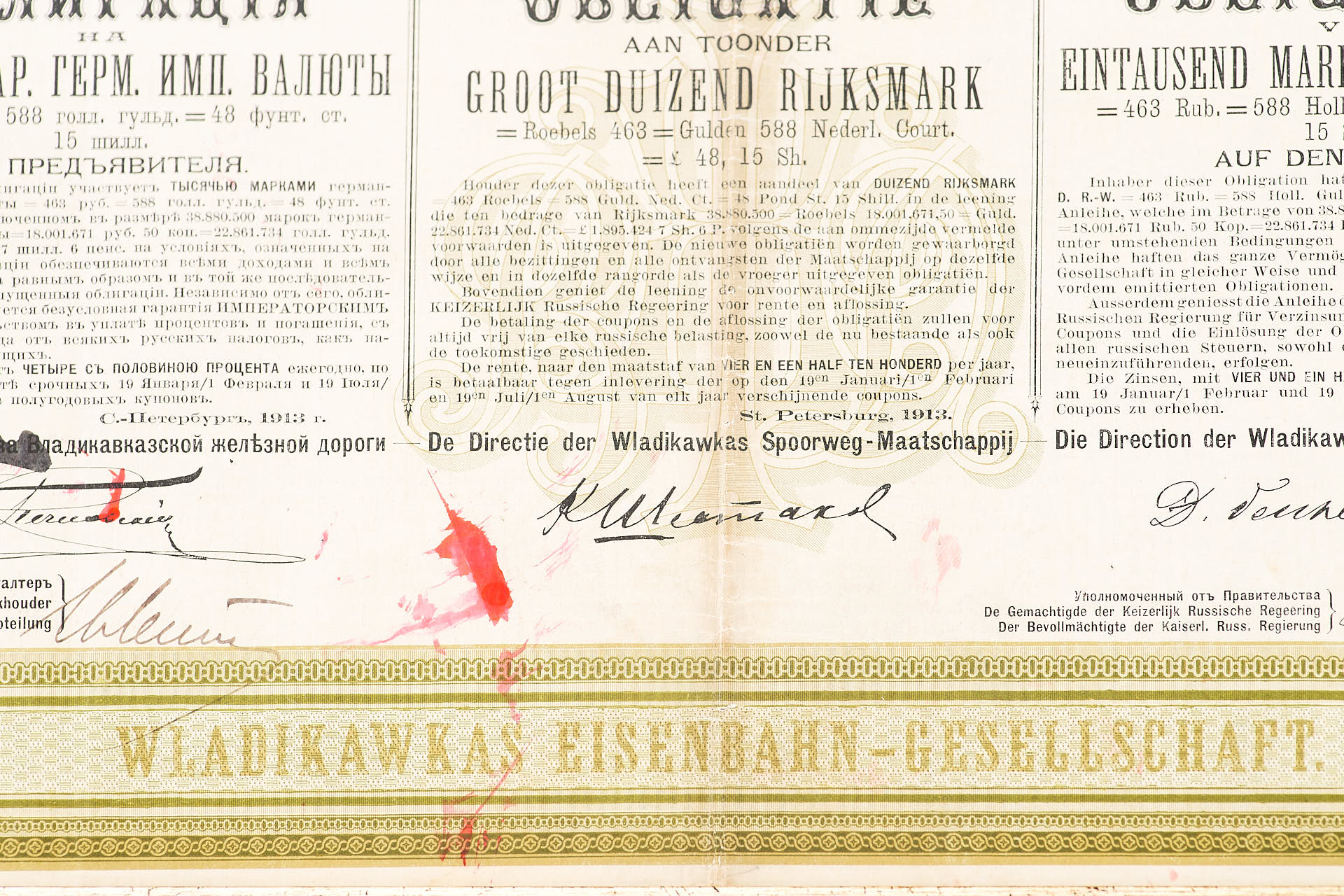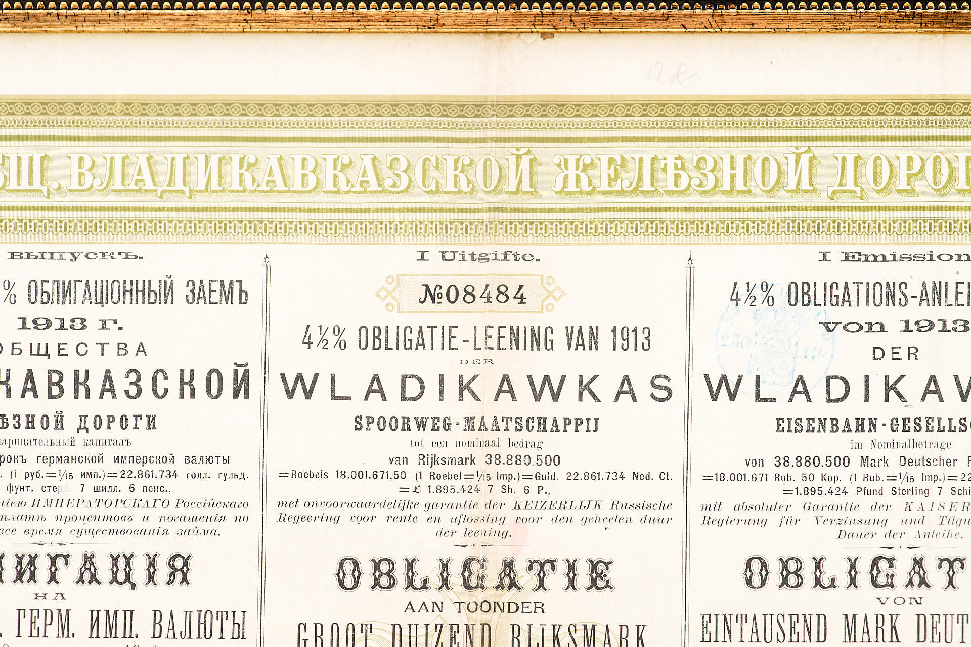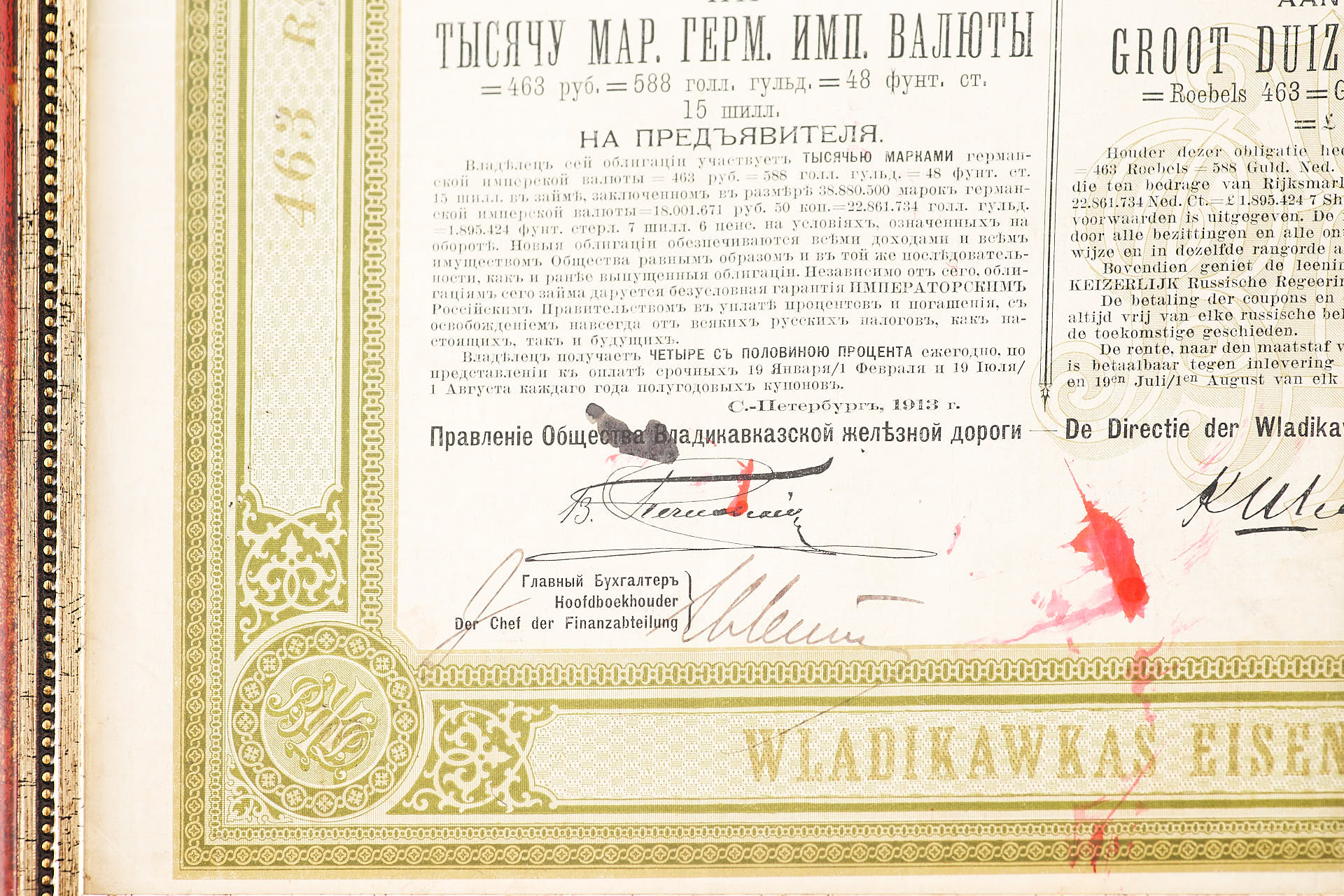 4 процентный облигационный заем Общества Владикавказской железной дороги был выпущен в 1897 году на сумму тысячу марок германской имперской валюты (463 рубля).