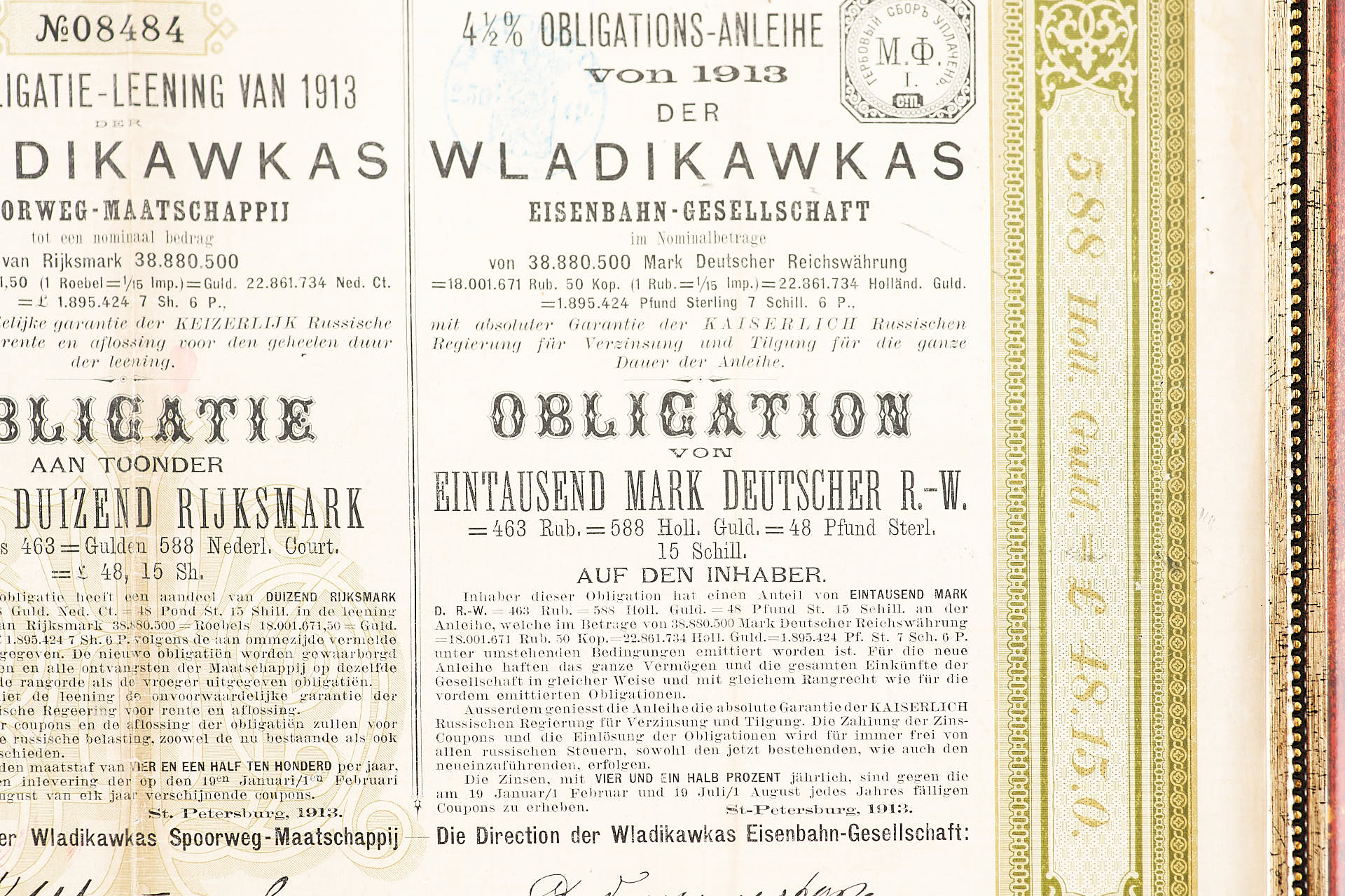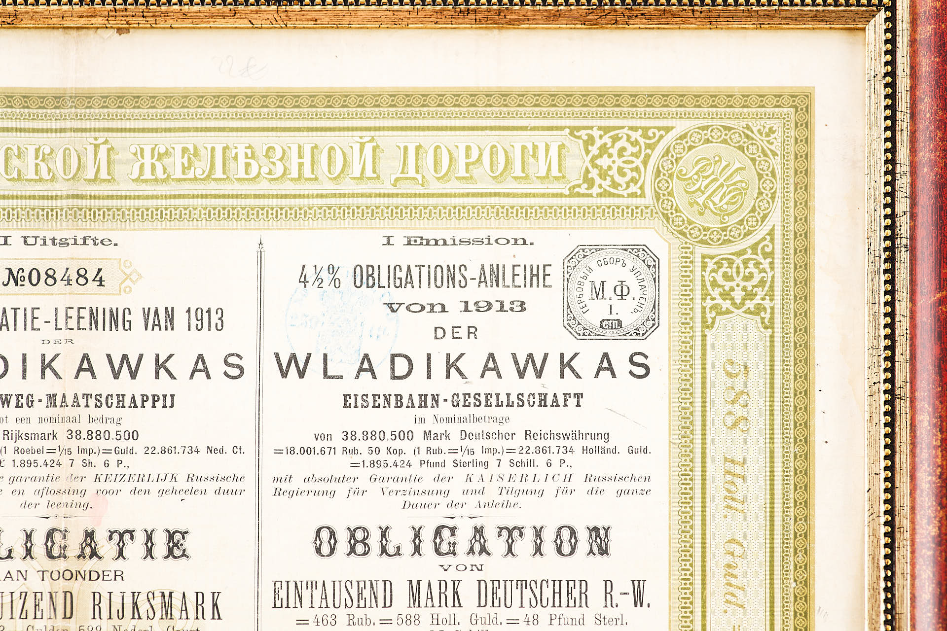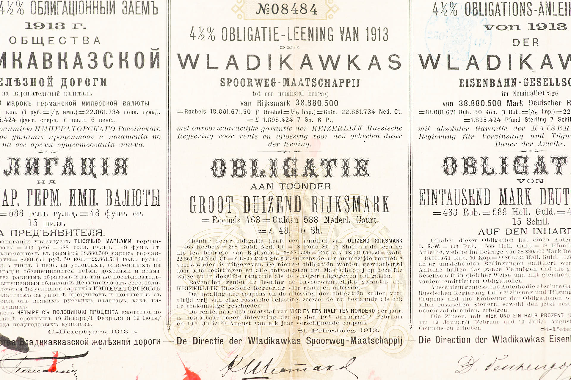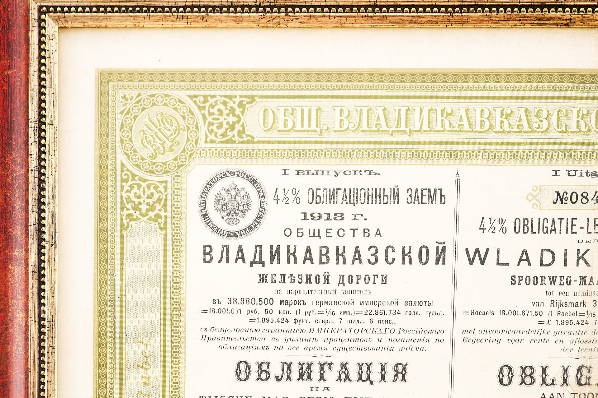 увеличить до 318,1 миллионов рублей. Общество размещало займы как внутри страны, так и за рубежом. В выпущенных облигациях кроме рублевых номиналов присутствует германская марка и доллар США. Всего с 1885 года по 1913 год было 15 выпусков облигационных займов, а полная коллекция облигаций Владикавказской железной дороги состоит из 54 листов. В облигации указана сумма займа и четко прописано целевое назначение, эта информация весьма полезна при изучении истории развития не только самой дороги, но и всего Северо-Кавказского региона.