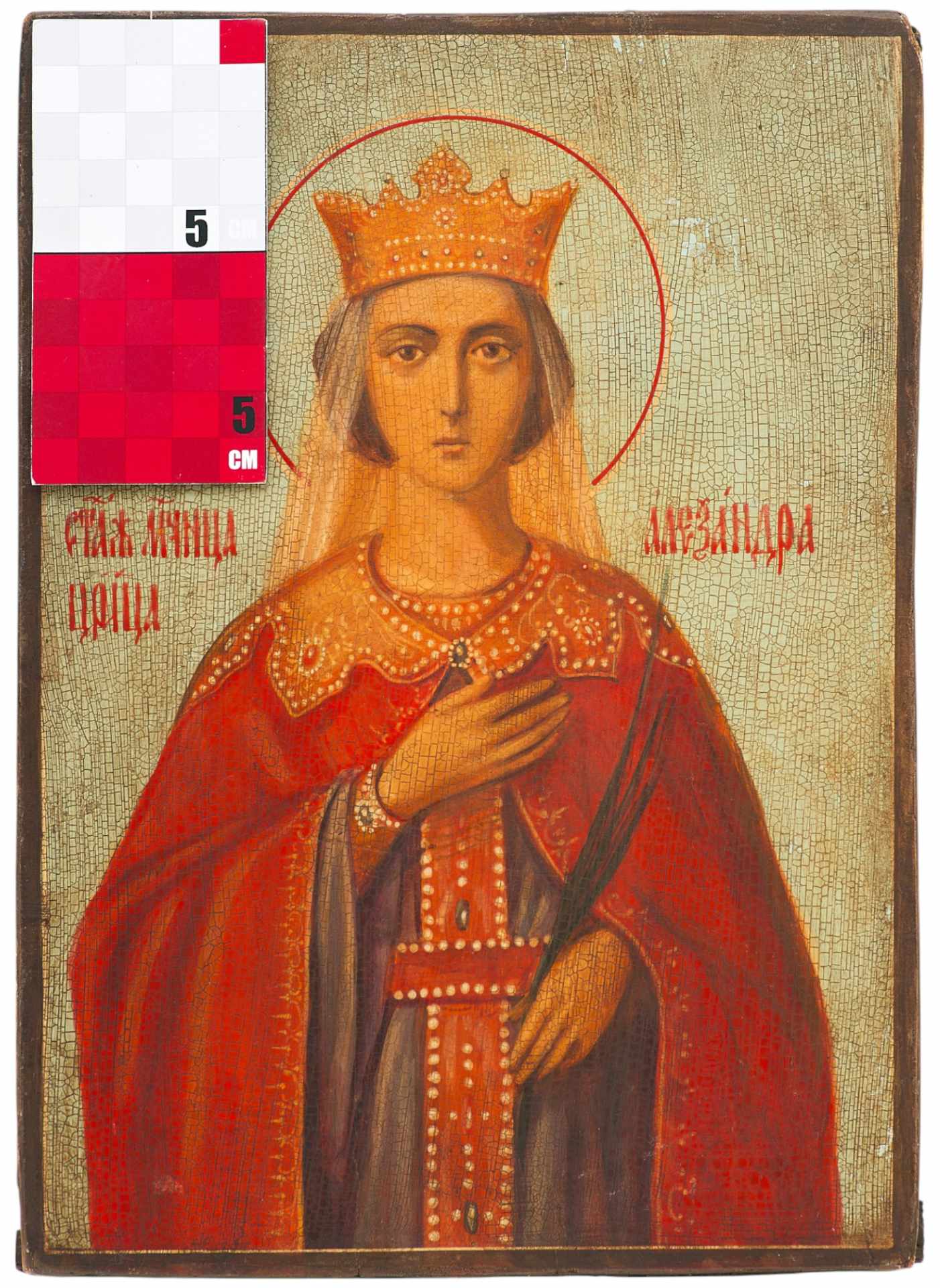 На иконе представлена святм в царских одеждах. Правая рука прижата к грули, в левой - пальмовая ветвь. Фон средника небесно-голубой. По обеим сторонам от святой надпись: "святая мучица царица Александра". Особого почитания в России святая Александра удостоилась в конце XlX - начале ХХ века. Её имя носили жены императоров Николая I и Николая II. Обе
