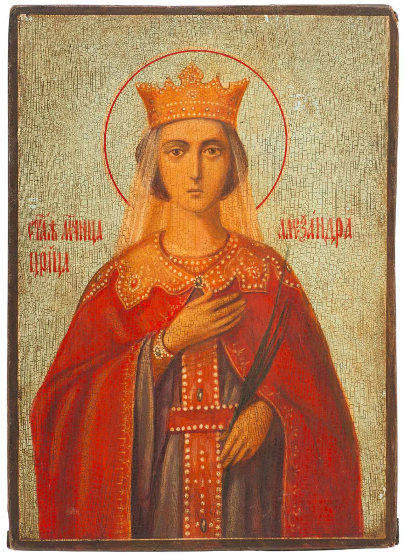 Икона свяmой мученицы царицы длександры Римской призвана напоминать о мужестве и силе духа защитников христианской Веры. В XIX веке во имя Длександры царицы, являвшейся покровительничей русских императриц, были освящены московские храмы: церковь 1835 года в Александринском дворце в Нескучном саду; церковь 1835 года в александровском военном училище, на Знаменке (освящена во имя Александры царицы в 1851 году); придел во имя св.
