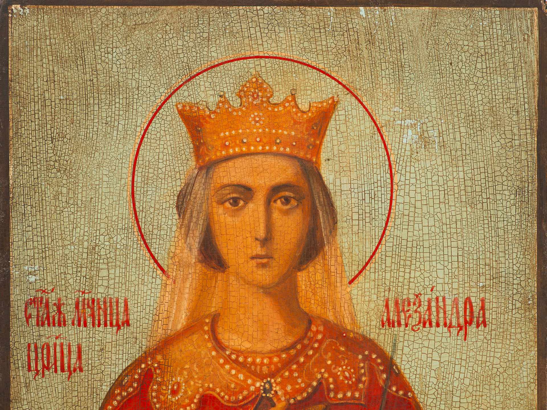 Святая Александра, супруга императора Диоклетиана была тайной христианкой. Видя твердость веры святого Георгия во время его мучений, она решилась открыто свидетельствовать о своей вере в Иисуса Христа. Она отправилась к месту, где мучили св, Георгия, упала к ногам великомученика и перед всеми объявила себя христианкой.