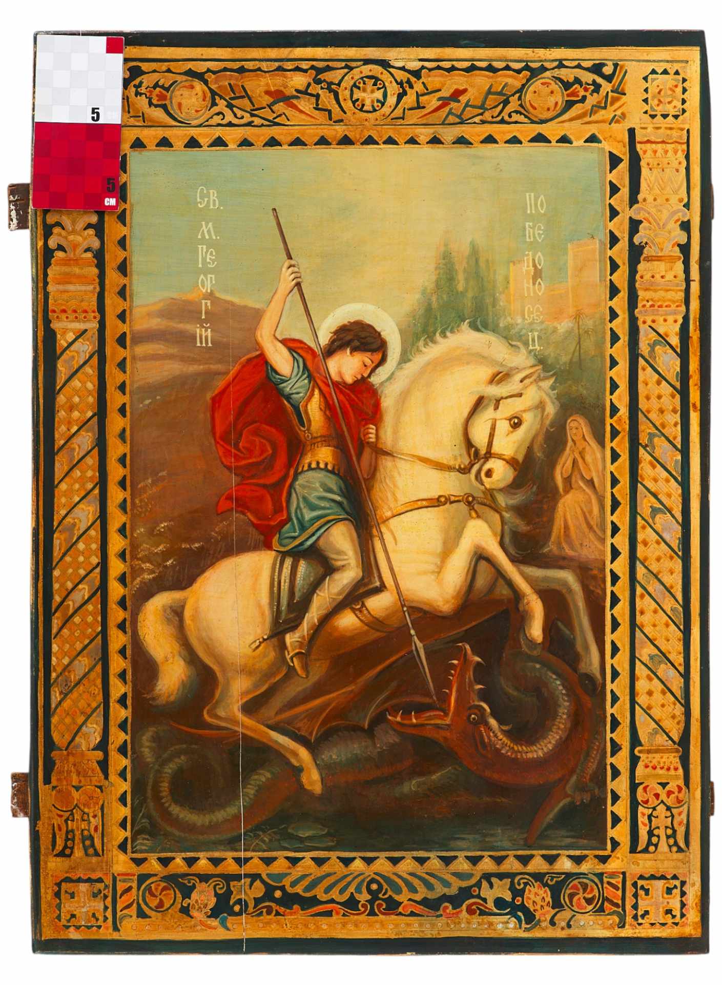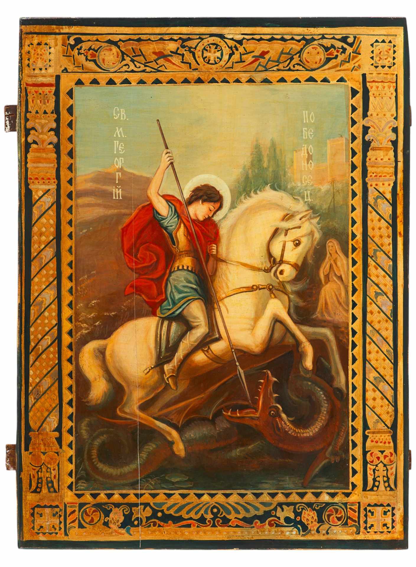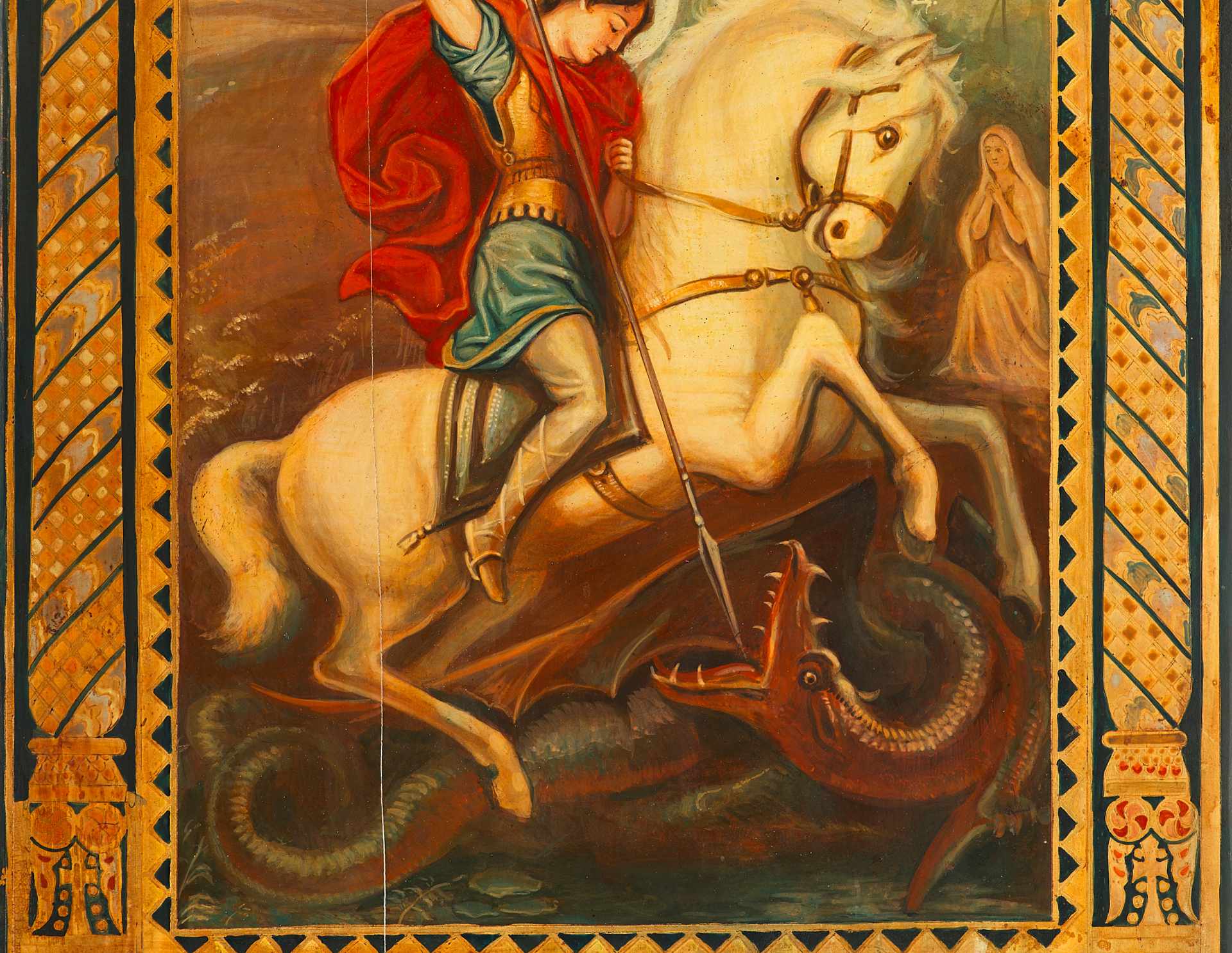 На иконе святой Георгий изображён на белом коне. Копьем он колет змея.
