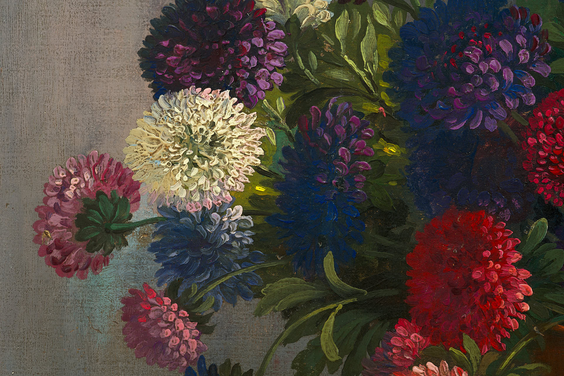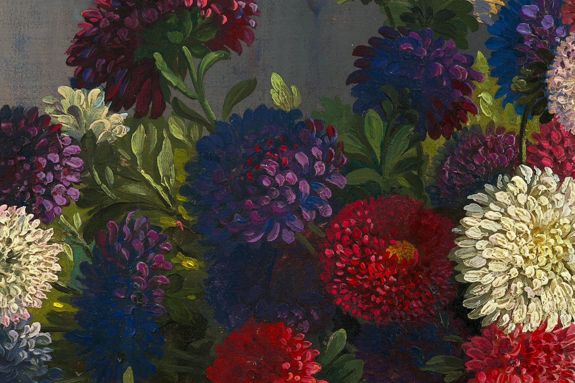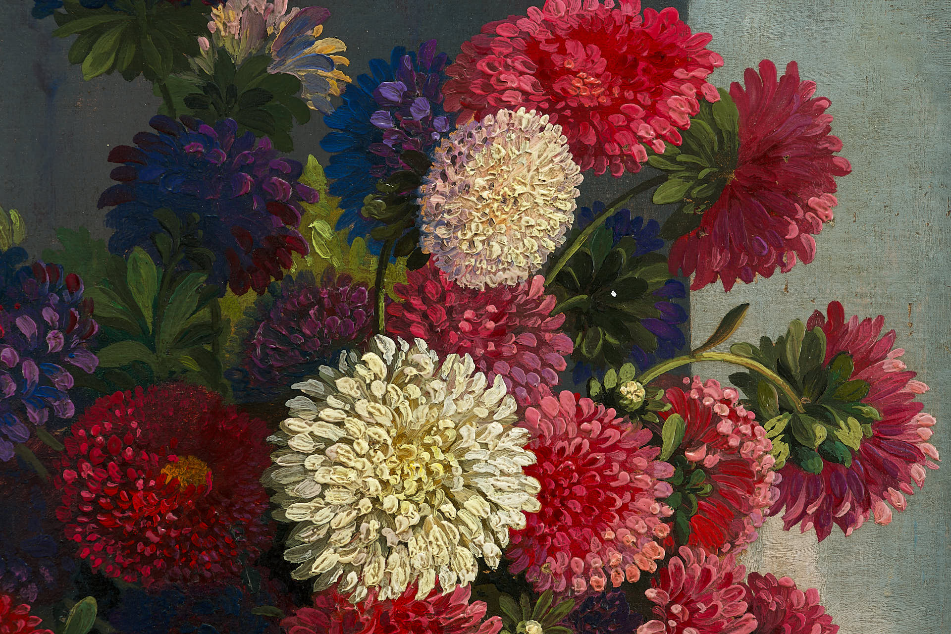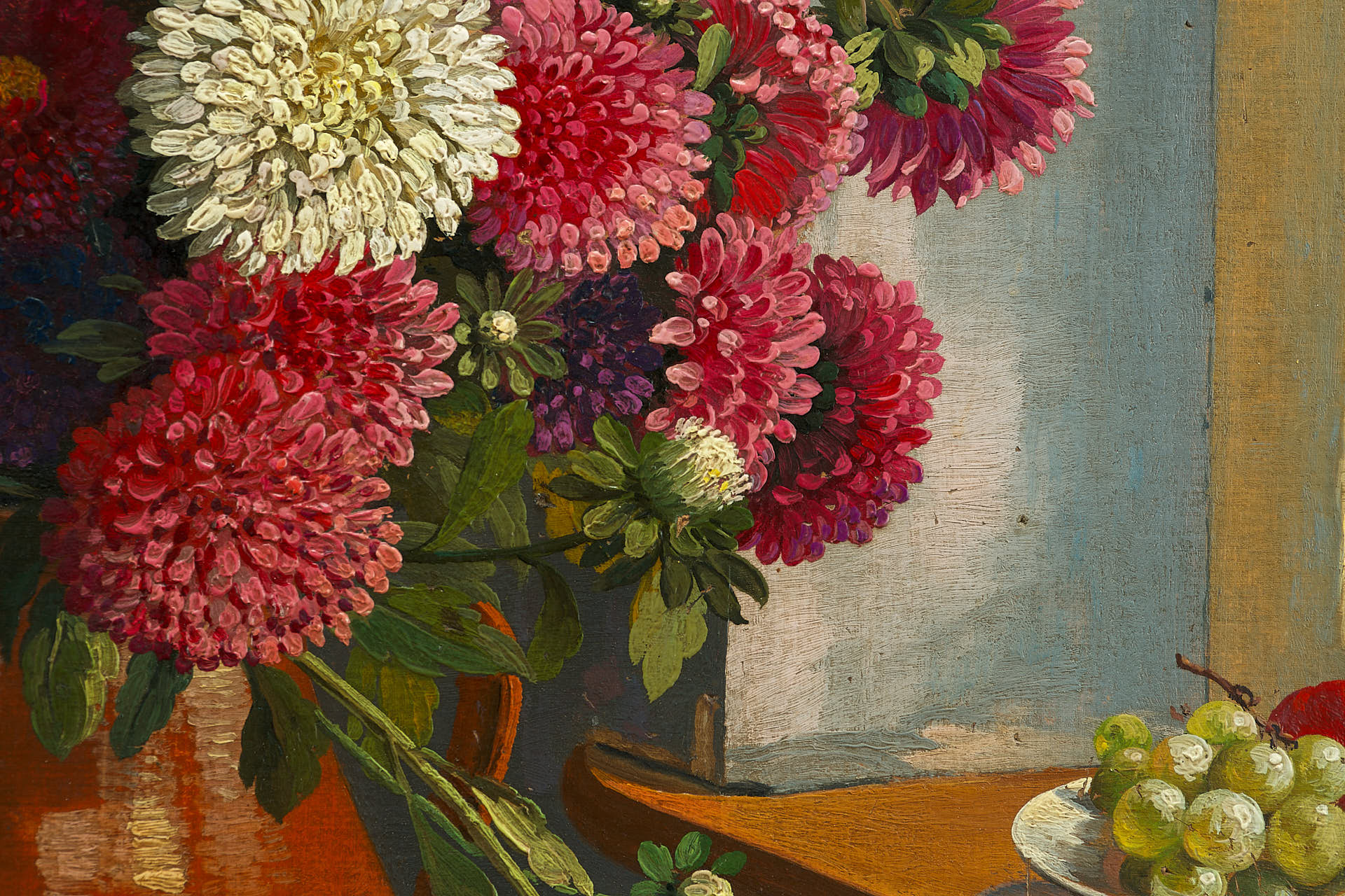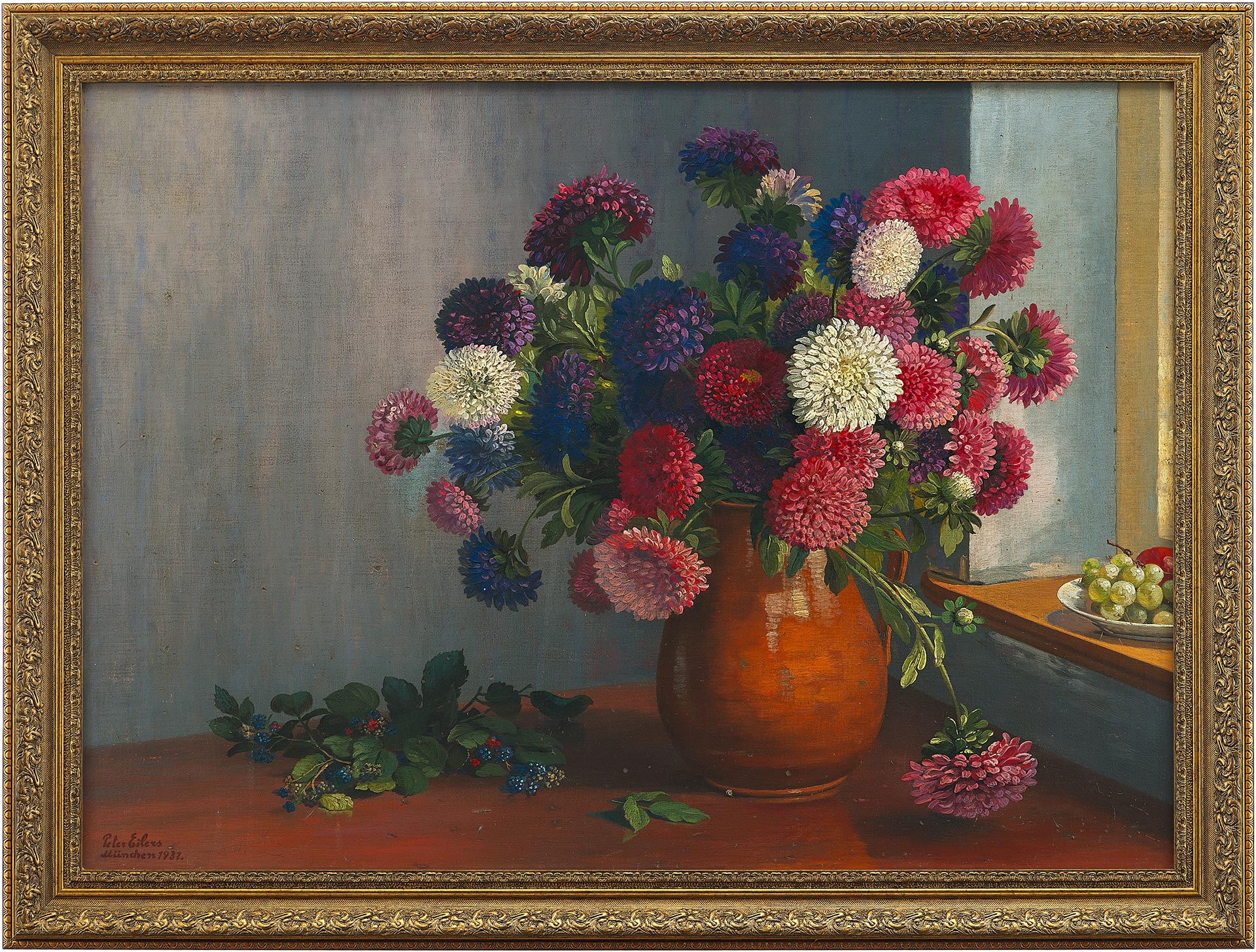 Картина «Натюрморт с астрами» была написана немецким художником Петером Айлерсом (Peter Eilers) в 1931 году. Перед зрителем — композиция, исполненная в духе традиционного реализма, с подчёркнутым вниманием к деталям, цвету и свету. Центральным элементом выступает глиняная ваза с пышным букетом астр различных оттенков — от белого и розового до бордового и синего. Букет расположен на деревянном столе у окна, на подоконнике стоит фарфоровая тарелка с гроздью зелёного винограда и ярким красным плодом, вероятно, сливой или яблоком.