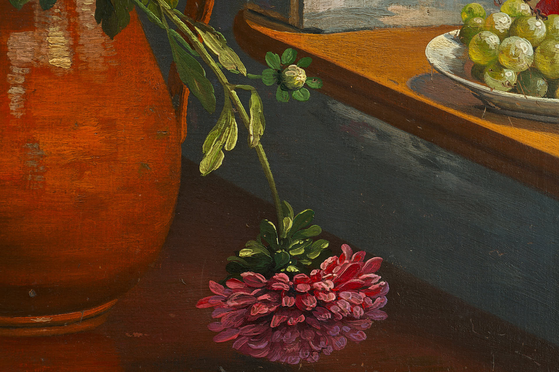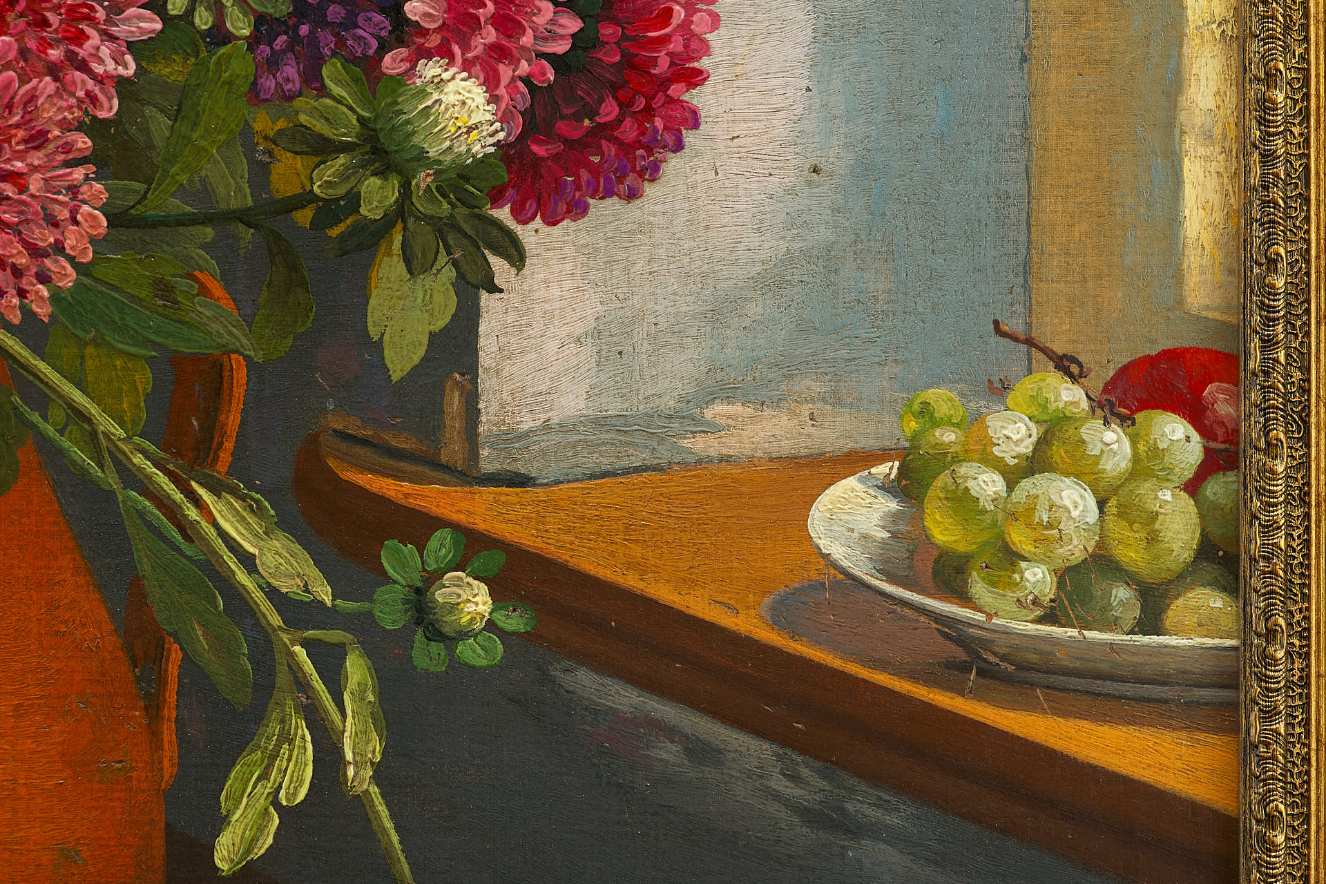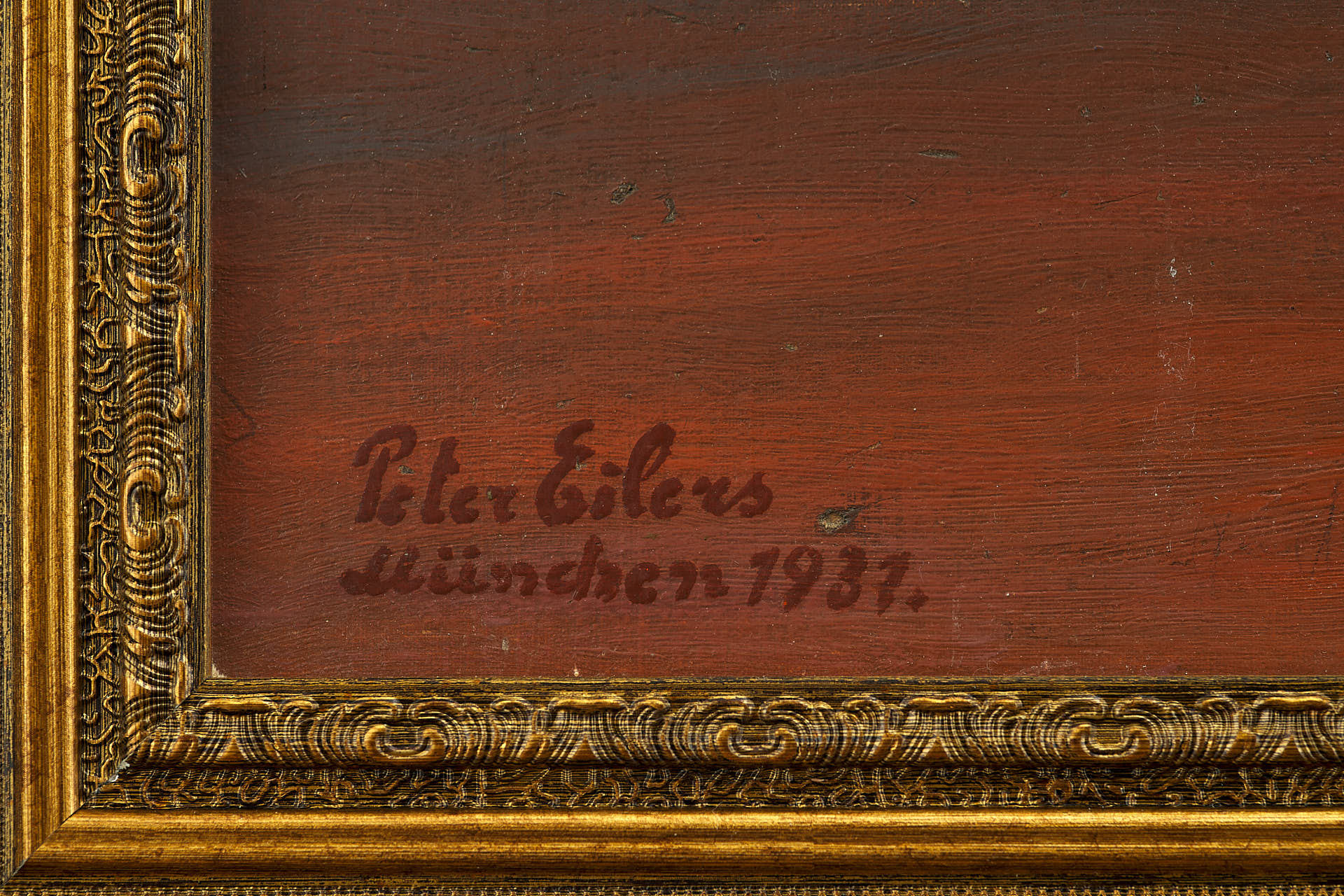 Петер Айлерс, работавший в Мюнхене в первой половине XX века, принадлежал к числу художников, придерживавшихся классической школы европейского натюрморта. Его стиль отличается точностью в передаче форм, сбалансированным колоритом и стремлением к гармонии изображения. Надпись на картине — Peter Eilers München 1931 — подтверждает авторство и хронологию. На обороте также сохранилась бумажная этикетка фирмы “WILH. WEBER”, вероятно, торгового салона или мастерской.