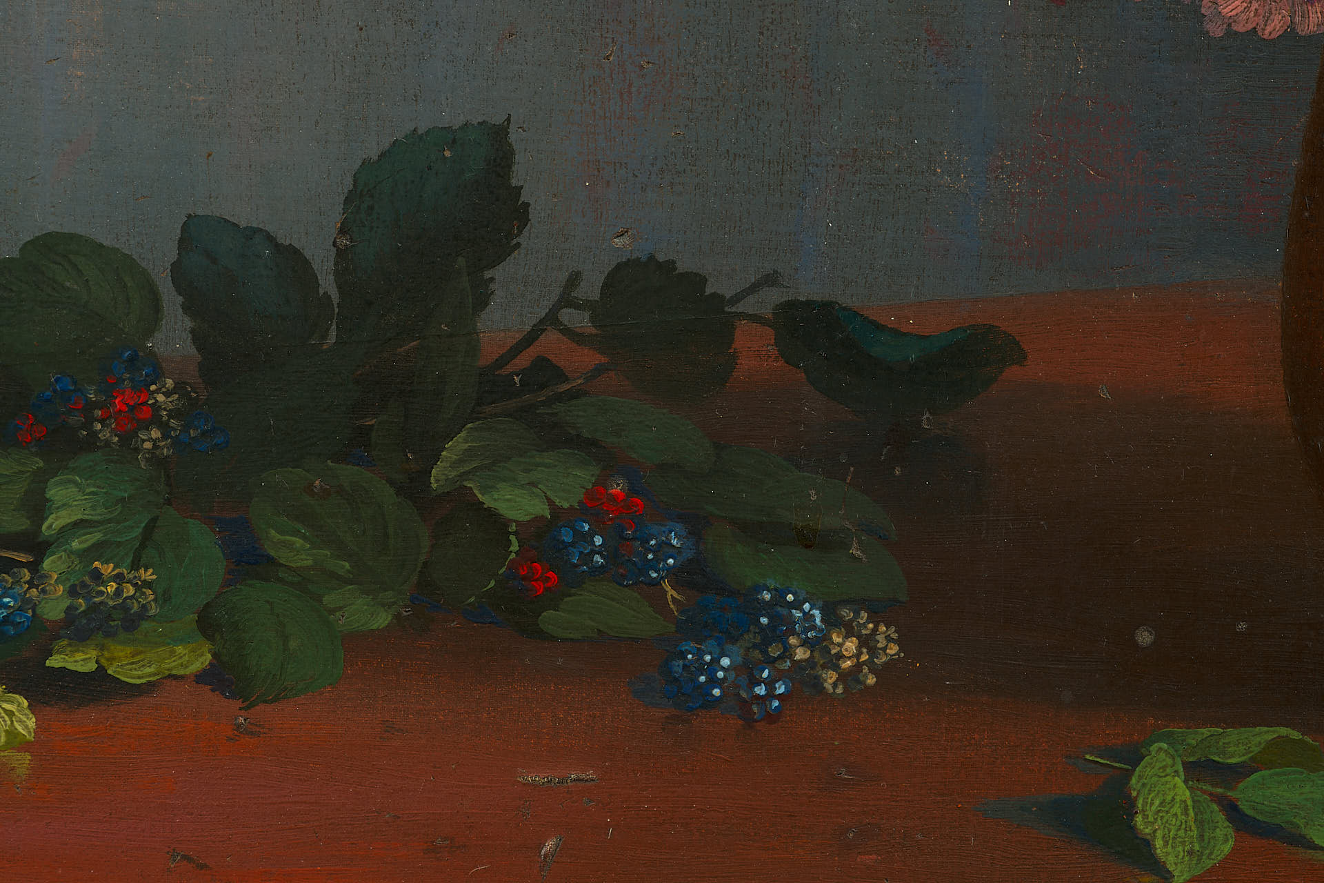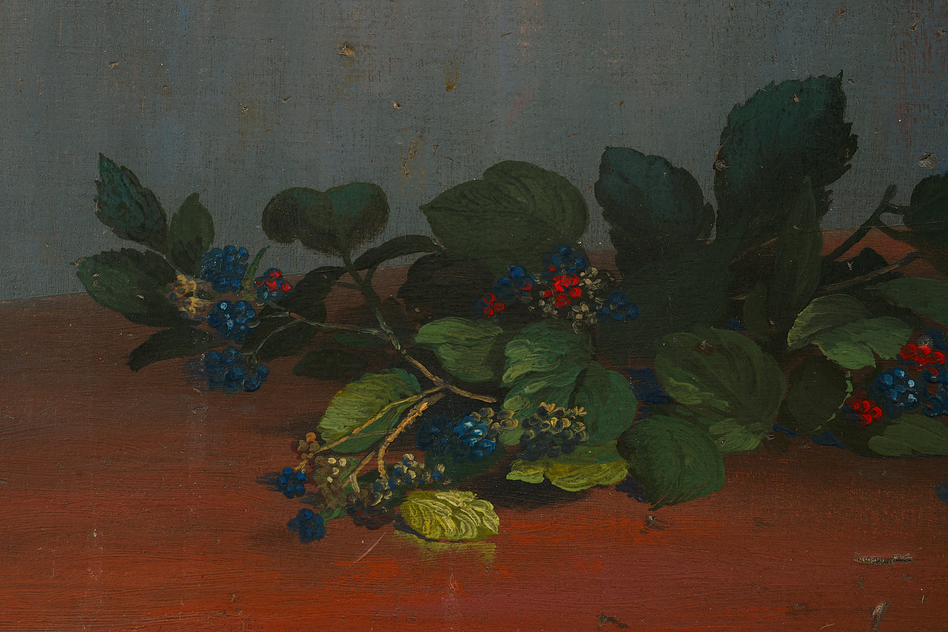 Работа выполнена в масляной технике на деревянной панели, что придаёт ей дополнительную декоративную глубину и подчёркивает насыщенность цвета. Композиция статична, но наполнена живым дыханием природы — свежесрезанные ветки с ягодами на столе добавляют сюжетной реалистичности.