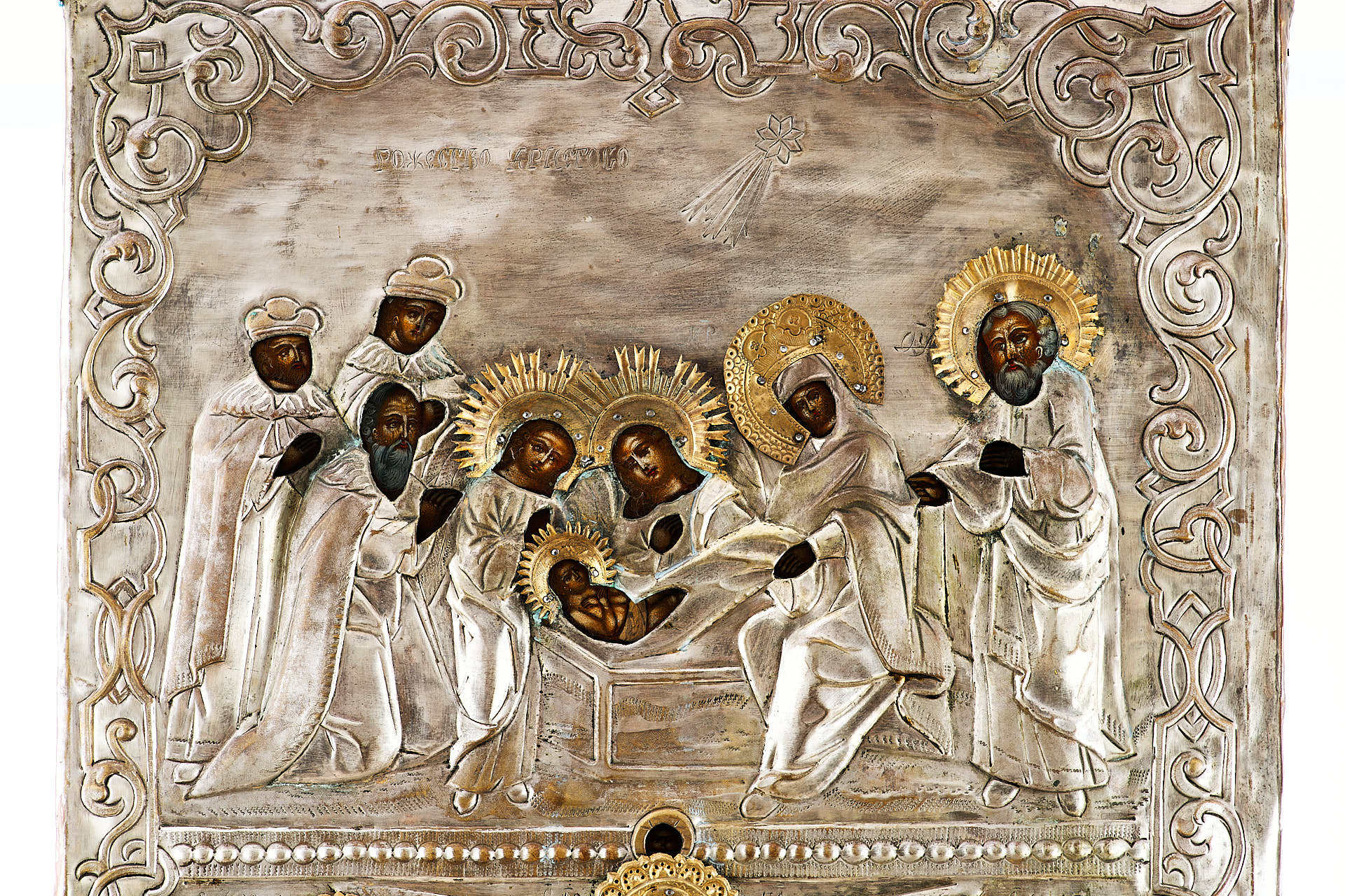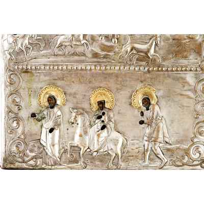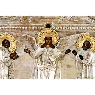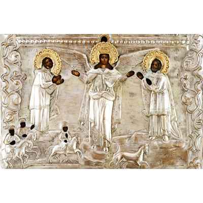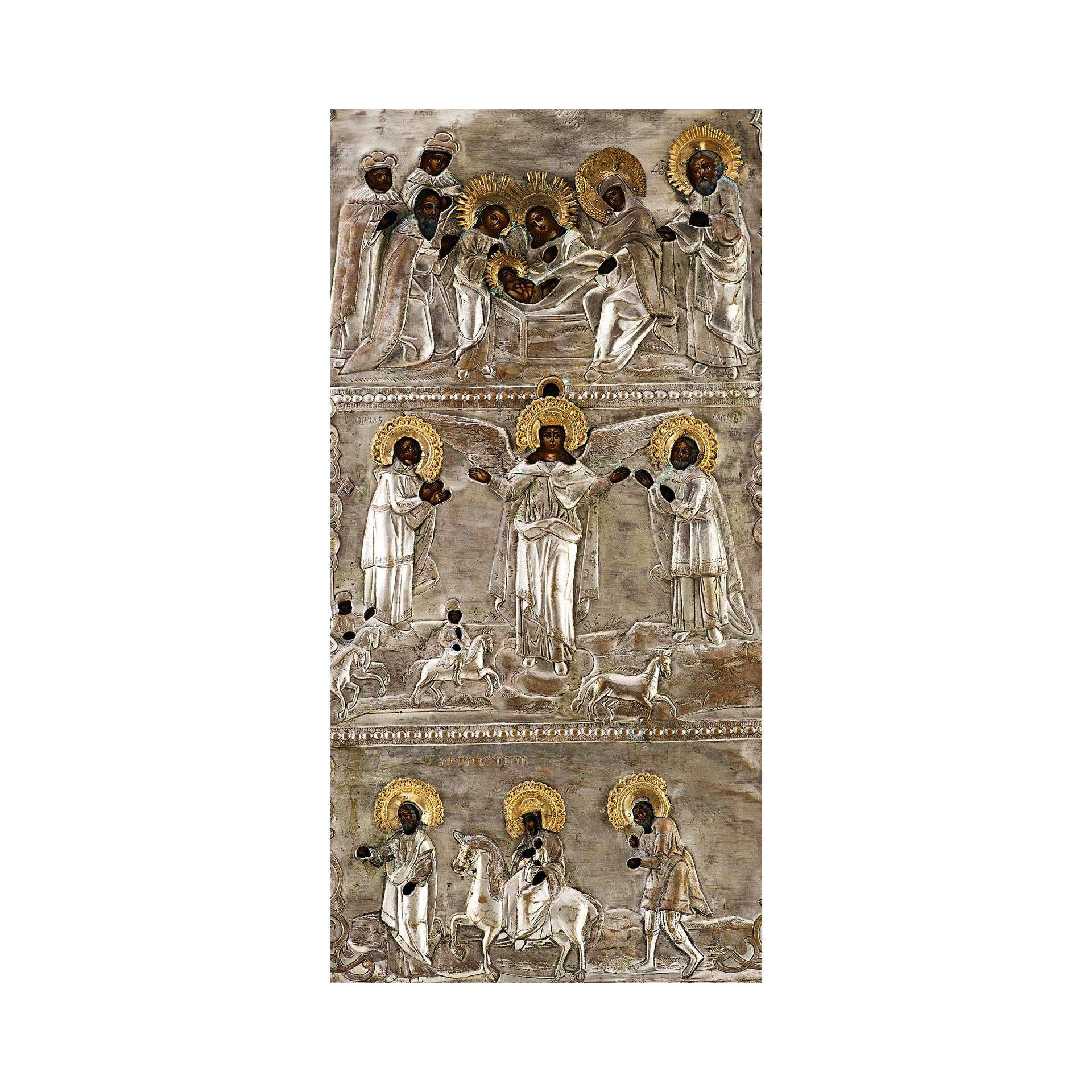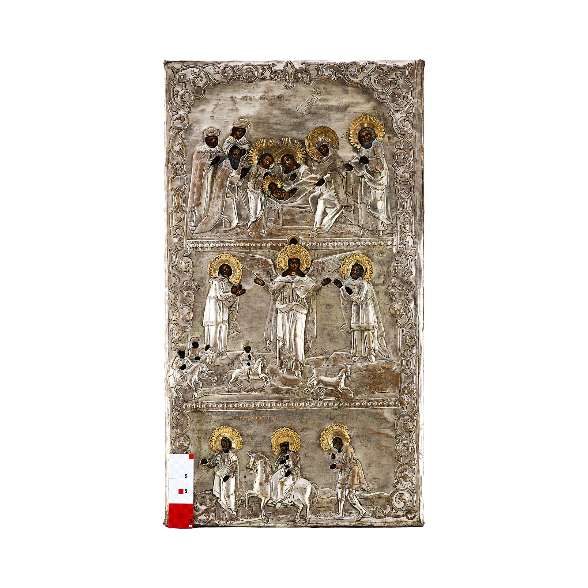 Икона, созданная в третьей четверти XIX века, представляет собой редкий трехчастный образ в серебряном окладе. Композиция разделена на три сцены: в верхнем регистре — «Рождество Христово», в центре — Архангел Михаил и святые мученики Флор и Лавр, в нижней части — «Бегство в Египет». Все фигуры выделены чеканкой и украшены позолоченными венцами. Вокруг — декоративный бордюр с растительным орнаментом.