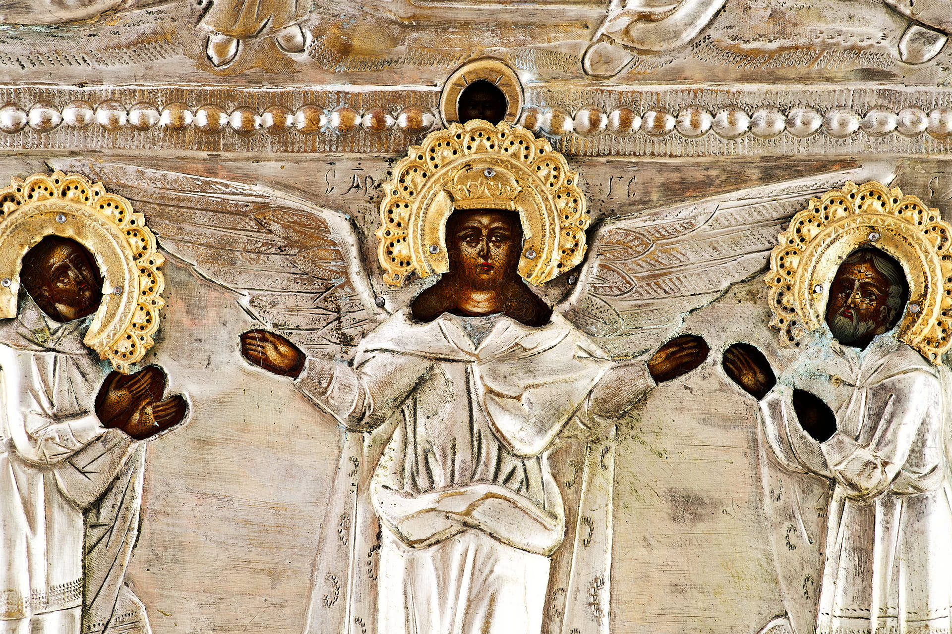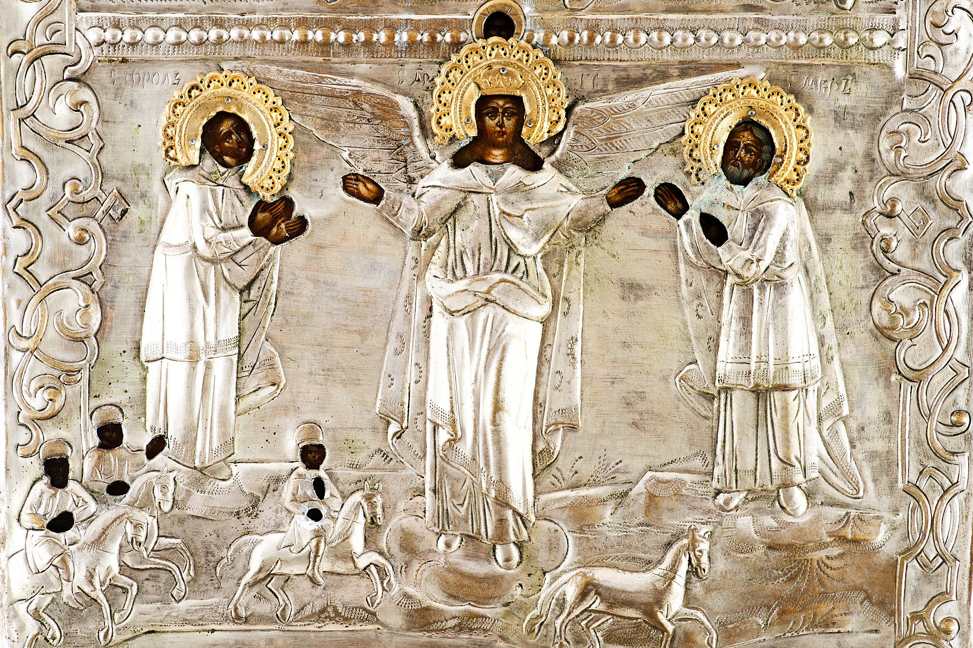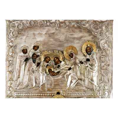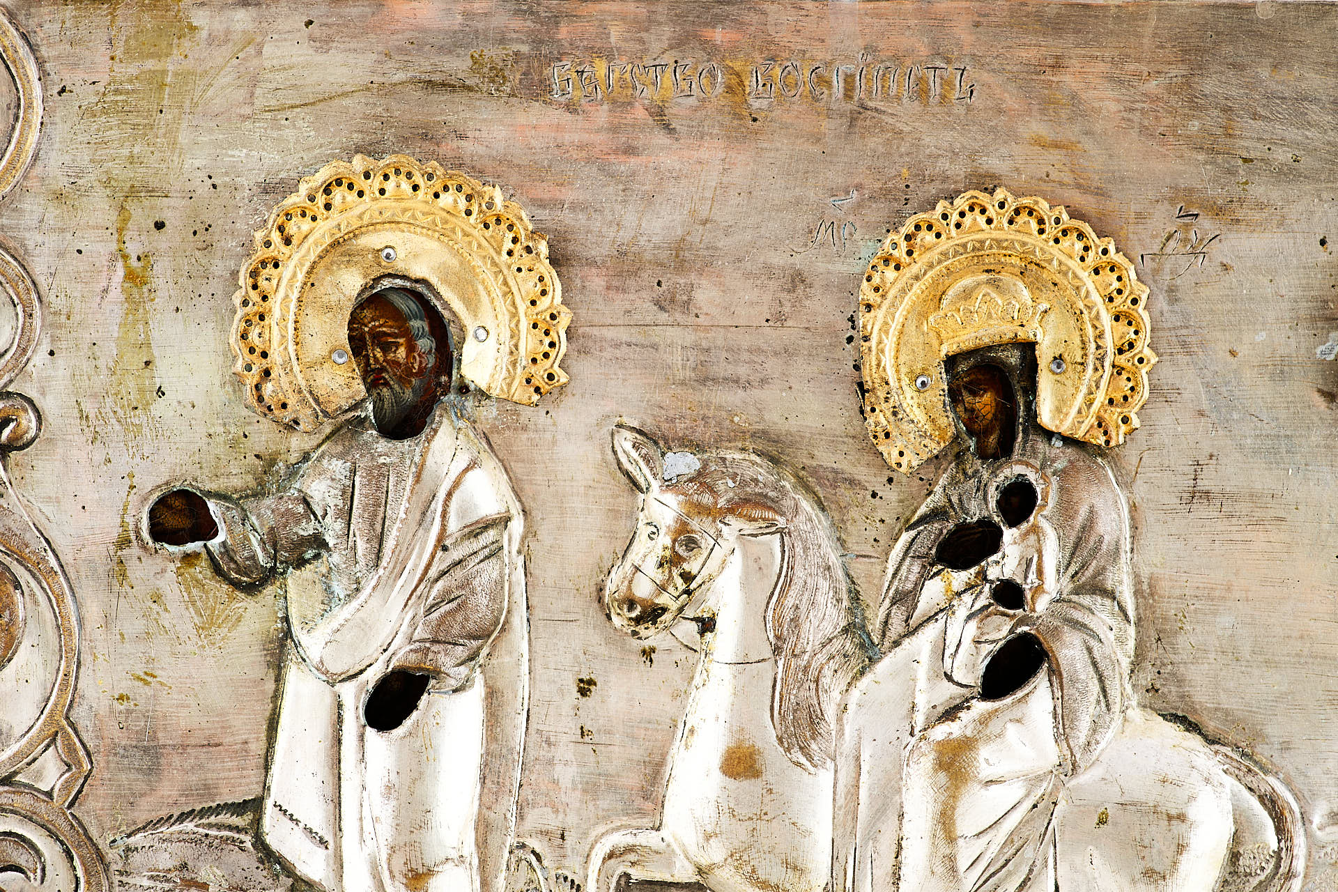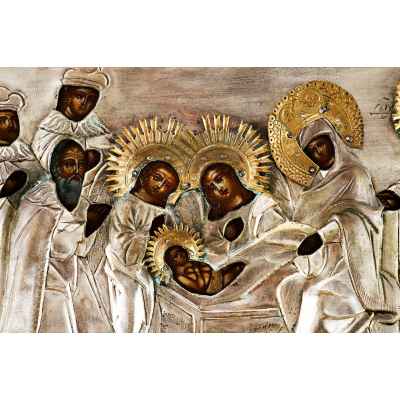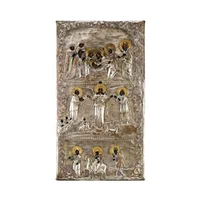 Икона, созданная в третьей четверти XIX века, представляет собой редкий трехчастный образ в серебряном окладе. Композиция разделена на три сцены: в верхнем регистре — «Рождество Христово», в центре — Архангел Михаил и святые мученики Флор и Лавр, в нижней части — «Бегство в Египет». Все фигуры выделены чеканкой и украшены позолоченными венцами. Вокруг — декоративный бордюр с растительным орнаментом.