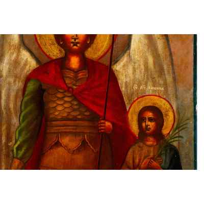 На иконе изображены два святых персонажа: Архистратиг Михаил и Святая мученица Любовь. Архангел Михаил представлен в традиционном иконографическом образе как воин в латах, с распростёртыми крыльями, огненным мечом в правой руке и длинным копьём в левой. Его фигура символизирует небесную защиту и духовную силу. Справа от него — Святая Любовь, одна из трёх сестёр-мучениц, с пальмовой ветвью в руке, что в христианской традиции является знаком мученичества и победы духа над смертью.