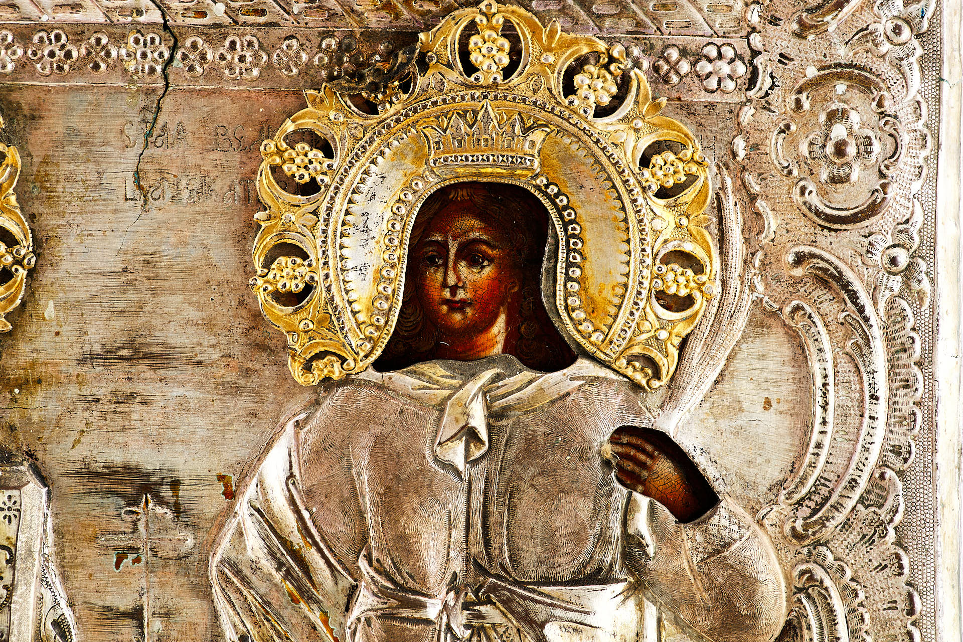 Нижняя часть иконы представляет трёх особо почитаемых святых. Святой Димитрий Солунский, облачённый в воинские доспехи, символизирует покровительство воинам. Николай Чудотворец изображён в архиерейском облачении с Евангелием, что подчёркивает его как заступника и чудотворца, особенно чтимого на Руси. Святая Екатерина представлена как молодая женщина с крестом — символом её мученичества, хотя текстовая часть заключения также указывает на связь с образом равноапостольной царицы Елены, что создаёт интересную иконографическую двойственность и, возможно, требует дополнительного изучения.