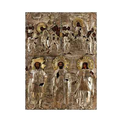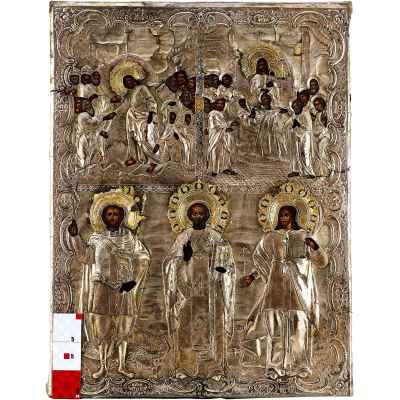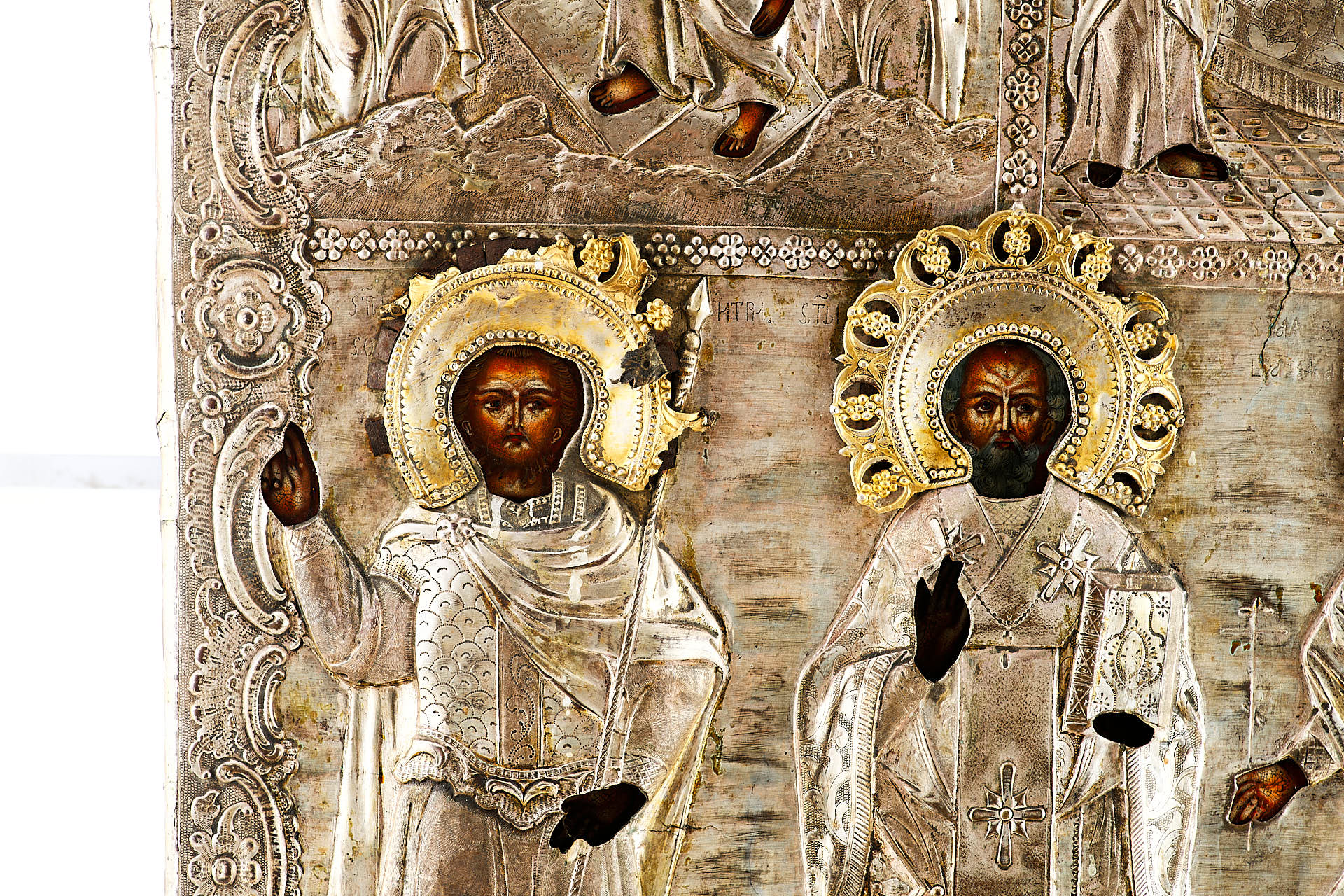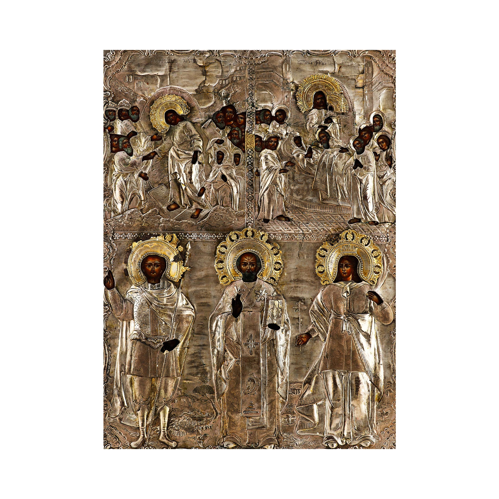 На представленной иконе в богатом серебряном окладе изображены три ключевые сцены и три святых, составивших трёхчастную композицию. В верхнем регистре расположены евангельские сюжеты — «Воскресение Христово» и «Успение Богоматери», а в нижнем — изображения Димитрия Солунского, Николая Чудотворца и святой Екатерины.