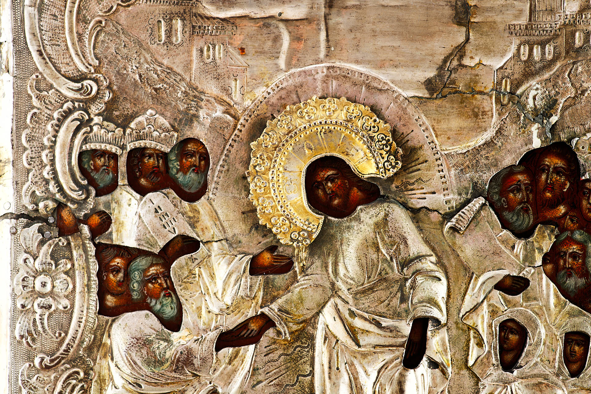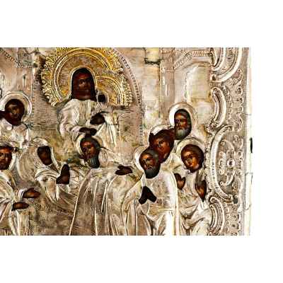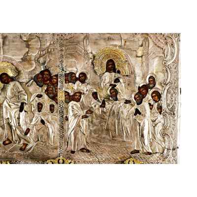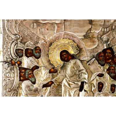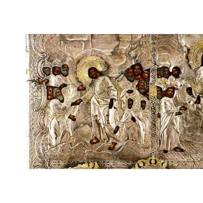 Композиция «Воскресение Христово» представлена в традиционной православной иконографической интерпретации как Сошествие во ад. Христос попирает разрушенные врата ада, выводя Адама и Еву из гробов, что символизирует избавление человечества от смерти. Эта трактовка характерна для русского православного искусства, начиная с XIV века, и сохранялась вплоть до конца XIX столетия.