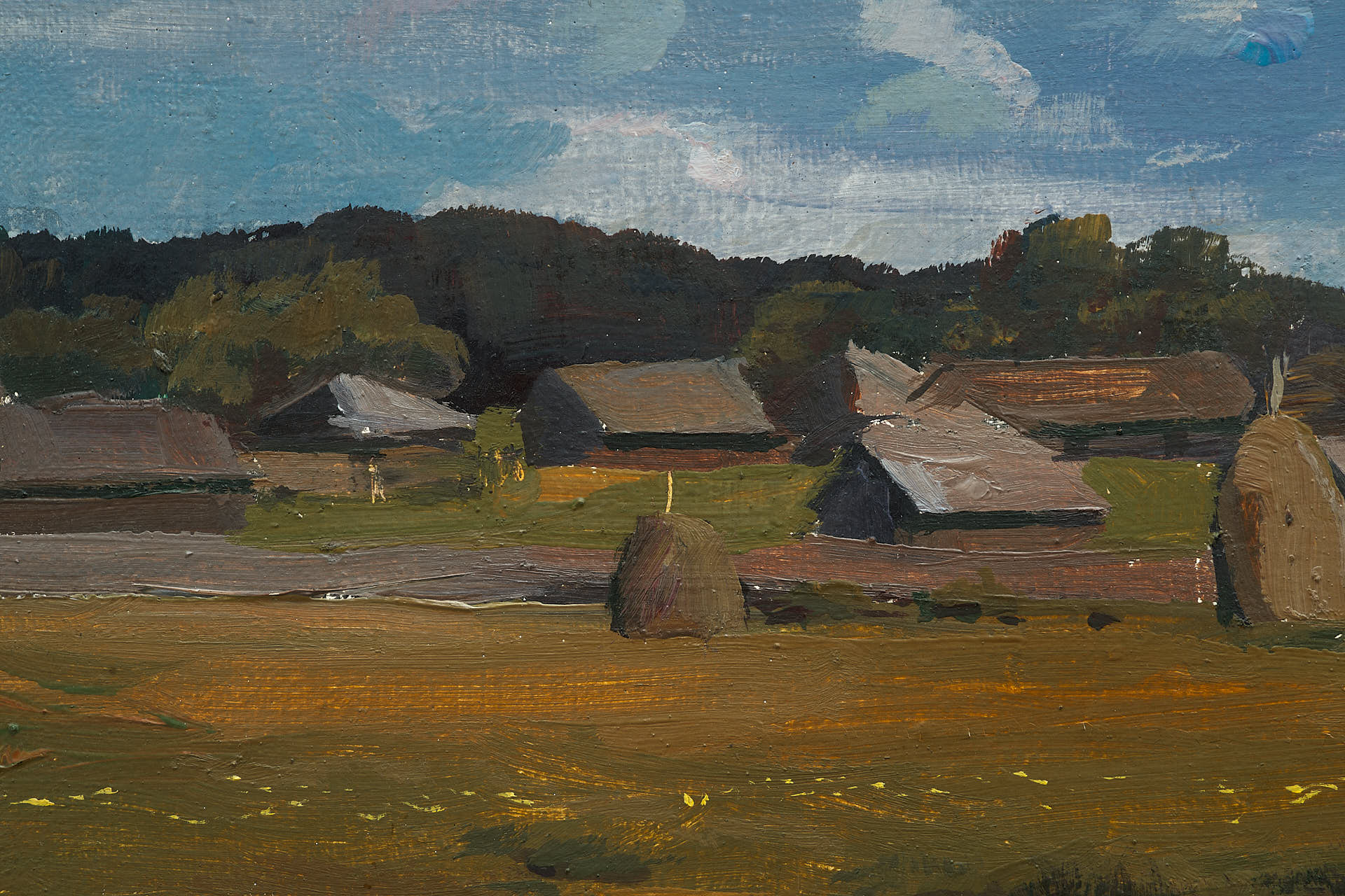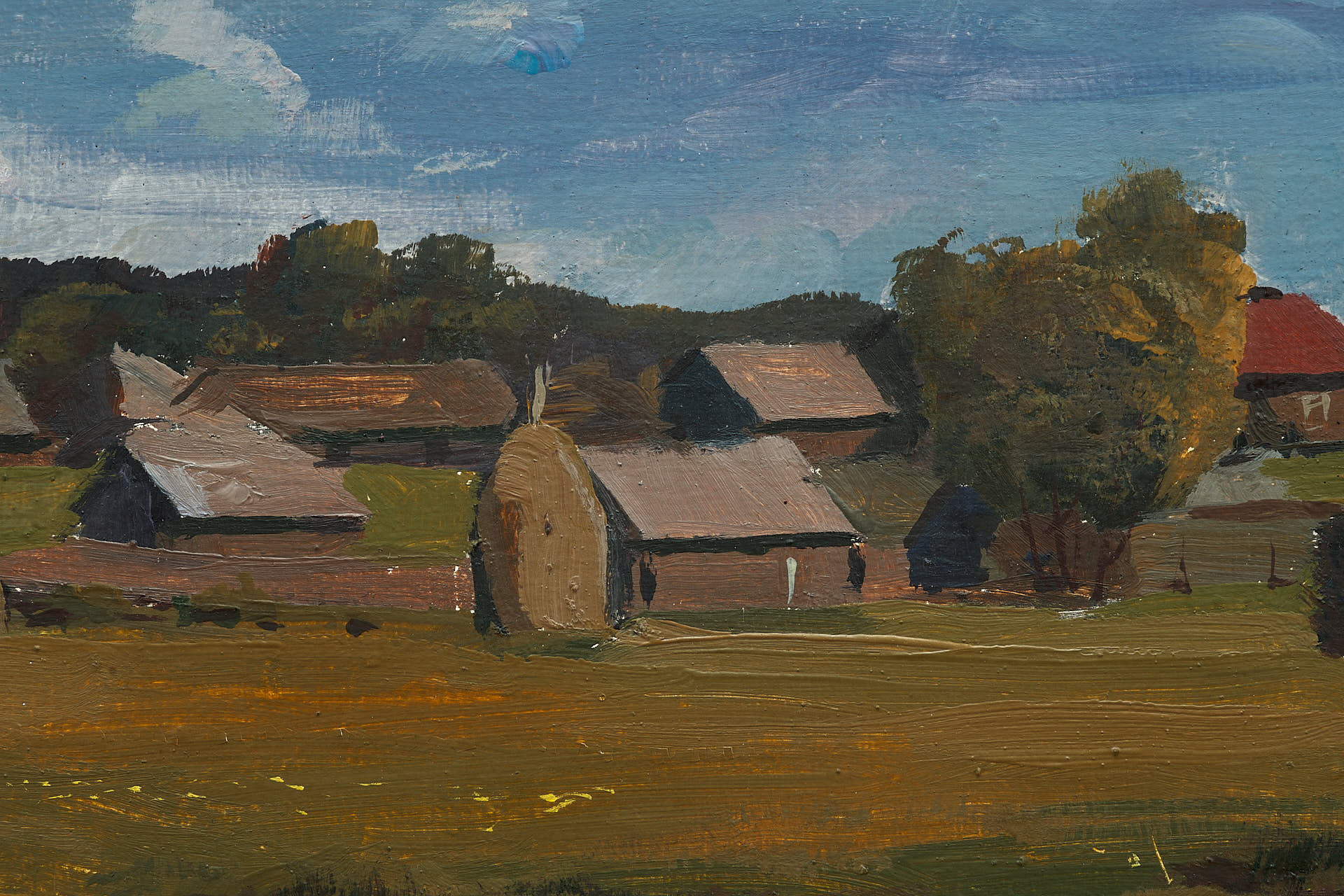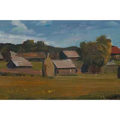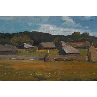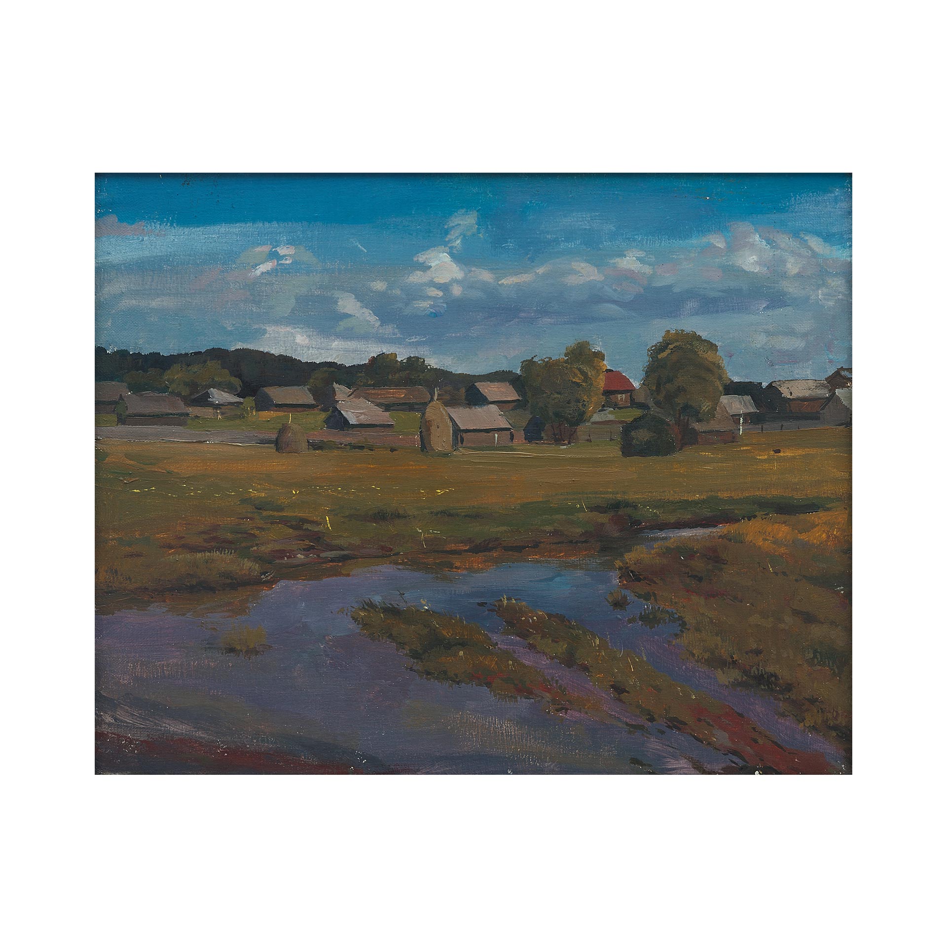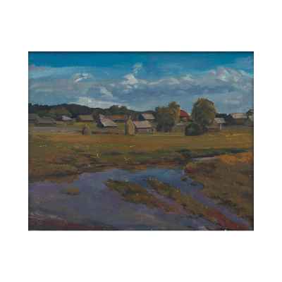 Нартине изображена деревня в летний полдень. На переднем плане небольшая речка, похожая на лужу. В ней отражается ярко- голубое небо с белой цепью облаков. На дальнем плане деревянные домики и хозяйственные строения. Около некоторых домов растут деревья и кусты, рядом с другими стоят стога сена. На горизонте темно-зеленой полосой тянется лес.