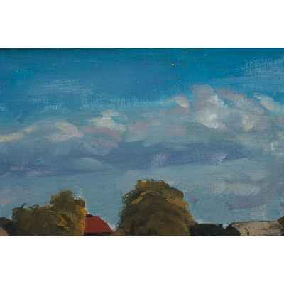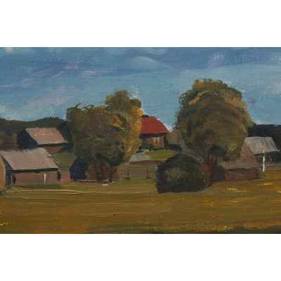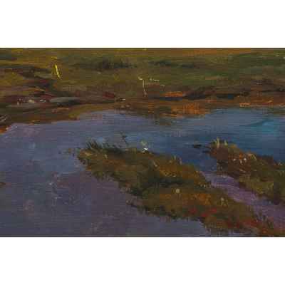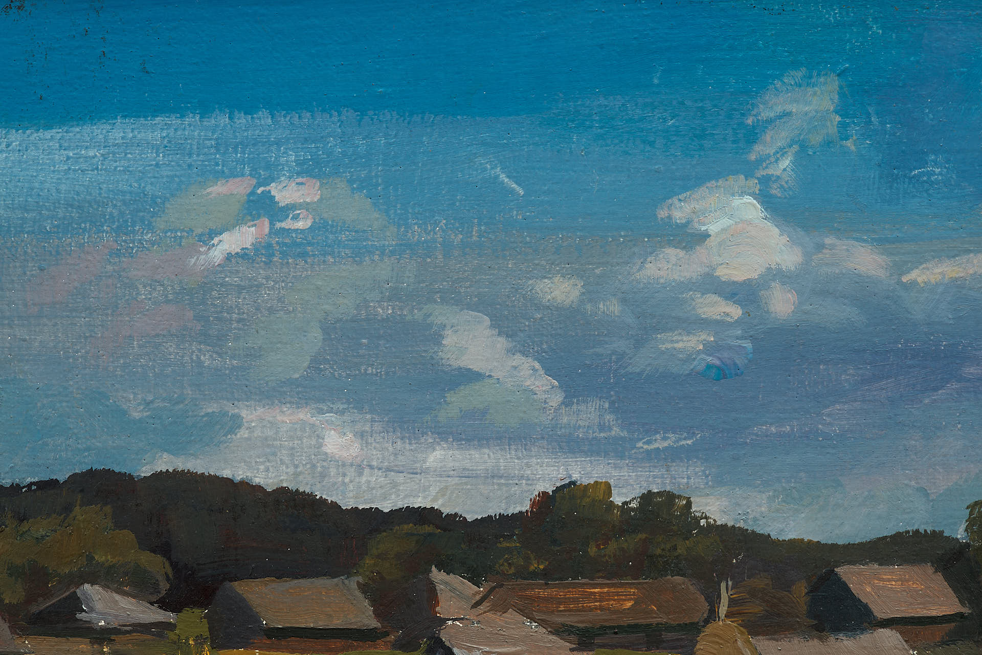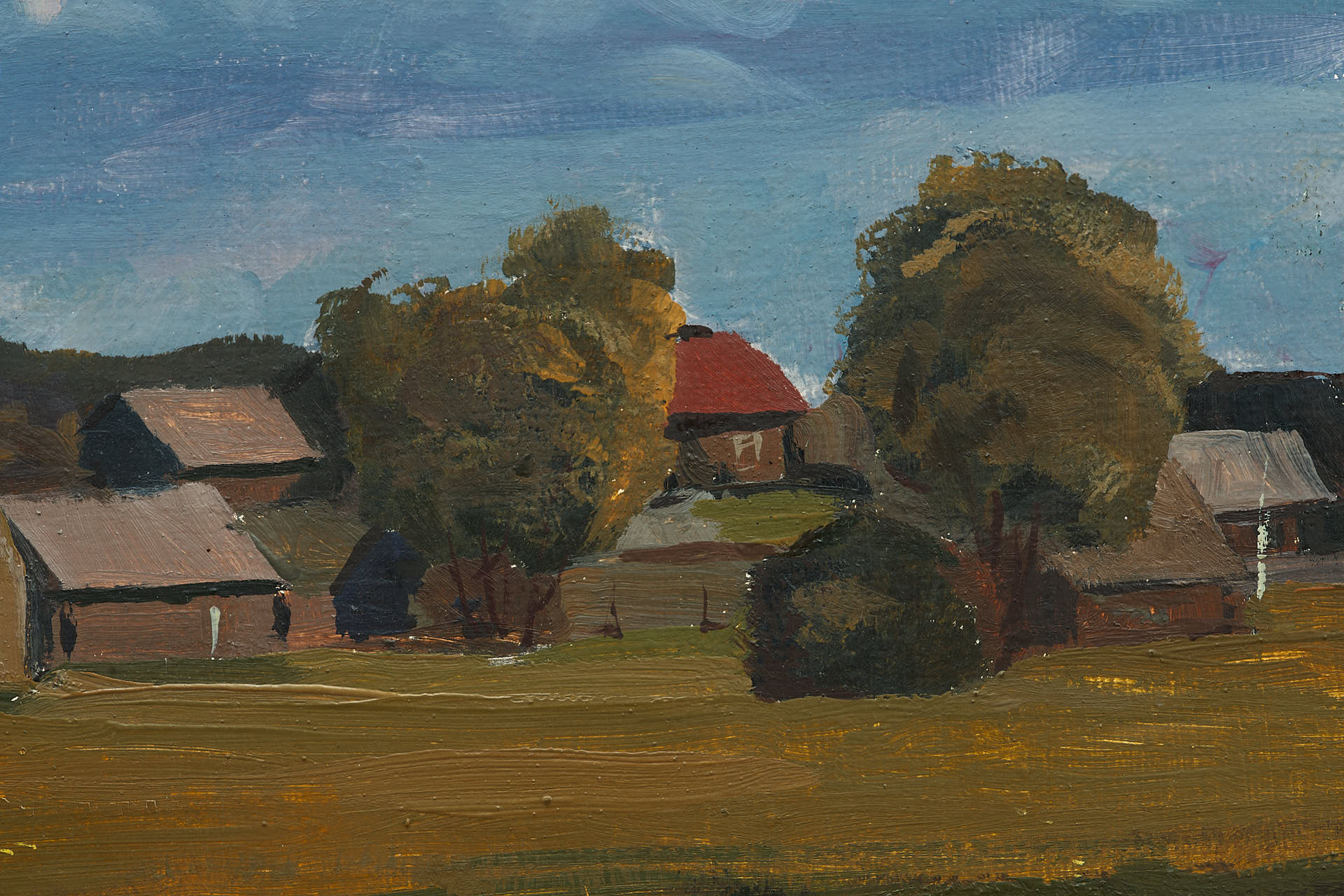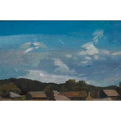 Нартине изображена деревня в летний полдень. На переднем плане небольшая речка, похожая на лужу. В ней отражается ярко- голубое небо с белой цепью облаков. На дальнем плане деревянные домики и хозяйственные строения. Около некоторых домов растут деревья и кусты, рядом с другими стоят стога сена. На горизонте темно-зеленой полосой тянется лес.