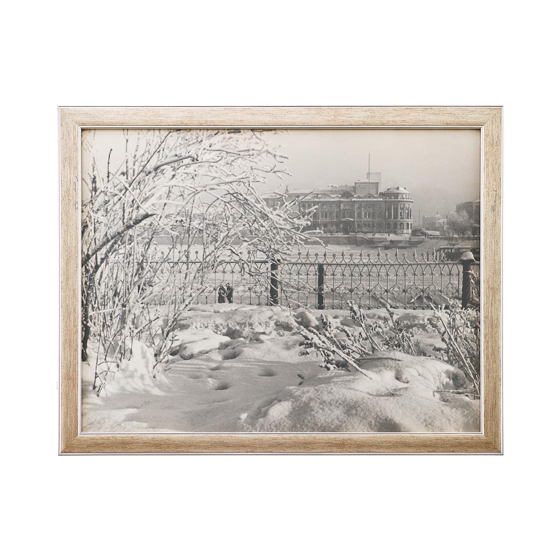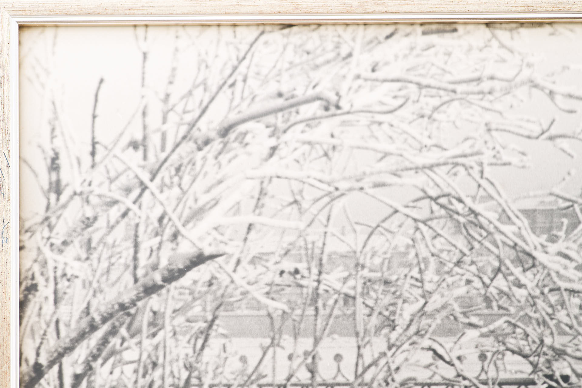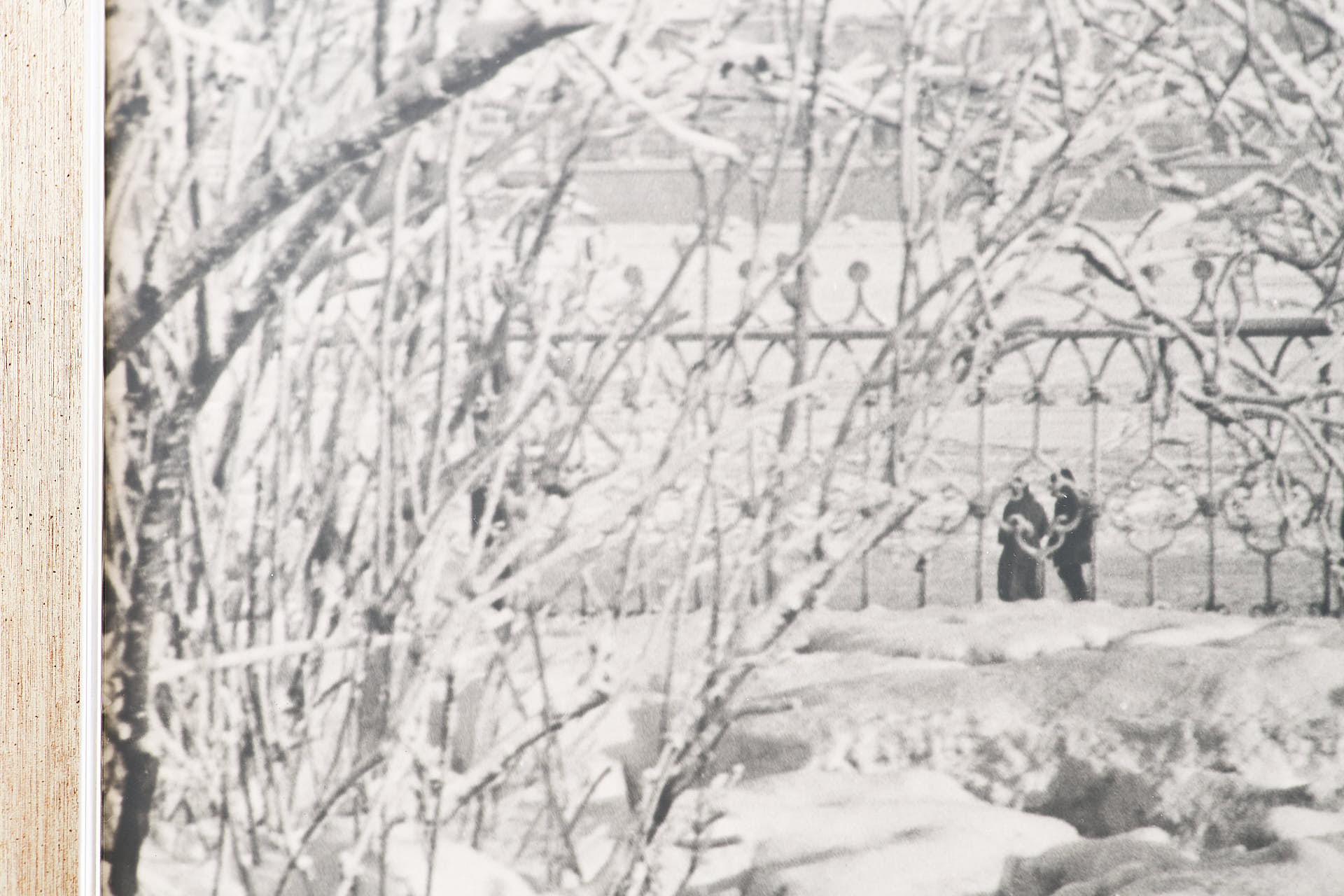 Работа относится к направлению документальной и художественной фотографии межвоенного периода, когда фоторепортаж активно развивался как форма искусства и фиксации городской среды. В данном случае особое внимание уделено построению композиции: кадрирование через снежные ветви создаёт эффект "живого окна", подчёркивая глубину пространства и усиливая атмосферу.