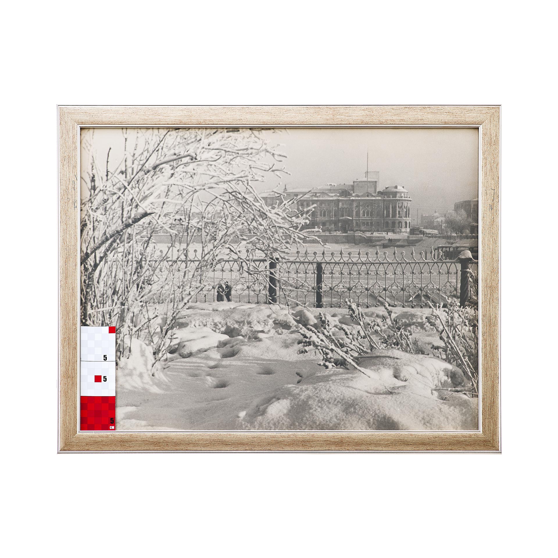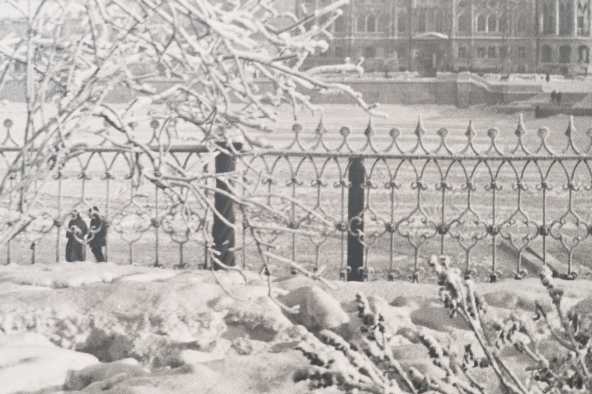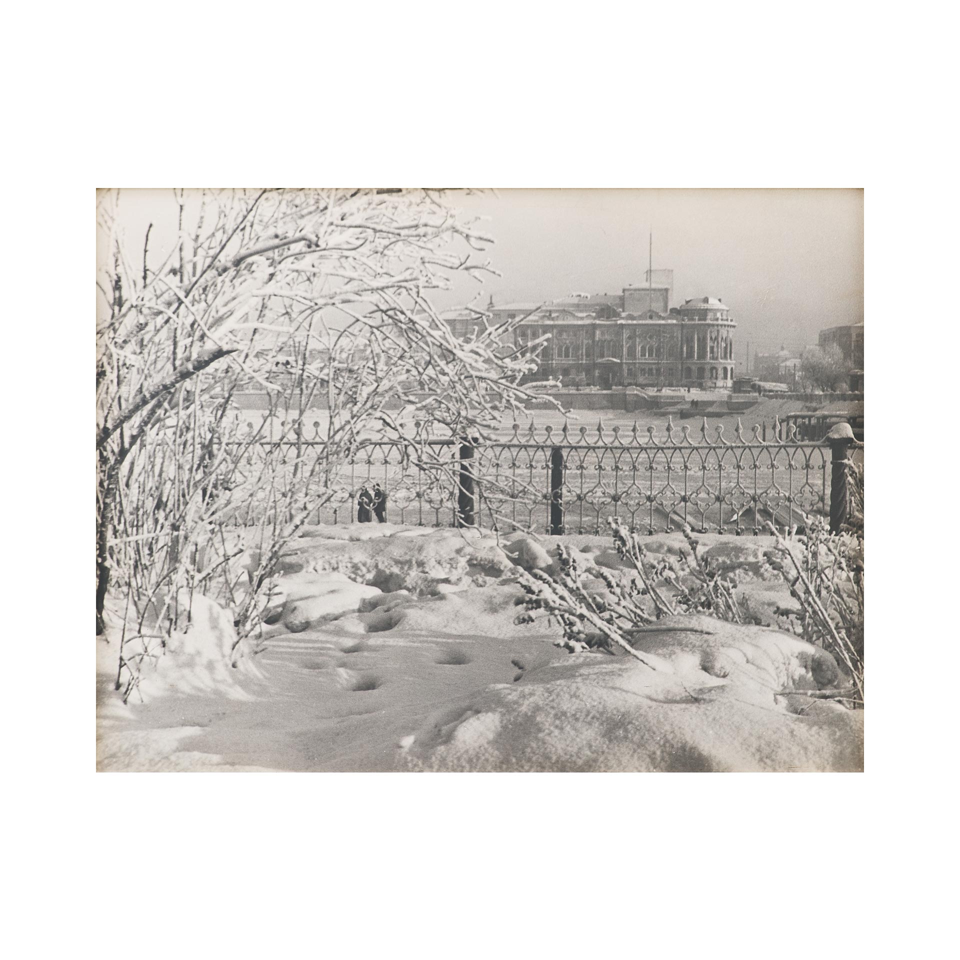На фотографии запечатлён зимний пейзаж Свердловска (ныне Екатеринбурга) 1930-х годов с видом на городской пруд. Снимок выполнен в чёрно-белой гамме и передаёт атмосферу морозного утра: сугробы, покрытые инеем кустарники и ограда на переднем плане создают ощущение глубокой зимы. На заднем плане виднеется здание с характерной архитектурой конца XIX — начала XX века, вероятно, административного или общественного назначения.