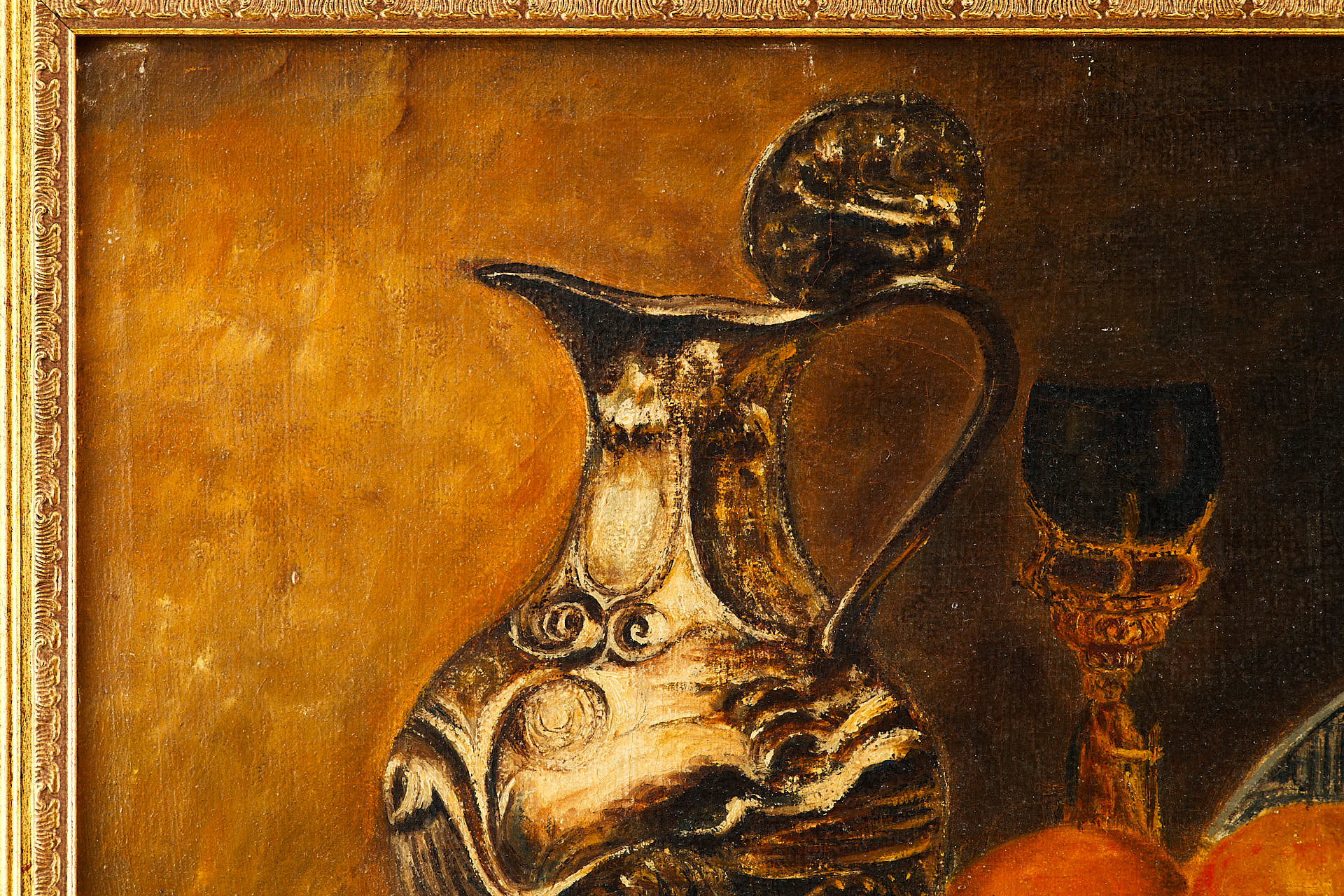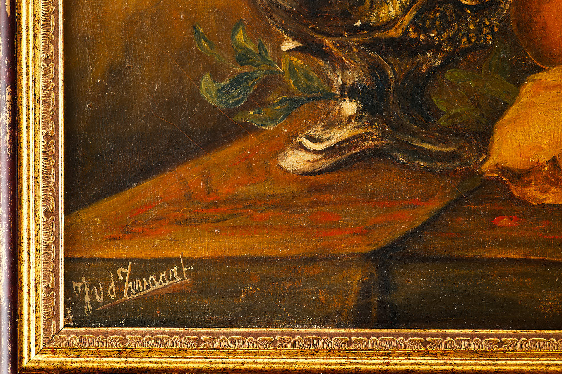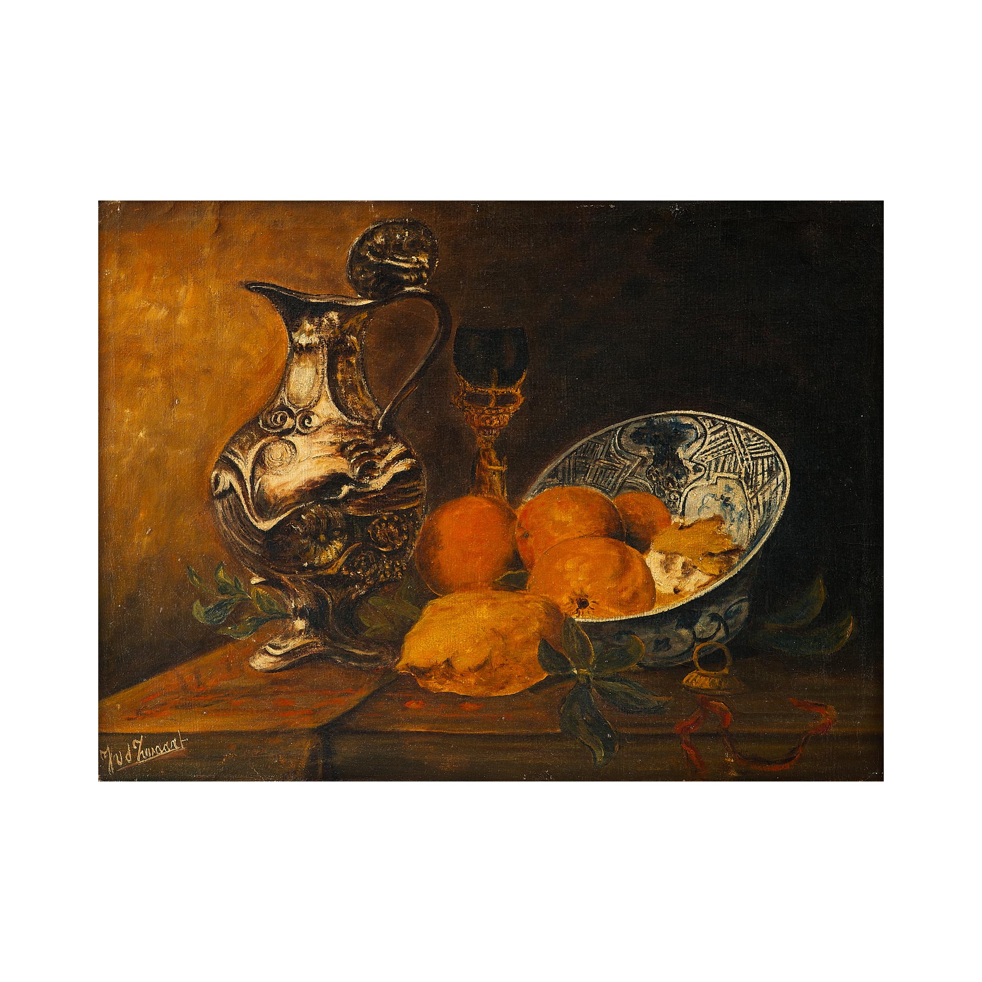 На картине изображён тщательно выстроенный натюрморт, представляющий собой сцену на краю деревянного стола. Поверх небрежно наброшенной белой скатерти располагаются предметы повседневного быта: глиняный кувшин тёплого коричневого оттенка, старинный подсвечник с обгоревшей свечой, медный поднос и тарелка с фруктами — яблоками, грушами, виноградом и гранатом. Композицию дополняют спичечный коробок и нож, рукоять которого выглядывает из-под складок ткани. Темный фон подчёркивает насыщенность предметов и усиливает эффект освещённости.