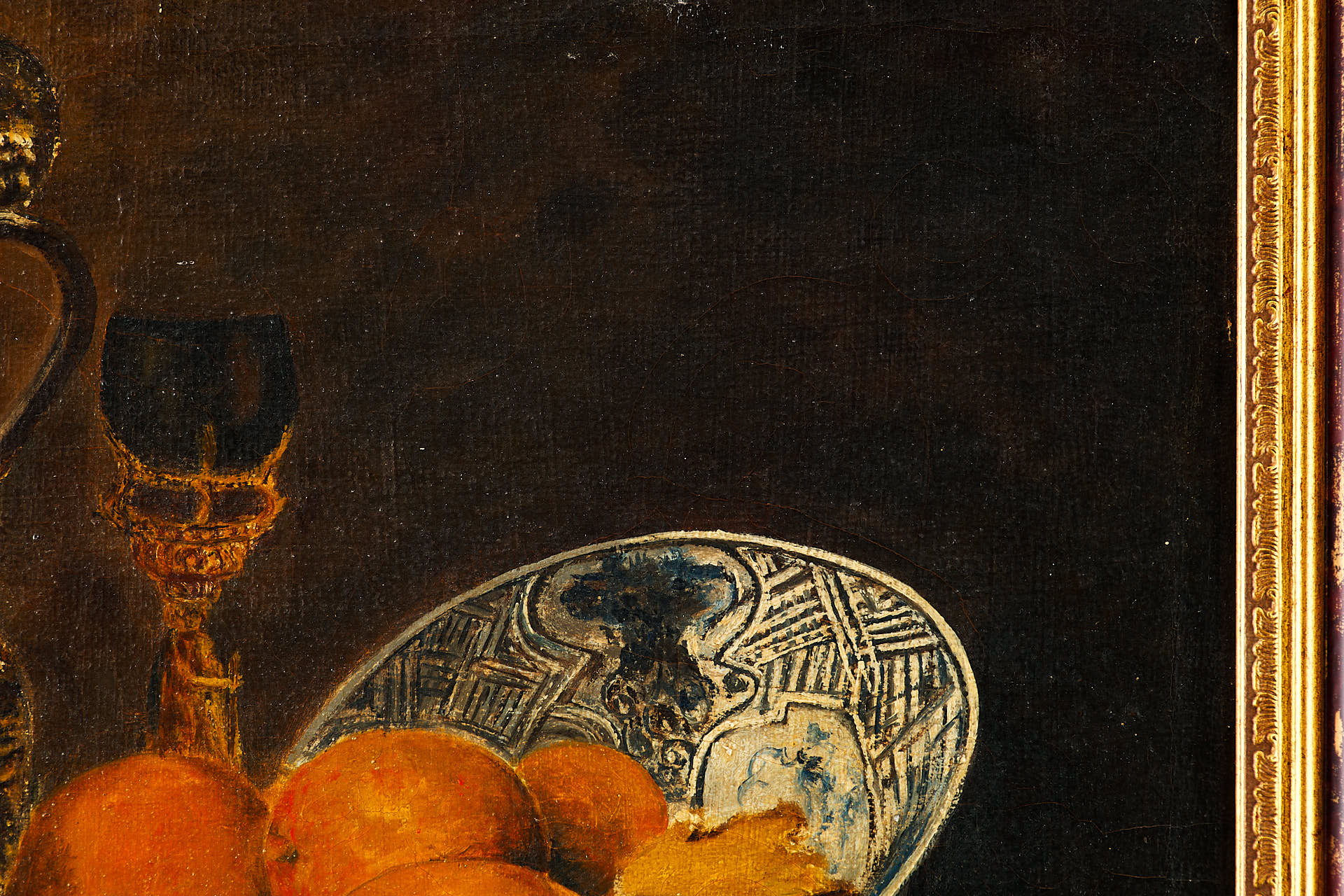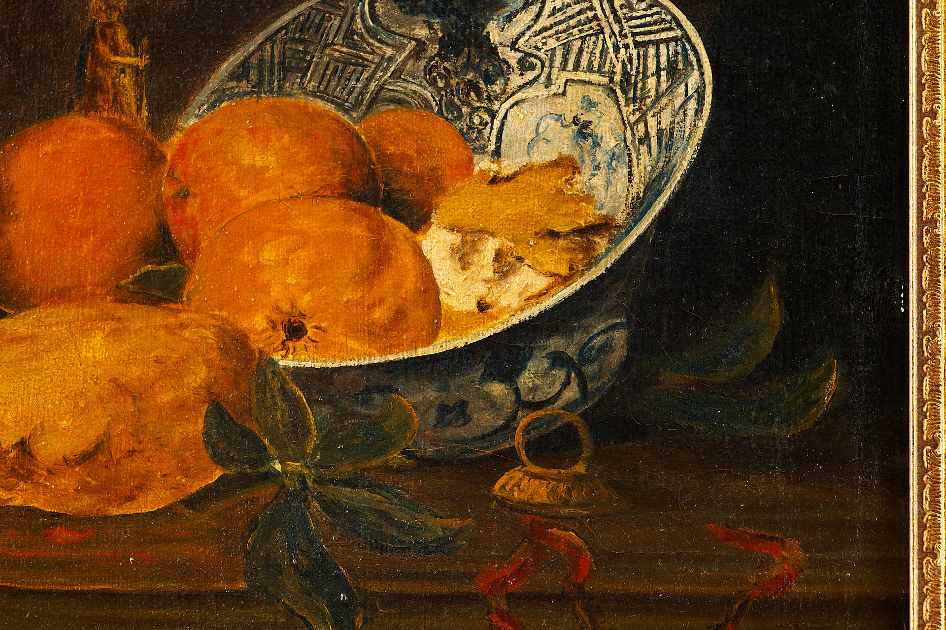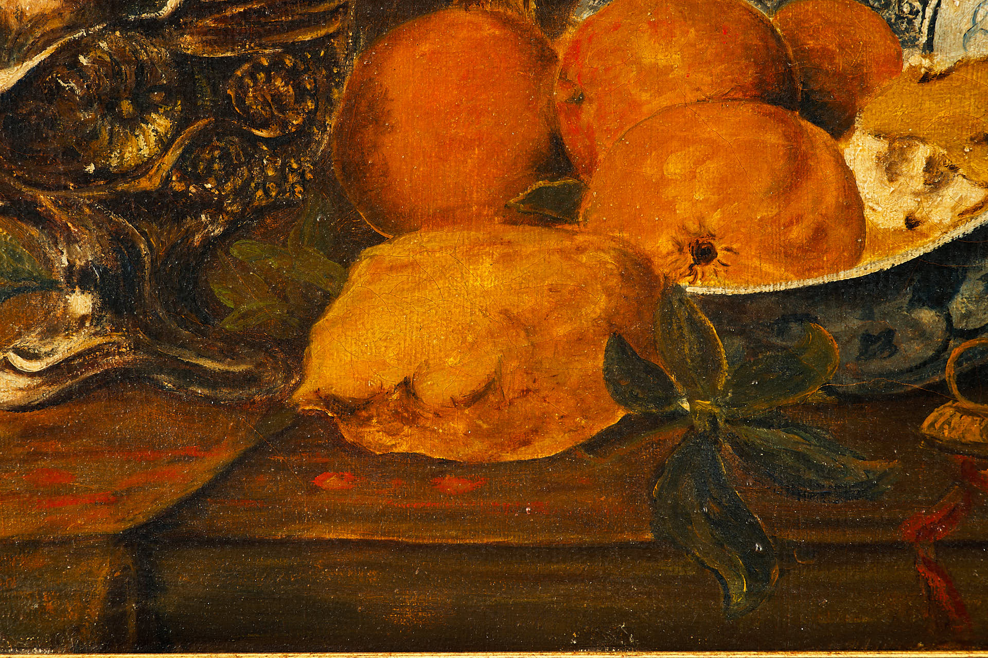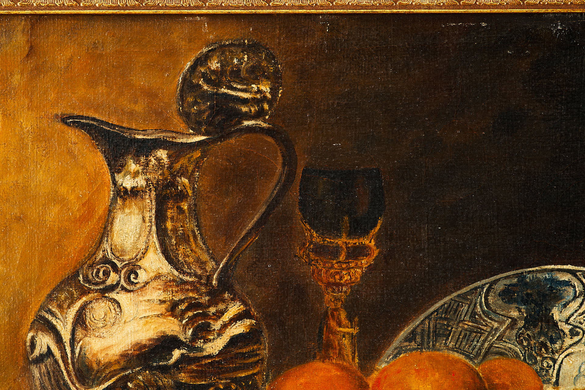 На картине изображён тщательно выстроенный натюрморт, представляющий собой сцену на краю деревянного стола. Поверх небрежно наброшенной белой скатерти располагаются предметы повседневного быта: глиняный кувшин тёплого коричневого оттенка, старинный подсвечник с обгоревшей свечой, медный поднос и тарелка с фруктами — яблоками, грушами, виноградом и гранатом. Композицию дополняют спичечный коробок и нож, рукоять которого выглядывает из-под складок ткани. Темный фон подчёркивает насыщенность предметов и усиливает эффект освещённости.