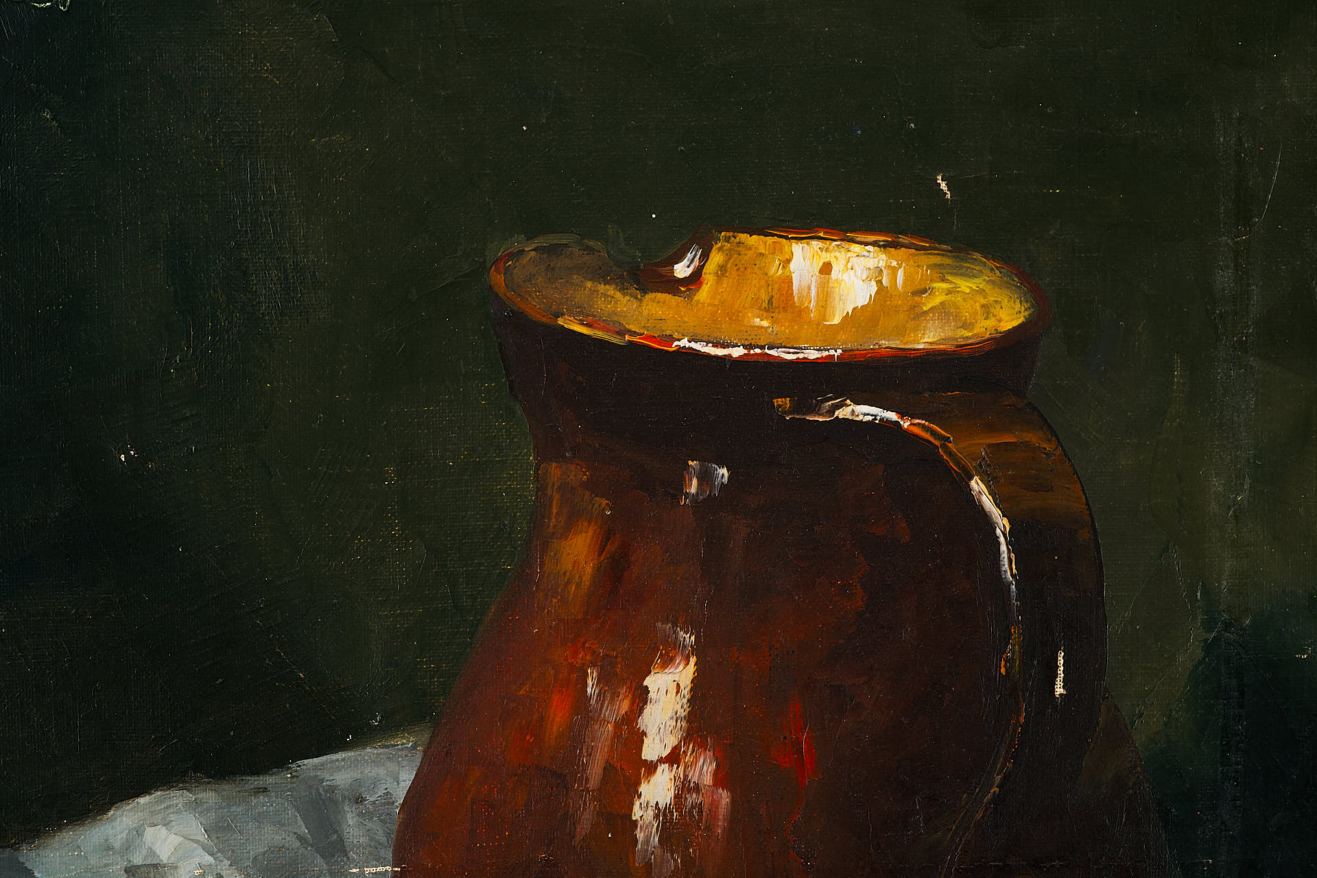 Художник работал в период, когда жанр натюрморта вновь получил популярность как средство самовыражения. В отличие от сюжетной живописи, натюрморт позволял сосредоточиться на форме, текстуре и свето-теневой моделировке, передавая философию художника через обыденные предметы. В данной работе внимание привлекает сдержанная, но тёплая палитра, отсутствие нарочитой декоративности и тонкое чувство баланса, что говорит о профессиональном уровне исполнения.